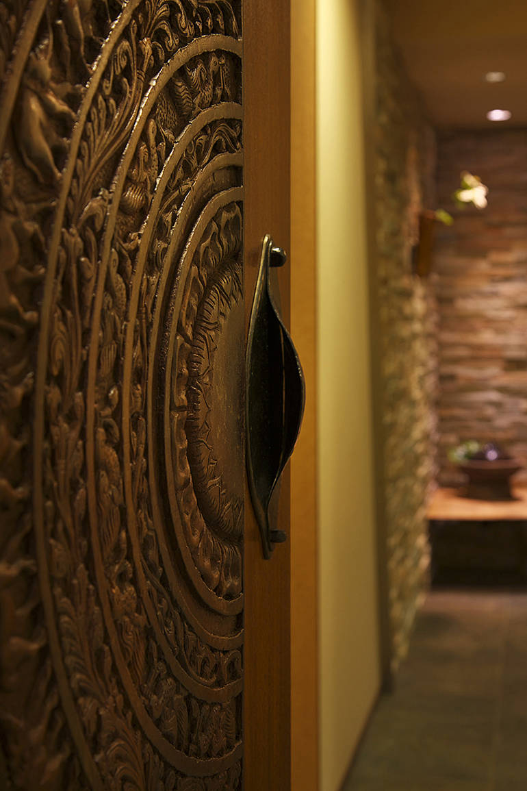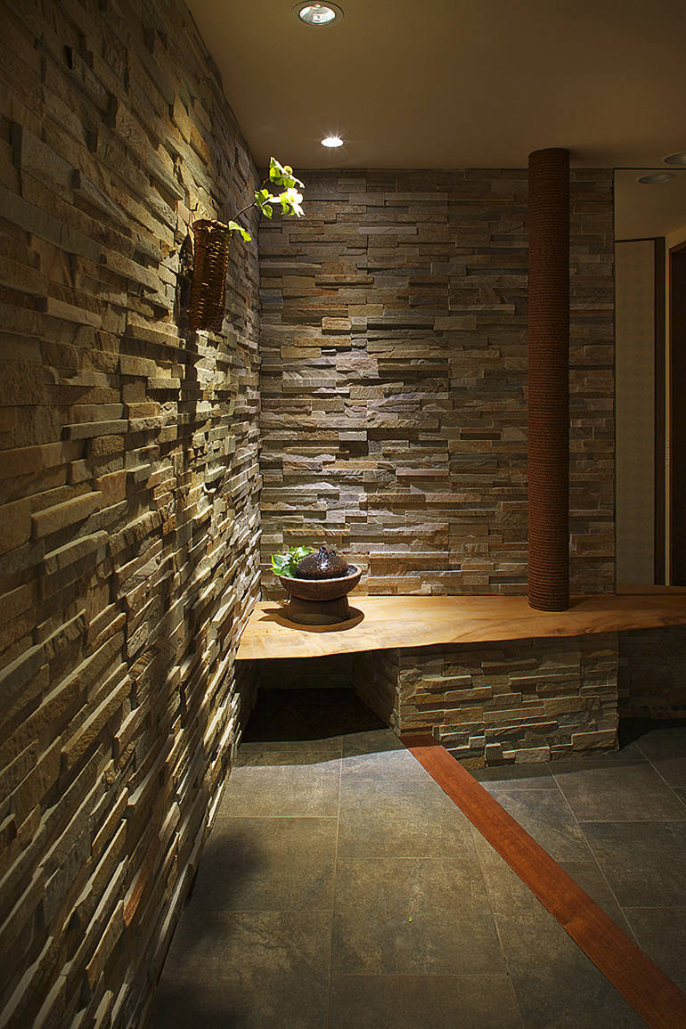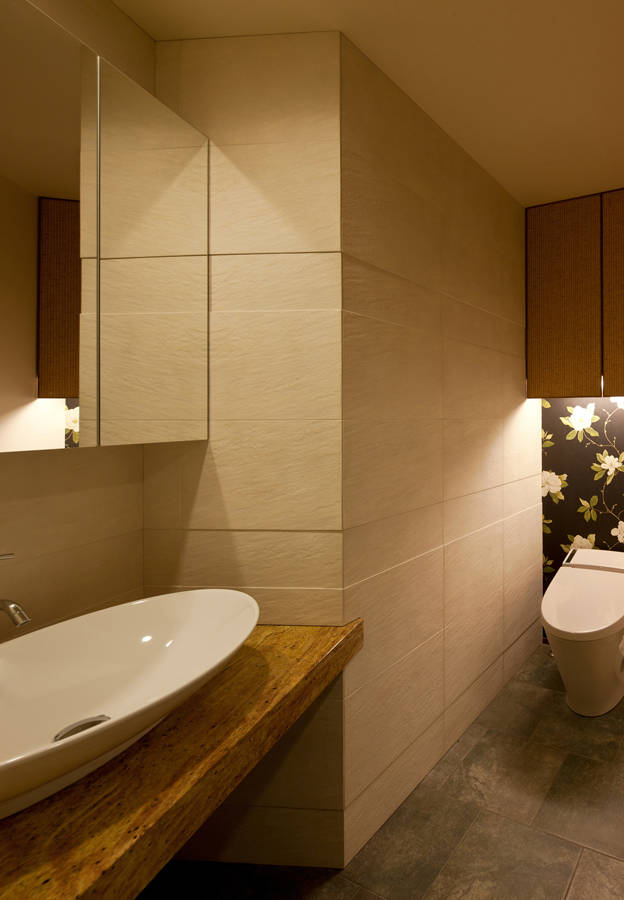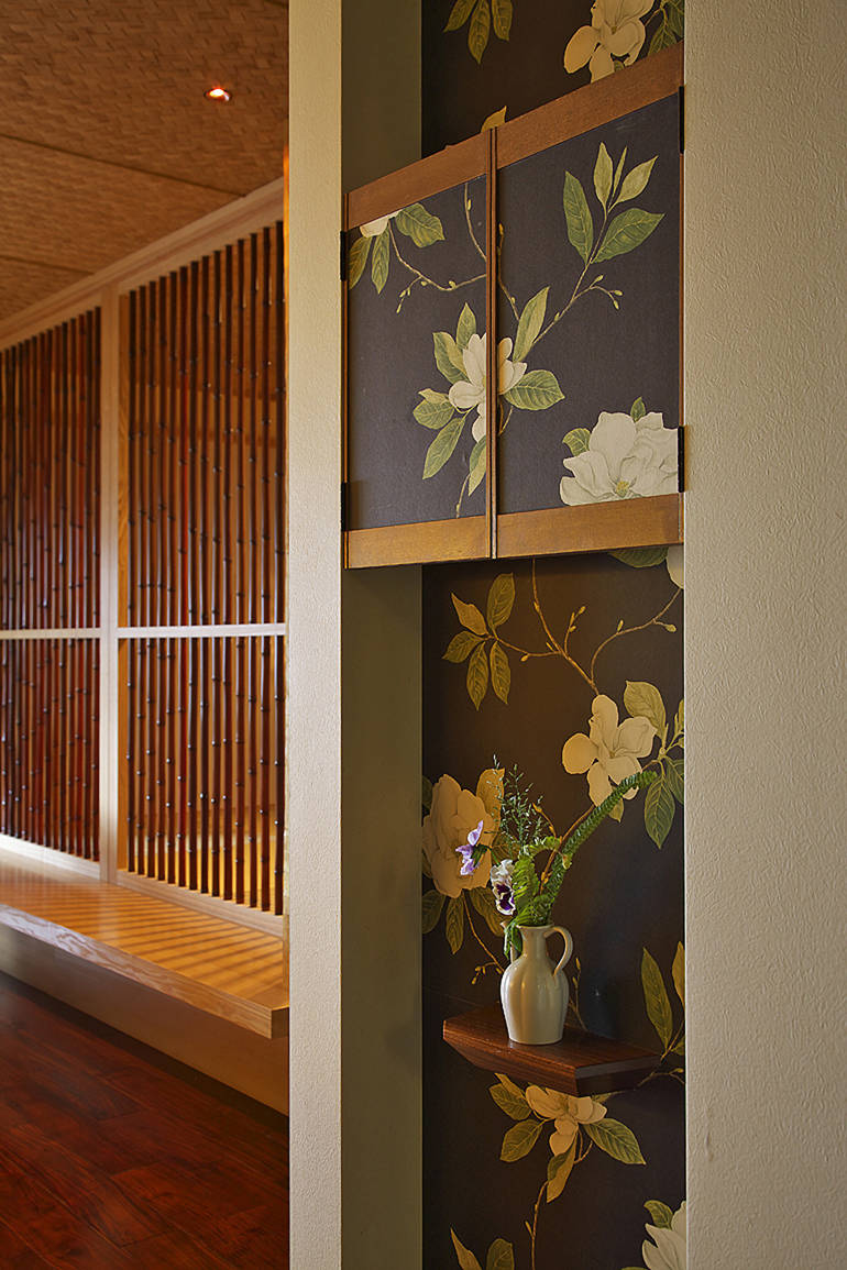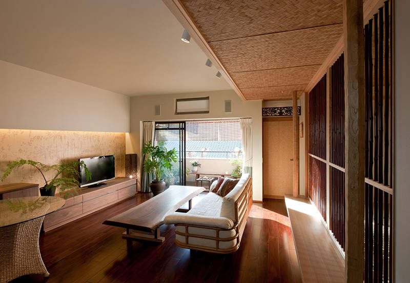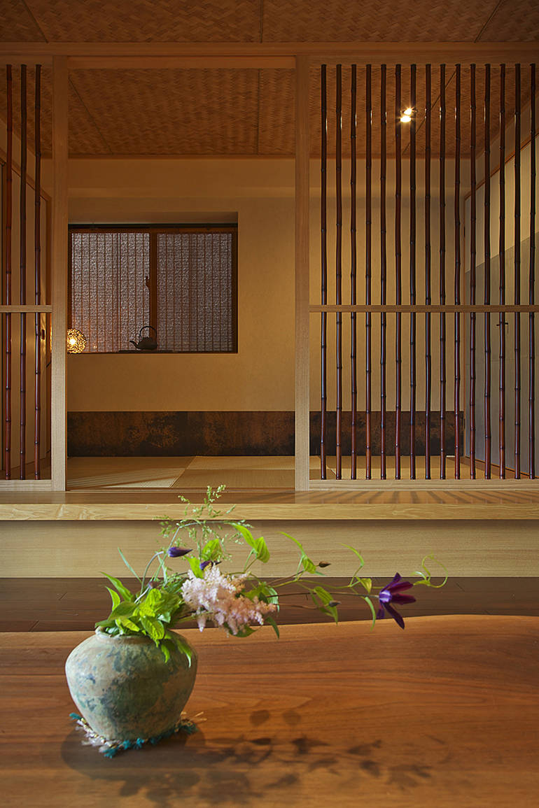南側の窓からは隣接する寺院の大屋根と庭の緑といった京都らしい借景が楽しめるマンション一室の改修計画です。サッシだけを残したスケルトンリフォームを実施しました。住まい手の仕事柄多くの来客があるため、玄関から居間までを、おもてなしの空間としています。カウンセリングルームとなる居間は内外を緑でつなぐことによって、美しい風景を内部に取り込み、無垢の床材や月桃紙、竹格子、網代などの自然素材により、和の要素のやわらかさを堪能できる空間としています。小規模ながらも、手彫りのレリーフや欄間などの細部や素材と色使いのコントラスト等によって癒しのあふれる住まいを実現しています。