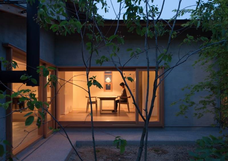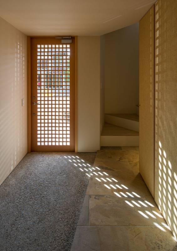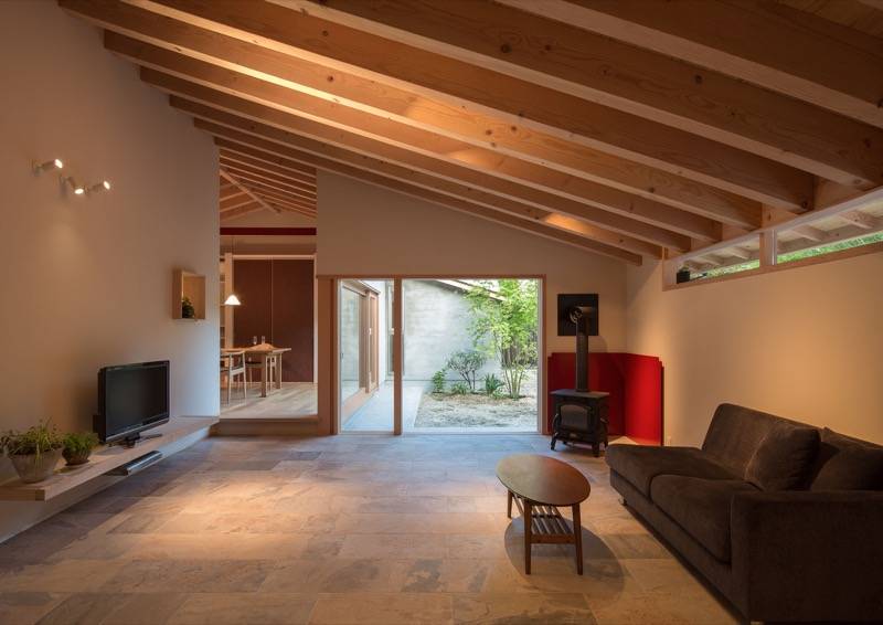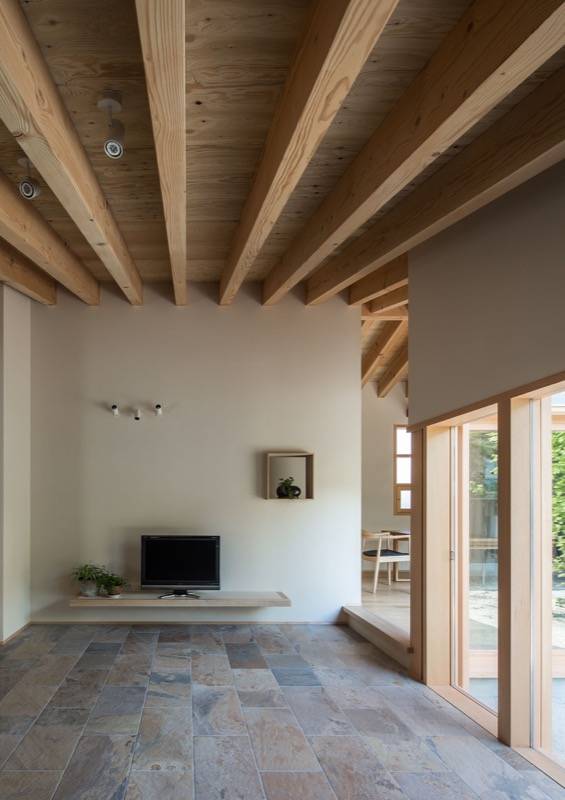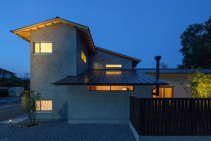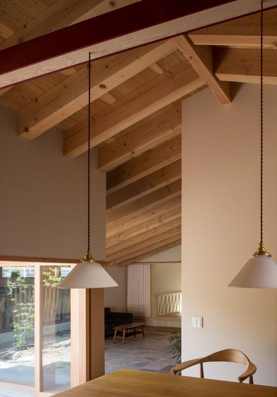 モルタル木ゴテ押えの外壁が印象的なこの住まいは、「あるがまま」といった思想と通じるヨガのインストラクターの資格をもつ奥様の要望をうけ、素材の表現を大切にした家です。化粧梁の連続する天井はゆったりとした内部空間をつくりだします。壁には柔らかな表情の和紙、床には荒々しい表情のタイル、アクセントに朱色の鉄部等、さまざまな素材が融合した安らぎのある空間です。