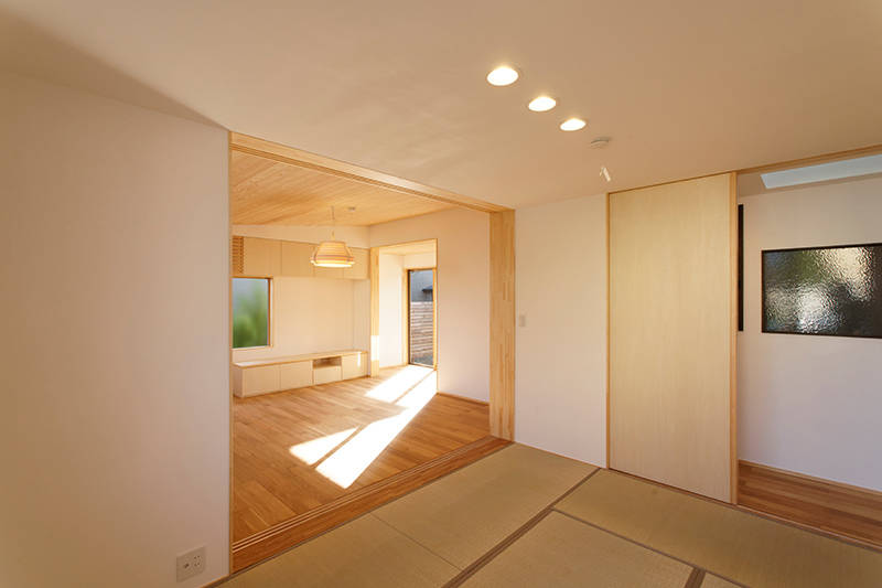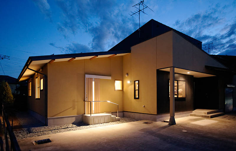 2世帯同居に対応する平屋の増築。 新たにL字型の縁側を設け、既存のリビングと増築した居間をつなぐことで回遊性のあるプランとしました。 落着いた雰囲気の既存部分とは対照的に増築部分は明るい空間となっていて、移動することで明と暗の空間が楽しめます。