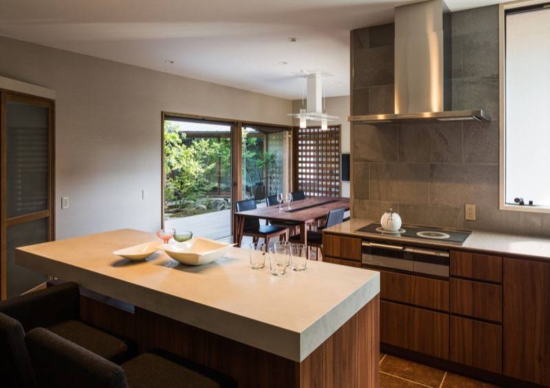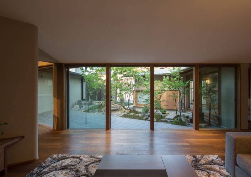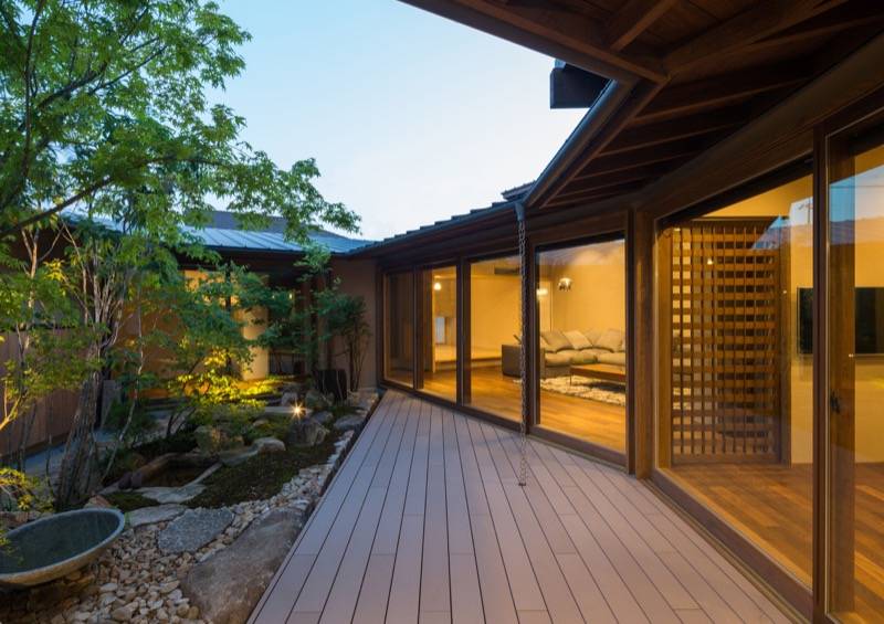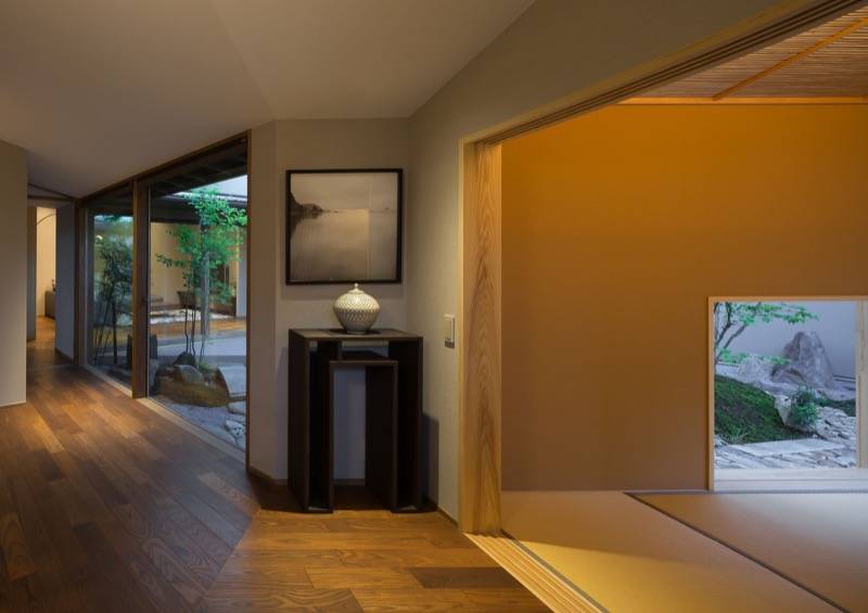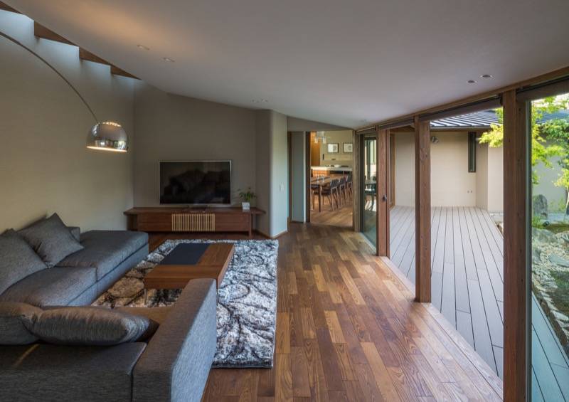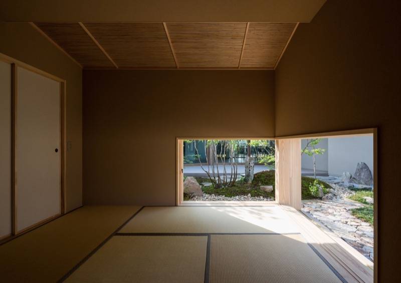 完全に整った形の十五夜ではなく、十三夜のような不完全さを美しいと感じる日本の美意識。十三夜のように少し欠けた形をした中庭のまわりには、玄関ホールと和室、リビングダイニングそして露天風呂が配されています。庭は東向きに開くため、手水鉢や庭の池に映る月を楽しむことができます。木々の生長や季節の移り変わりなど自然と共に住むことを讃える家です。