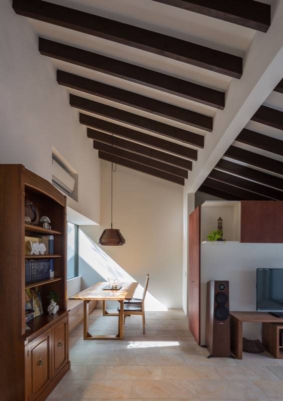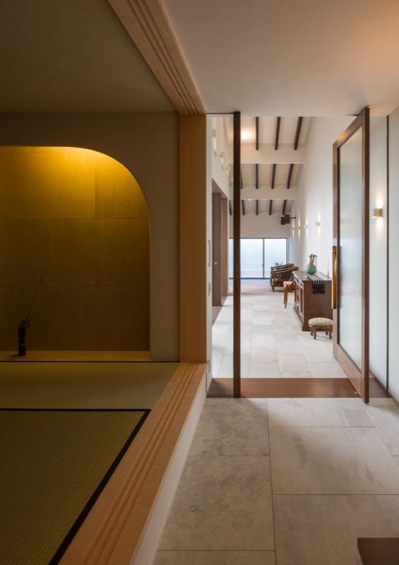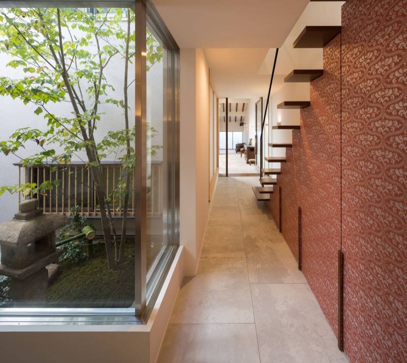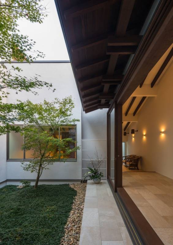 建築制限を厳しく付加される歴史都市京都西陣に立つ住宅です。この地特有の、いわゆるうなぎの寝床状の、間口が狭く奥に広がりのある敷地形状を活かして計画を進めました。施主からの要望は、賑わいのある前面道路や周辺環境から切り離された、静謐な居住空間の創造。前面道路から住宅の中心部に至る紆余曲折した経路に沿って、結界となる坪庭を二重に仕掛けることによって、この問いに応えました。