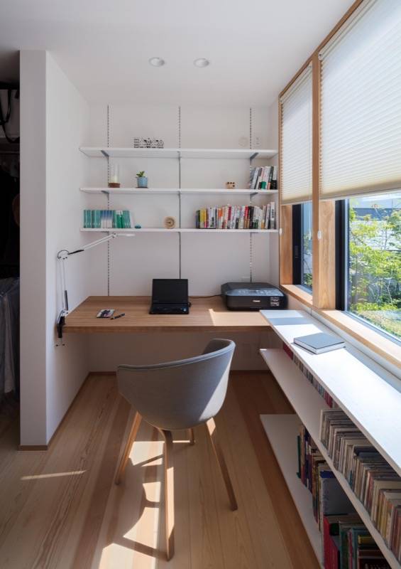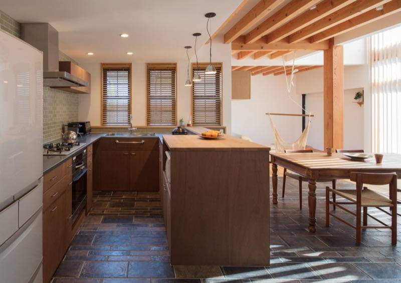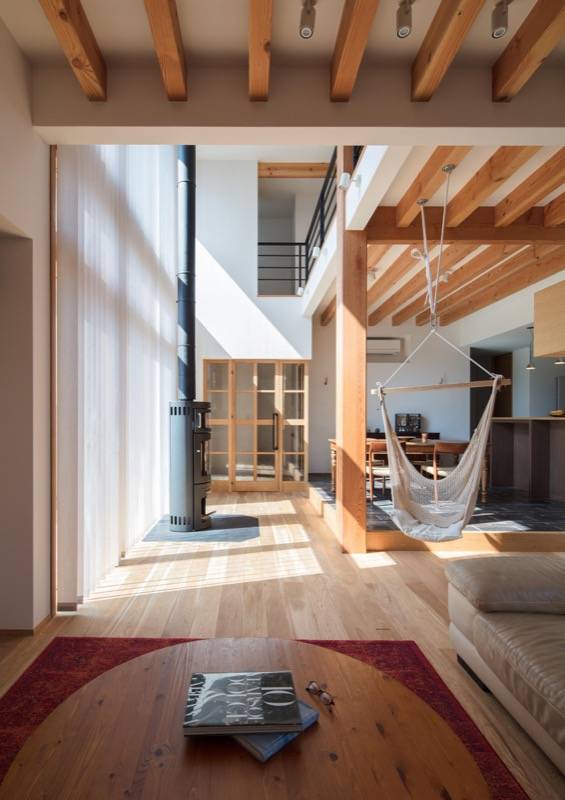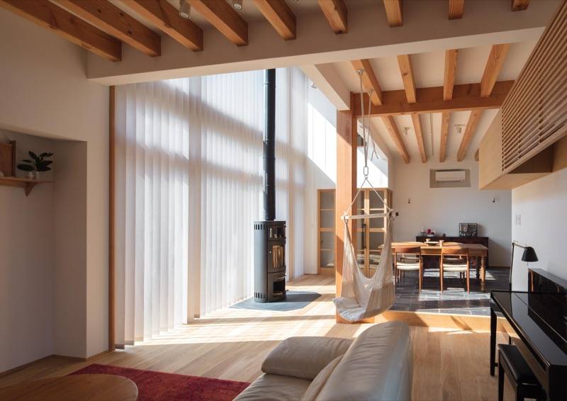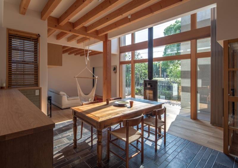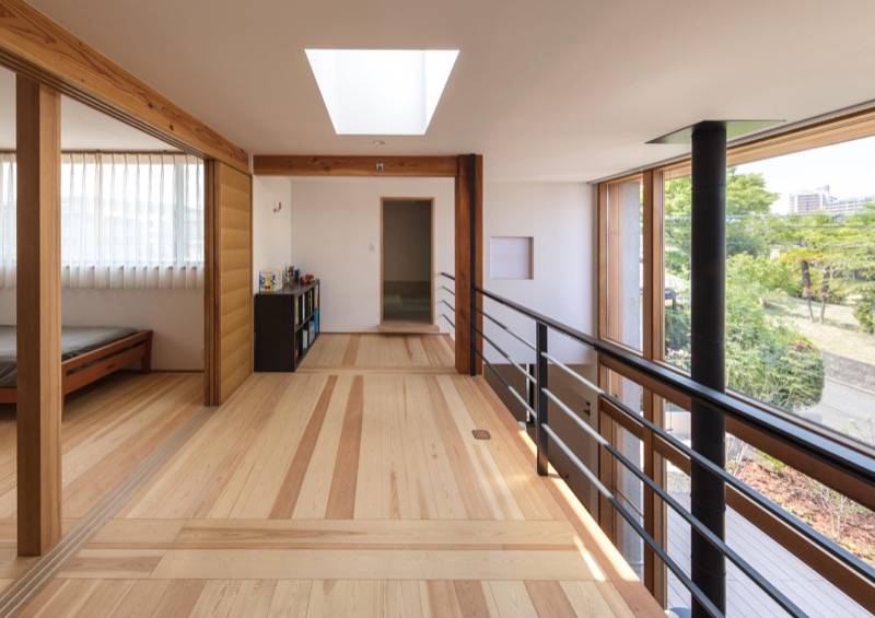 前面道路を挟んで広い公園に面し、その公園に生息する大樹を借景して庭と一体化することを計画の主軸とした住まいです。道路より少し奥まったところに配置した居間の吹抜け部に大開口を計画し、一番奥に配置された台所まで借景が堪能できます。居間と食堂との境界に、公園の大樹と対になるようなケヤキの大黒柱を設けることで、住まいと公園との関係をより緊密につなげています。