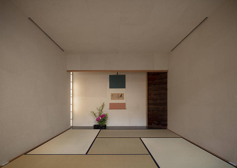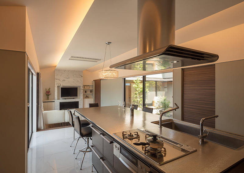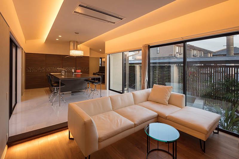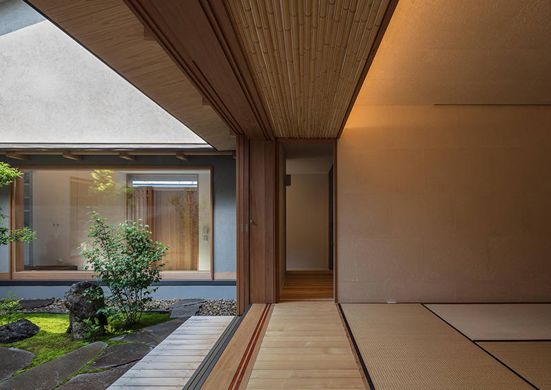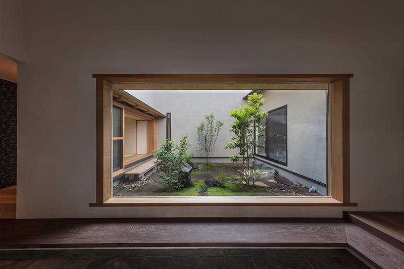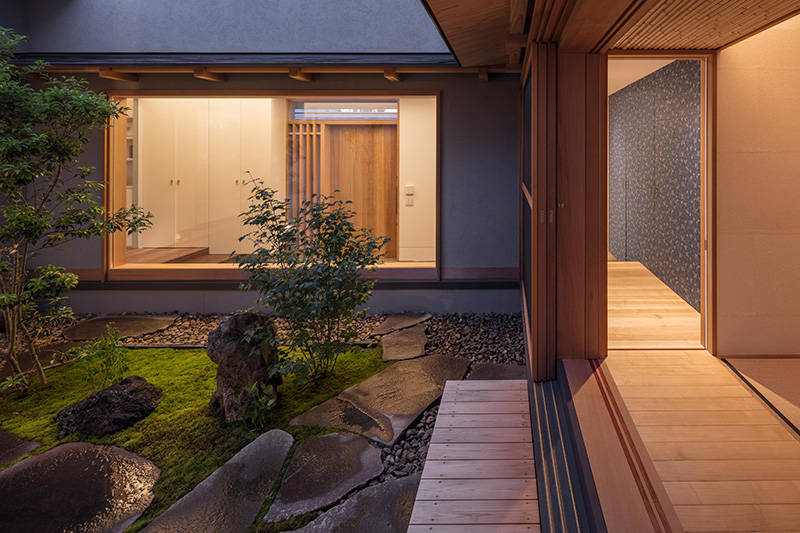 比叡山を借景にゆったりとした大屋根が特徴の住まいです。南と西の道路は交通量が多く、視線と音から隔離された生活空間を確保するために、大きな中庭を持つプランを採用しました。外部からの結界であるアプローチ部分の格子門扉をくぐり、玄関扉をあけると中庭が来客を迎えます。来客用の和室と家族用のリビングダイニングは中庭を挟んで対面し、さらにリビングダイニング奥の東庭まで貫通することで、各々の空間に光と風が行き交います。