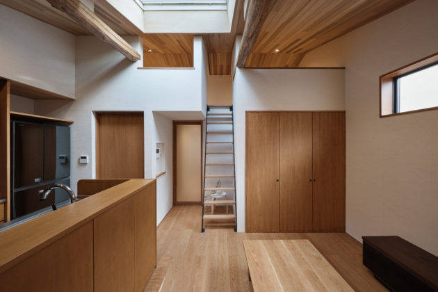 そこで今回プランをするにあたり、平面上だけで考えるのではなく、建物全体の体積・平屋建てという部分に焦点を当てました。建物が広く見えるような仕掛けや、光や風を取り入れる工夫をふんだんに取り入れ、決して陽の光だけではない、家族が空間を照らす力が感じられるような家づくりを目指しました。