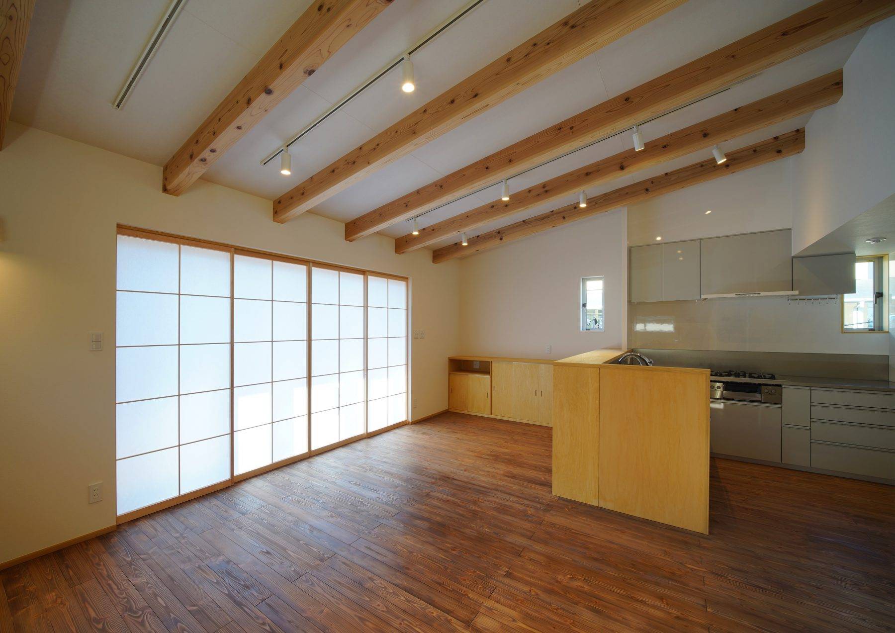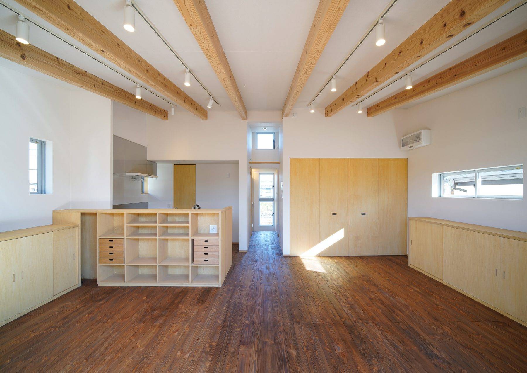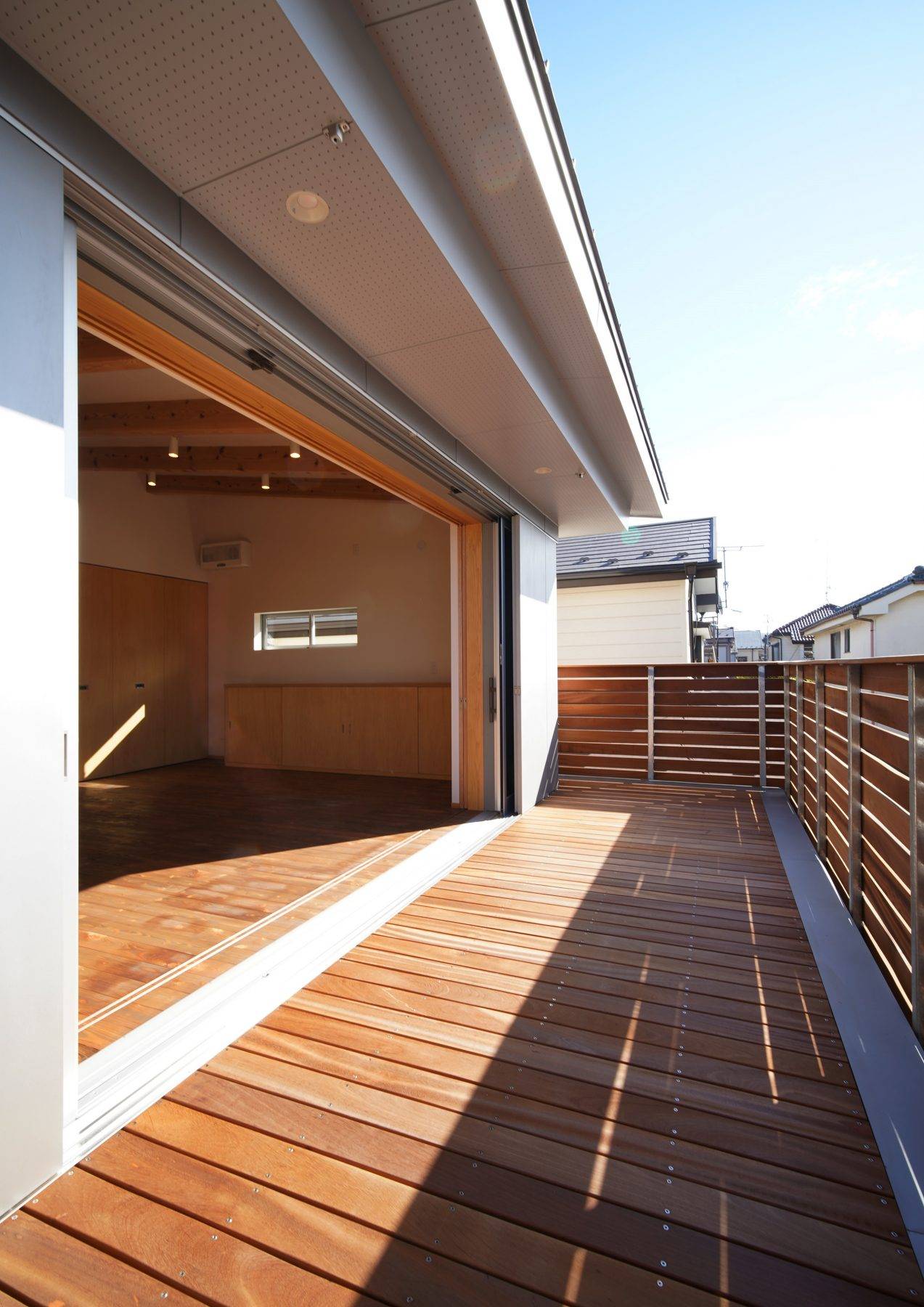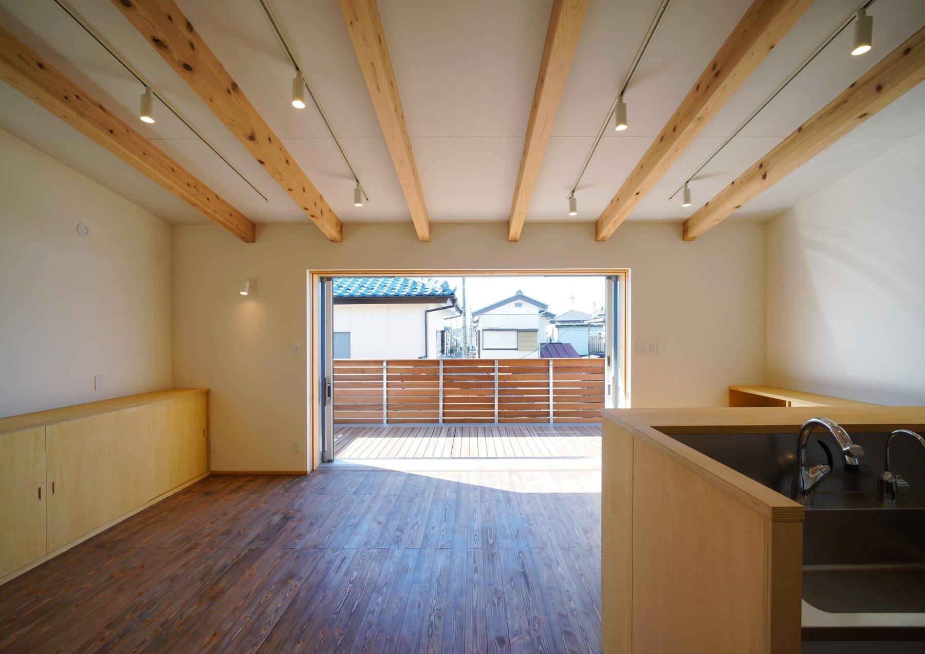 ・機能的であり夫婦二人にとって手が行届くミニマムでシンプルな住空間をつくりました。リビングは家族みんなが集まって食事できることを考慮し10帖の広さと勾配天井による大きな空間を計画しました。バルコニーは7.5帖の広さを計画し、リビングの掃出し窓を全開すれば一体的な利用ができます。プランターによるガーディ ング、家庭菜園も十分可能です。軒も1.2mあるので、雨の日でも窓を開けて雨音を聞きながら暮らせます。