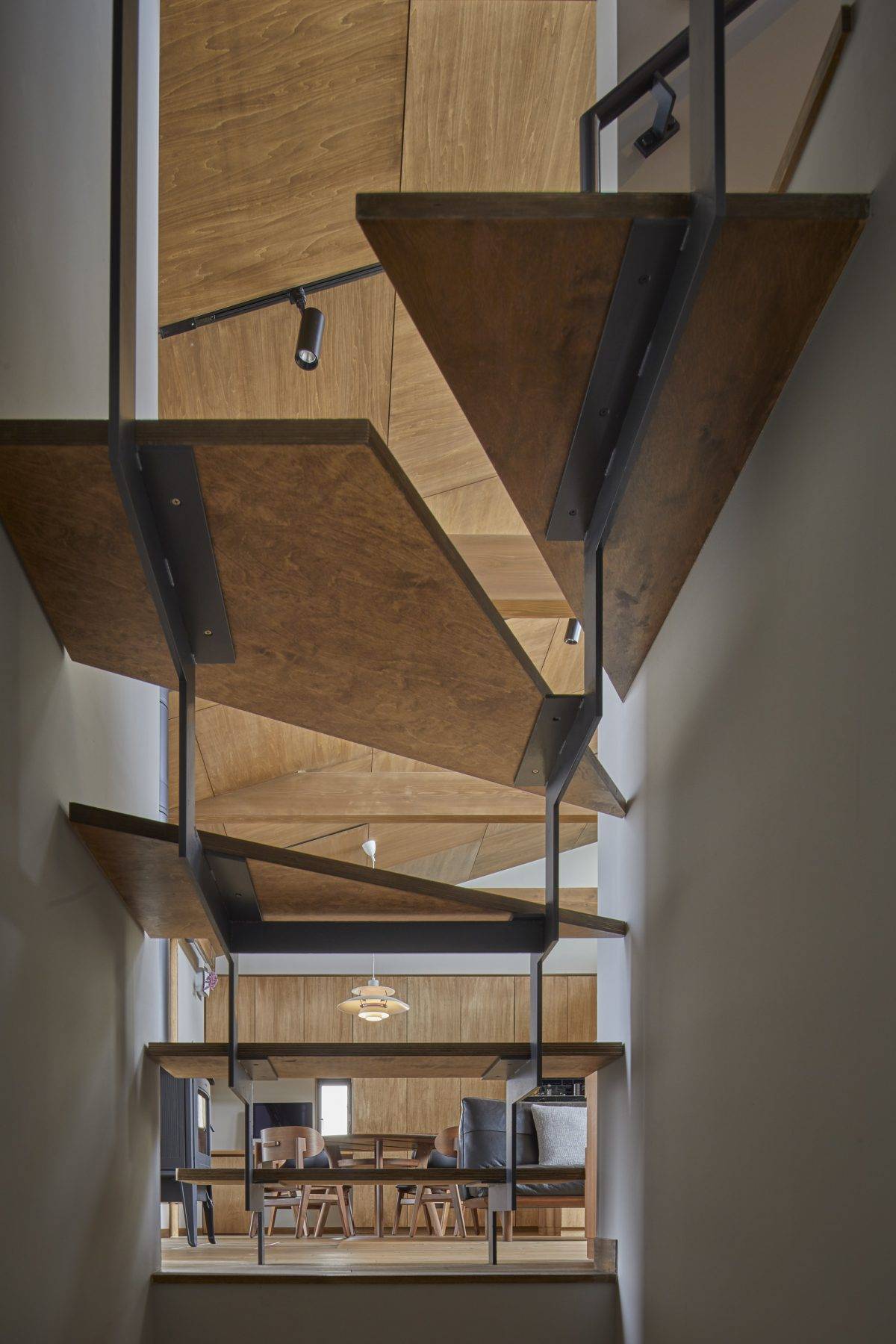 ・計画地はJR線駅から近いこともあり、周囲には低層のアパートが建ち、また南側前面道路もクルマと人通りのが多いことが特徴です。そこで1階のライトコートを中心に繋がるように屋外、半屋外、屋内空間を積み上げました。ライトコート、バルコニー、吹抜け、ハイサイド窓により自然光が入り、風が抜け、開放的で広がりを感じる明るい空間構成を提案しました。