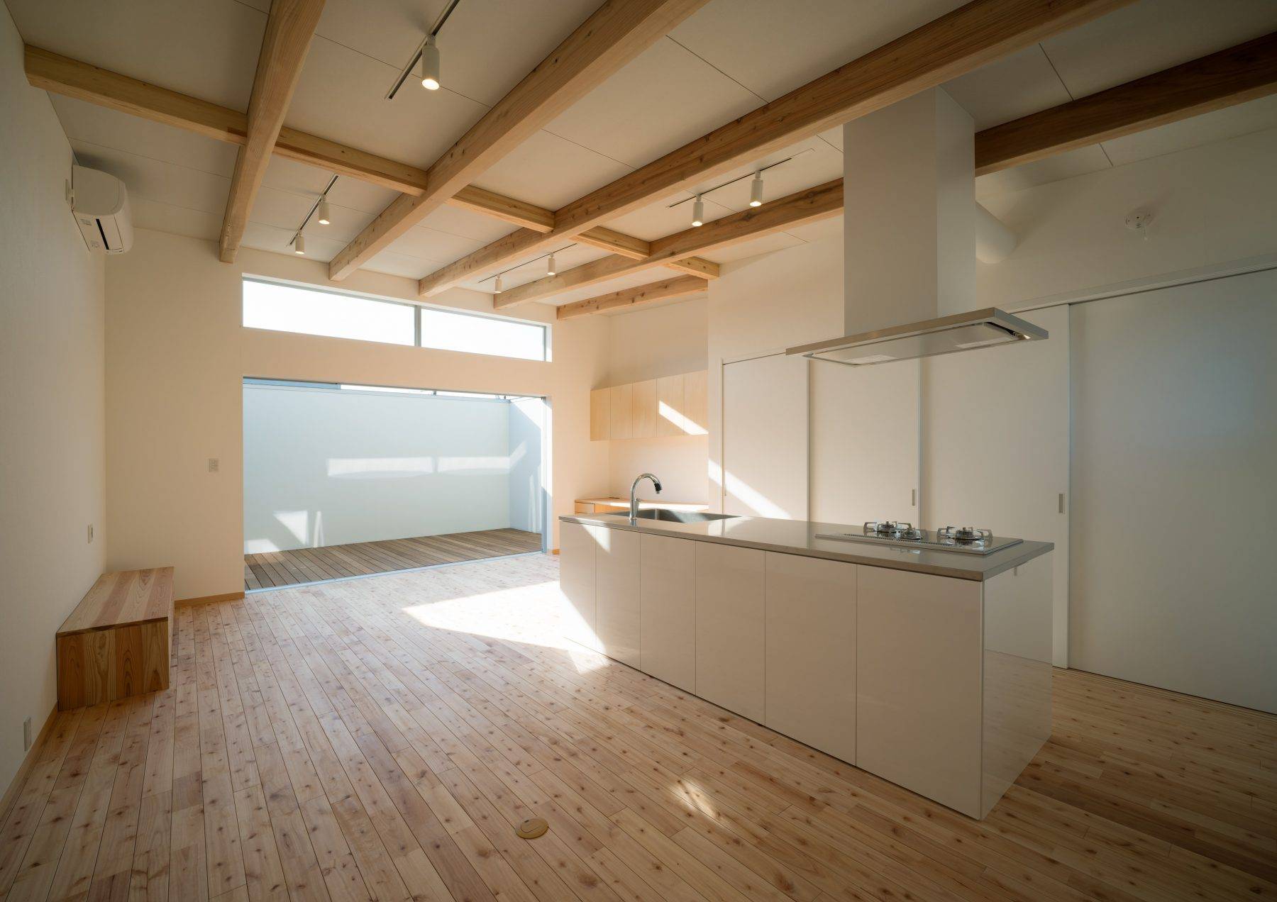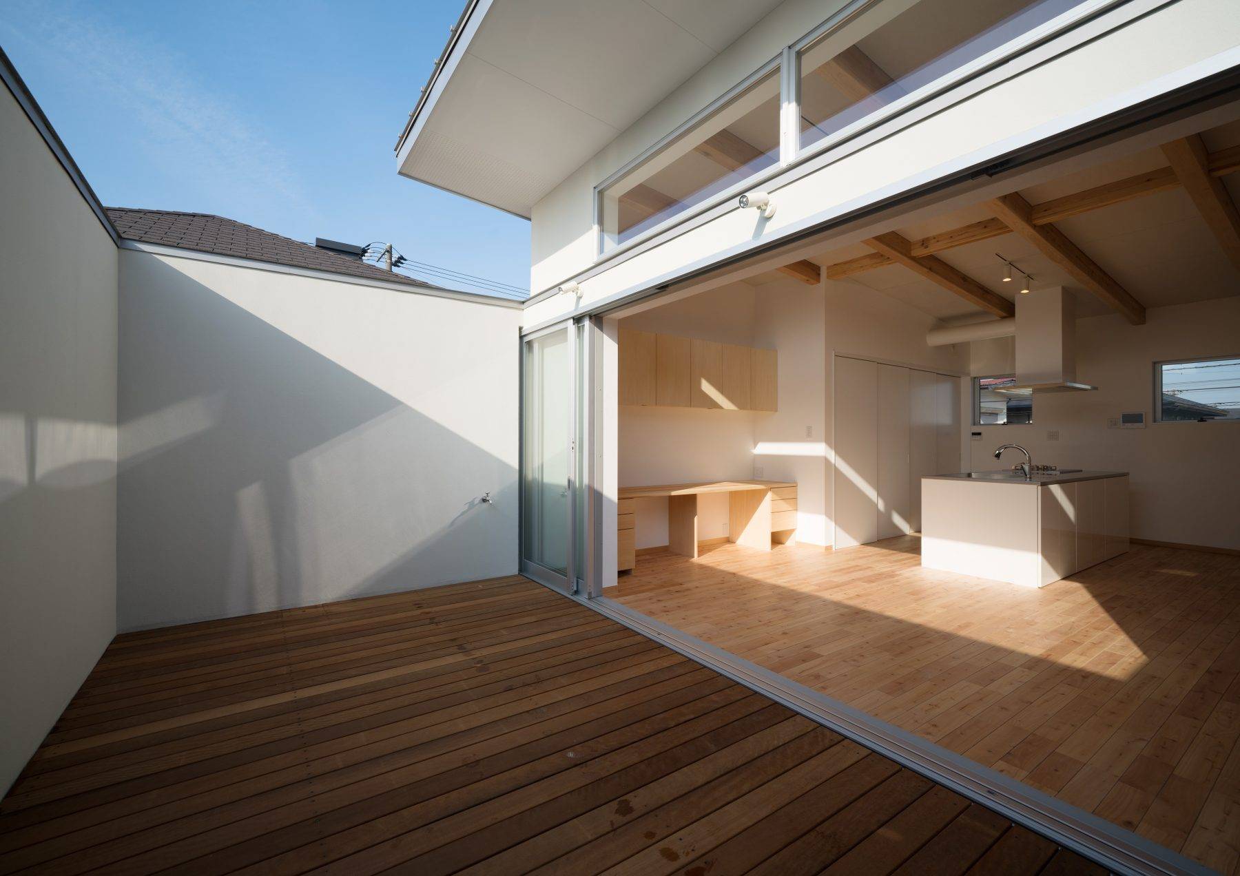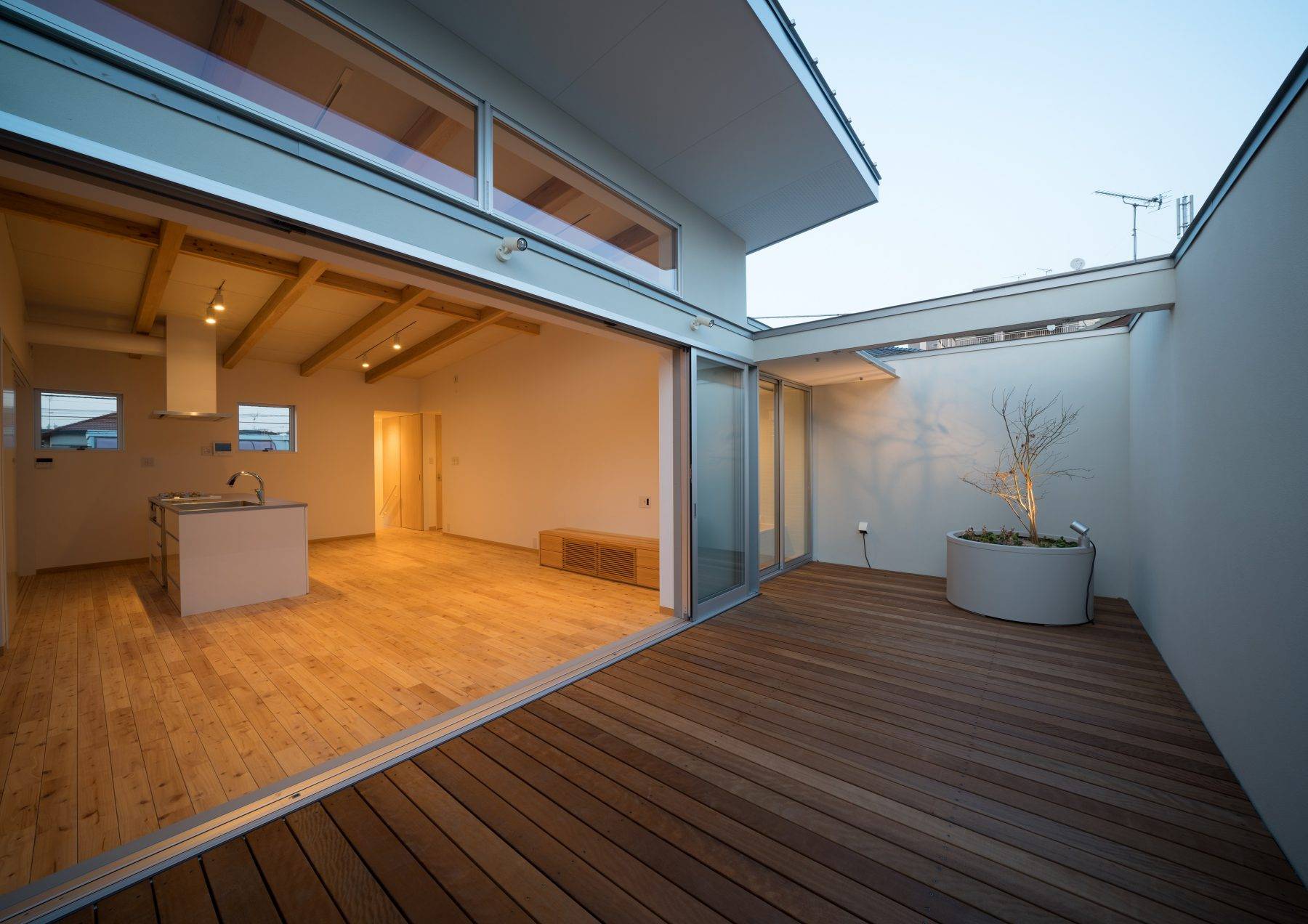 ・20畳のLDKは天井高さが2.4m~3.0mに緩い天井勾配を持ちながら広がり南面のハイサイド窓から秋~冬、そして春まで自然光が入ります。繋がるアウトドアリビングは2.4mの壁で周囲からの干渉を遮断しプライベートな半屋外空間として利用できます。青空を強く感じさせ、季節ごとに多彩な休日のブランチやお友達を招いてのBQなども可能です。ワイン片手に星空を眺めながらゆったりした時間を過ごすことができます。