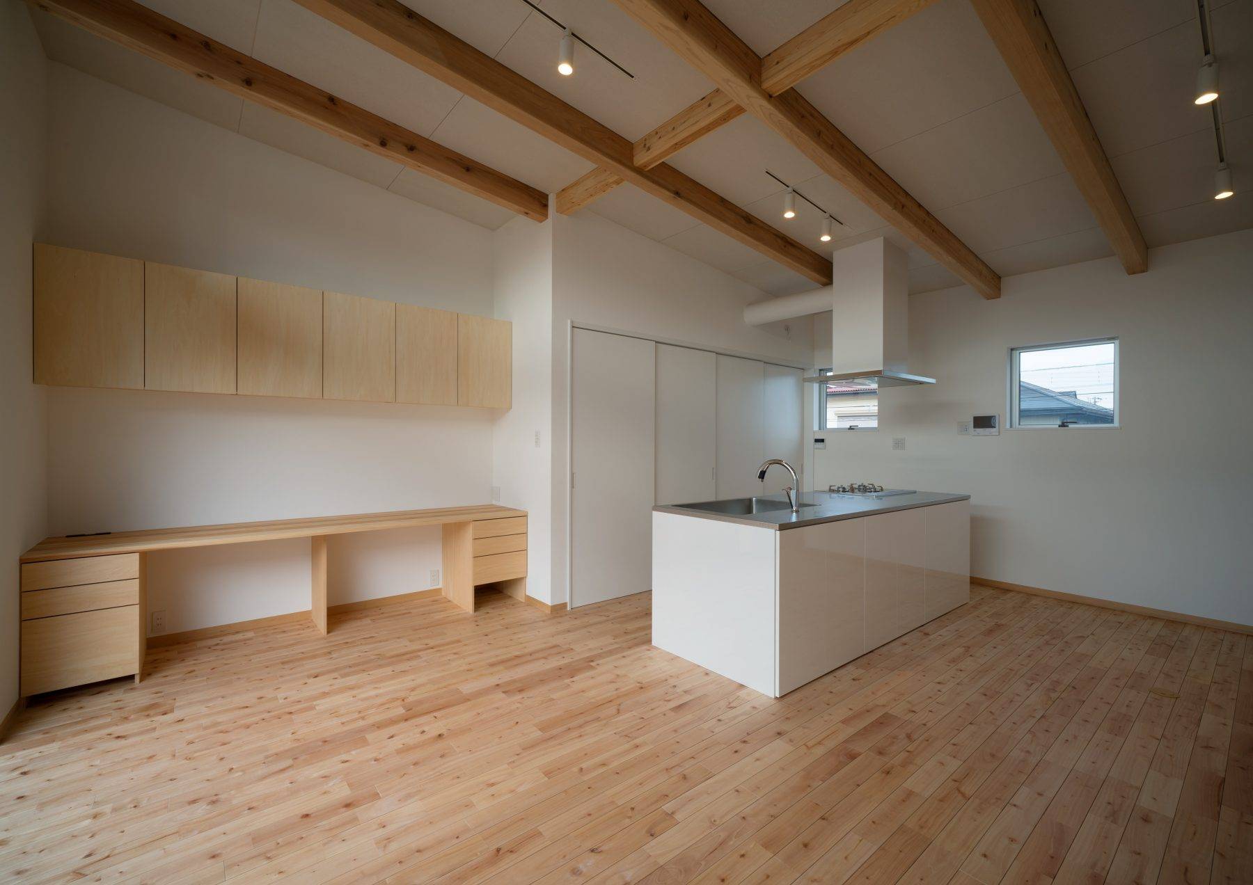 ・施主要望でもある2階リビングダイニングの計画を採用して、ワンルームで20畳のLDKを配し、南側に13畳のアウトドアリビングをつなげました。4本引き掃き出しのテラス戸は両側に引き分けられて3.6mの開口でつながり、33畳のプライベート空間を創りだします。