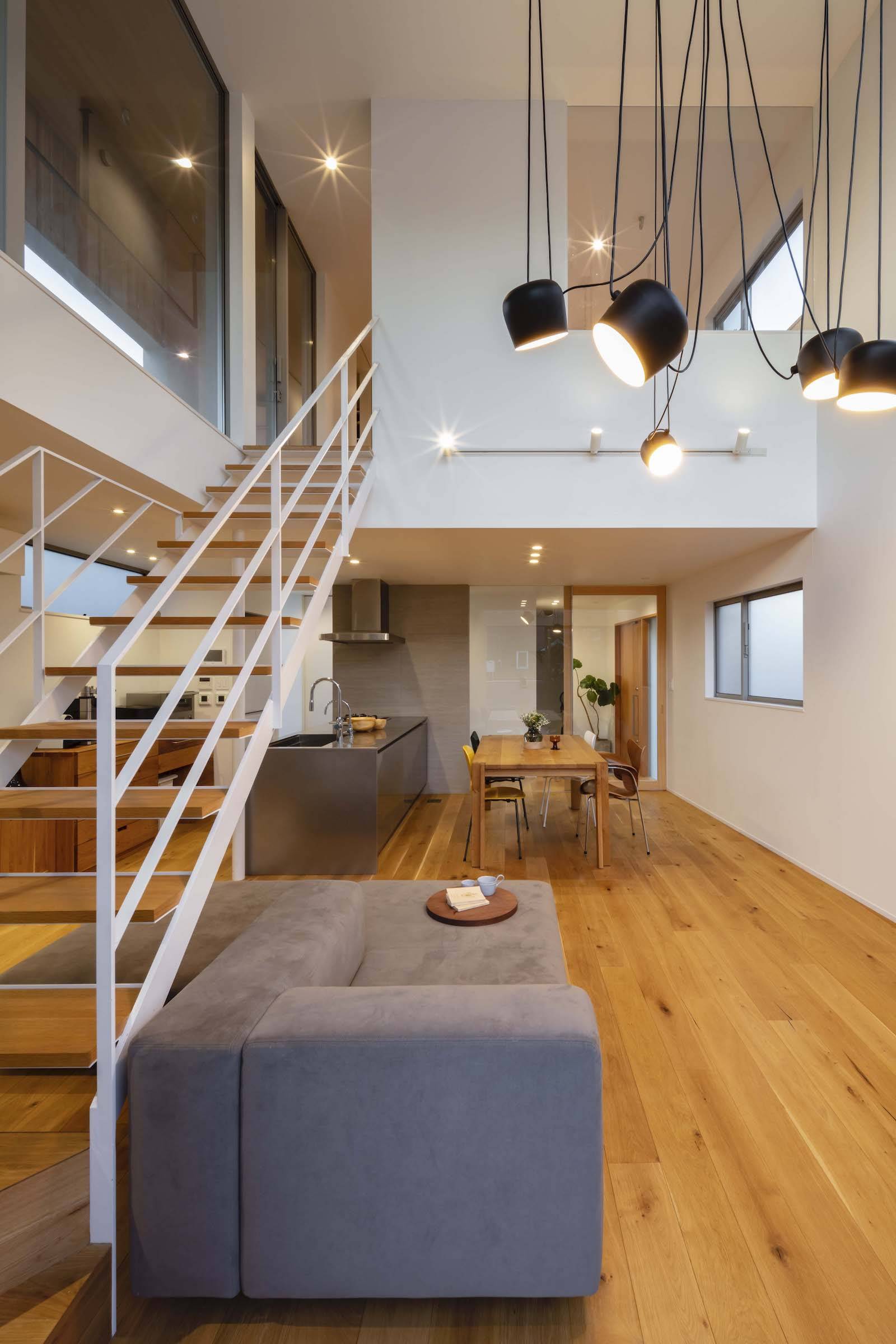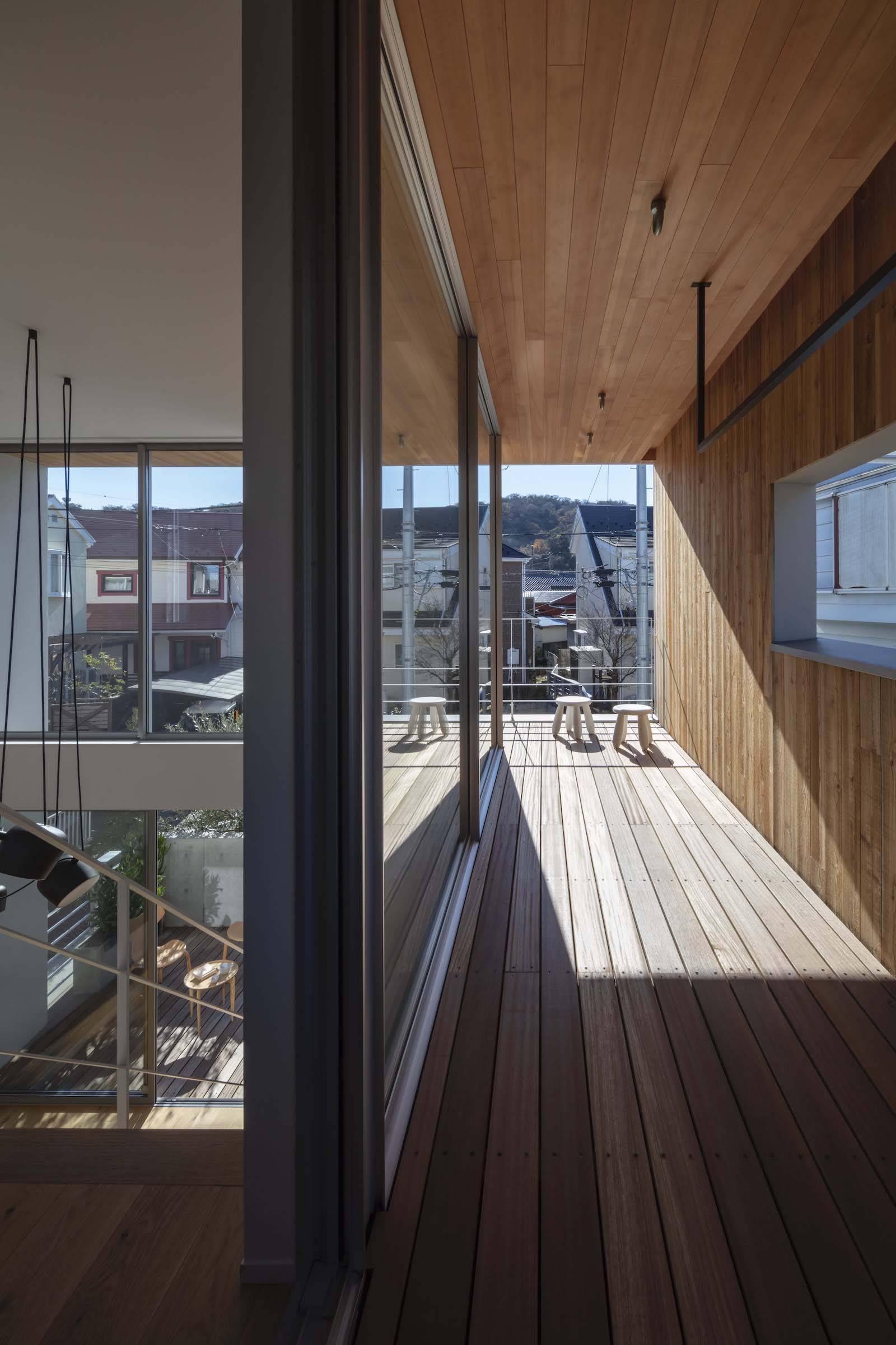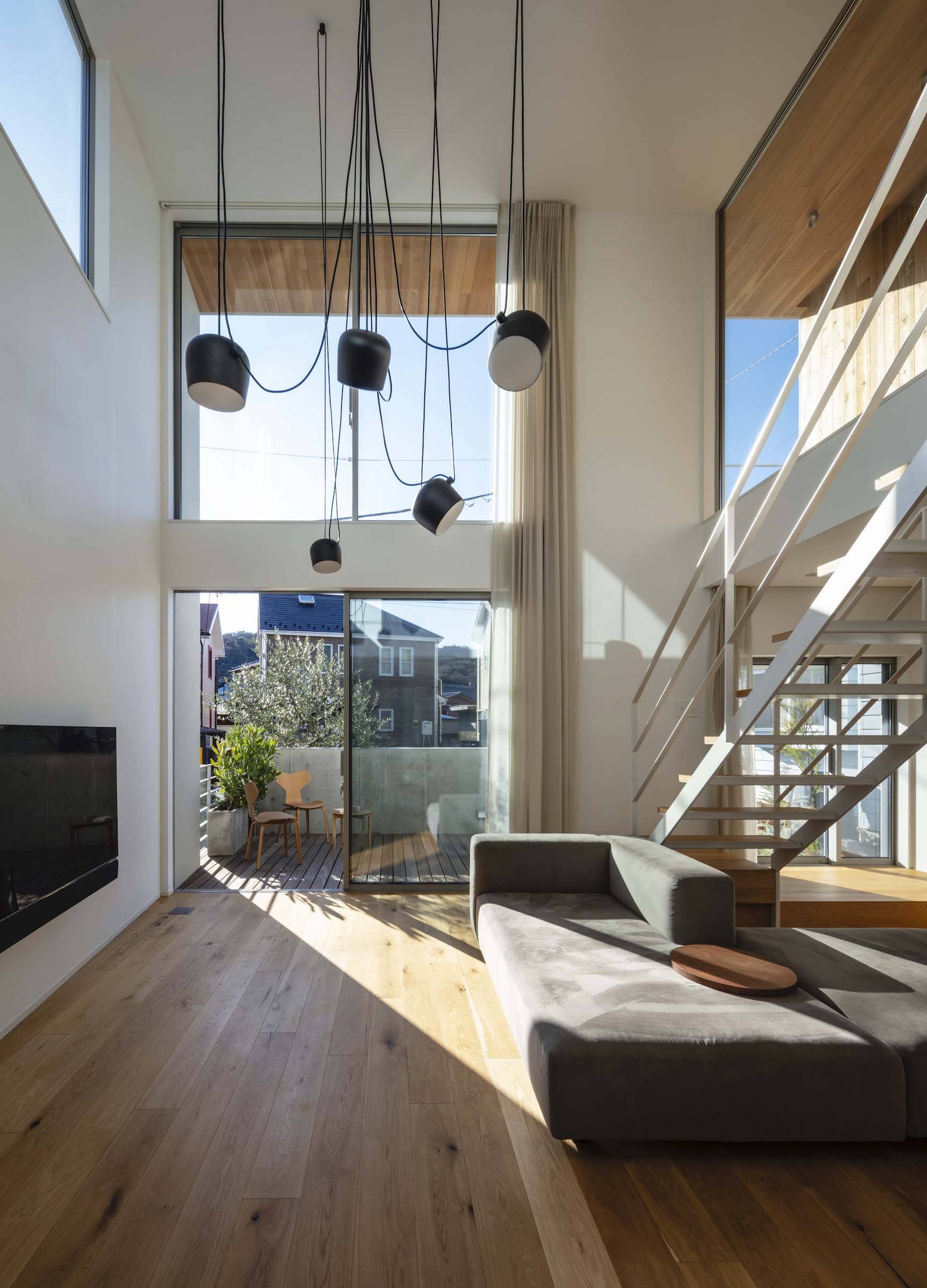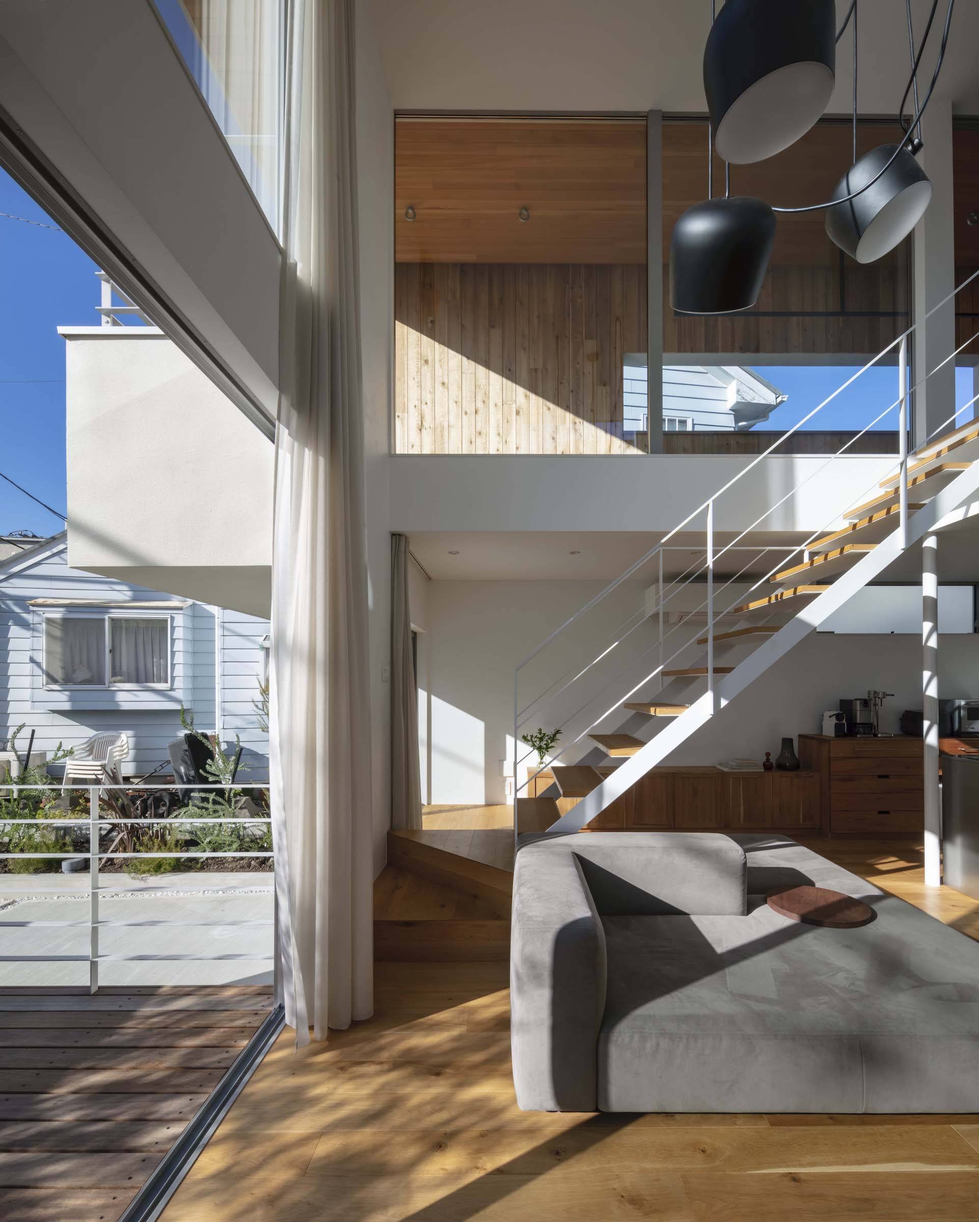 神奈川・葉山町に建つ木造2階建ての新築住宅です。「光と人が集まる住まい」というご要望をいただきました。吹抜けと2つのテラスを盛り込み、住宅内部に外部を取り込むような立体的な空間の広がりを実現しています。