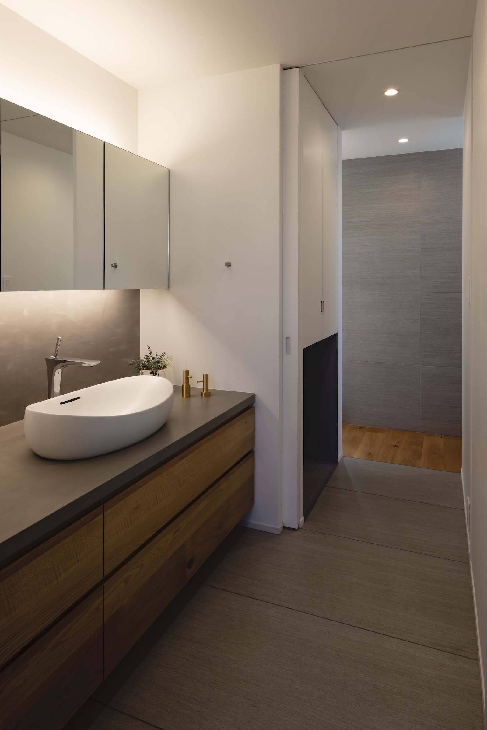 洗面脱衣室. 洗面カウンター脇には、収納棚下に愛犬用トイレを設置(換気設備付)