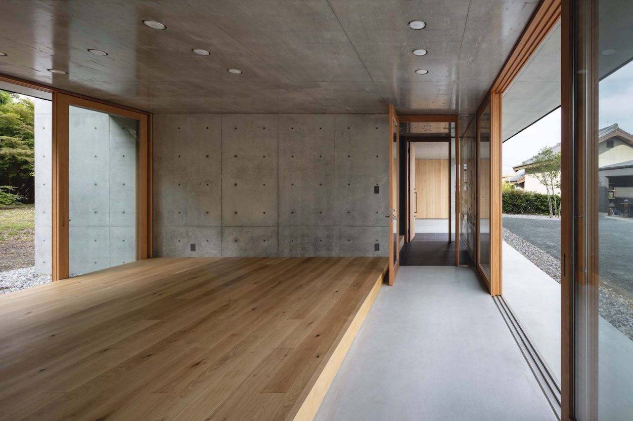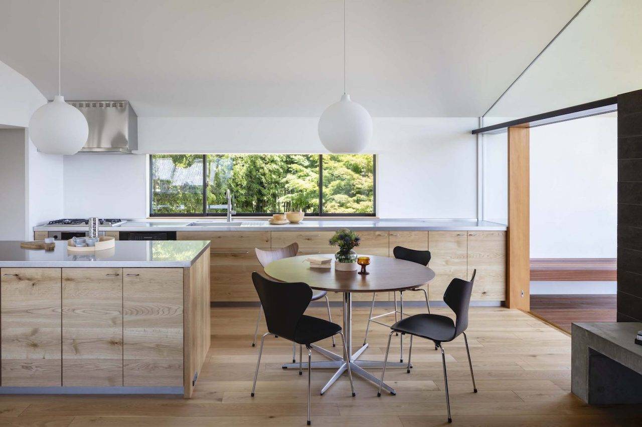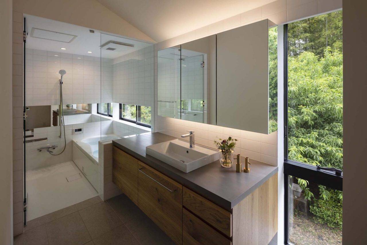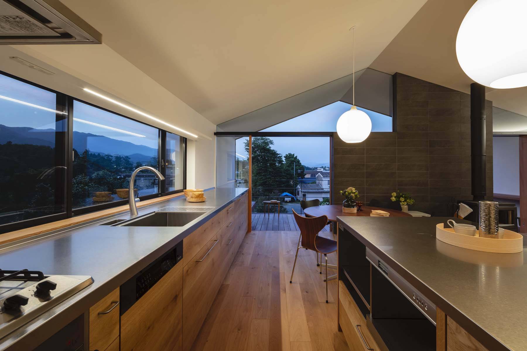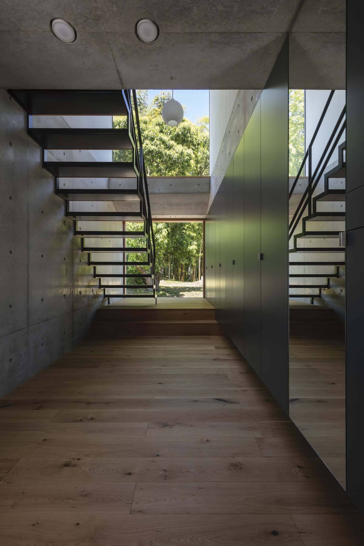 2階は木造とし、居住部分のほとんどを東西に伸びやかなヴォリュームの中に配置することで平家のような暮らしを実現しています。各室の窓からは季節や時間により表情を変える竹林を日々目にし、また東側の深いバルコニーからは山並みや田園風景を望むことができます。こうした竹林や山並みといった自然の要素は、ここに暮らす人の意識を外へと拡げ、建築の内と外を一体化させてくれます。