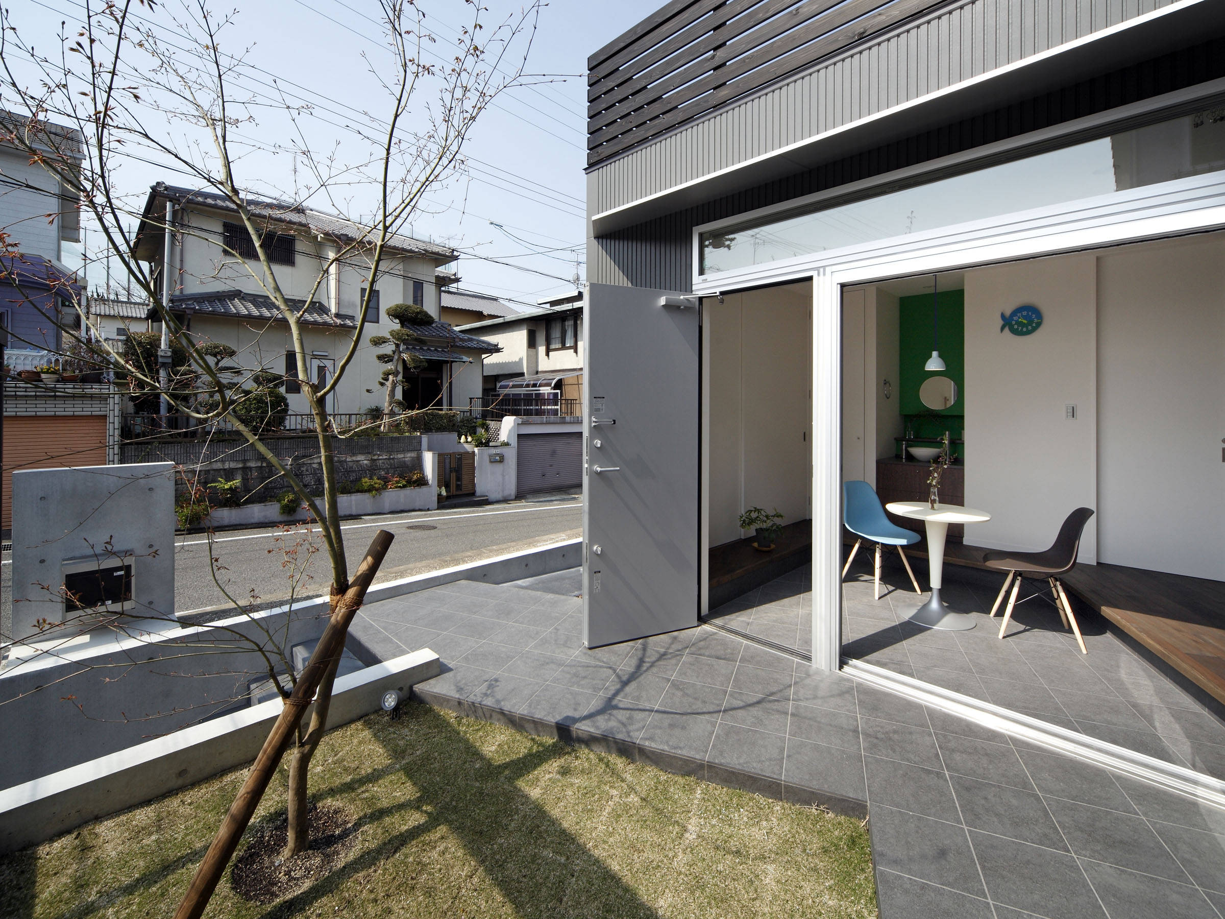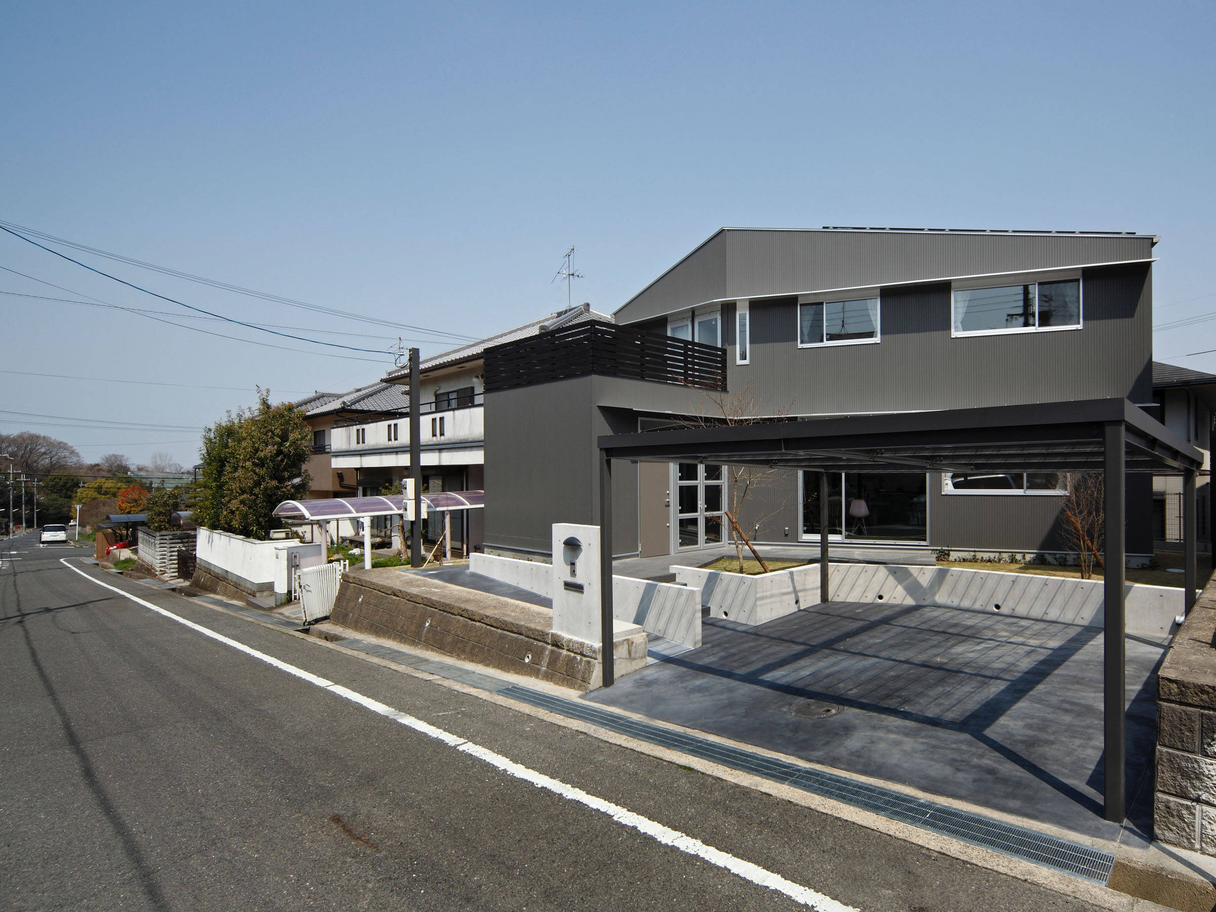建物の長辺は真南に正対するよう配置し、玄関のある短辺部は敷地に直交する平面計画とした。これは街並みに配慮する意味と、西日を遮り、庭のプライバシーを確保する狙いもある。