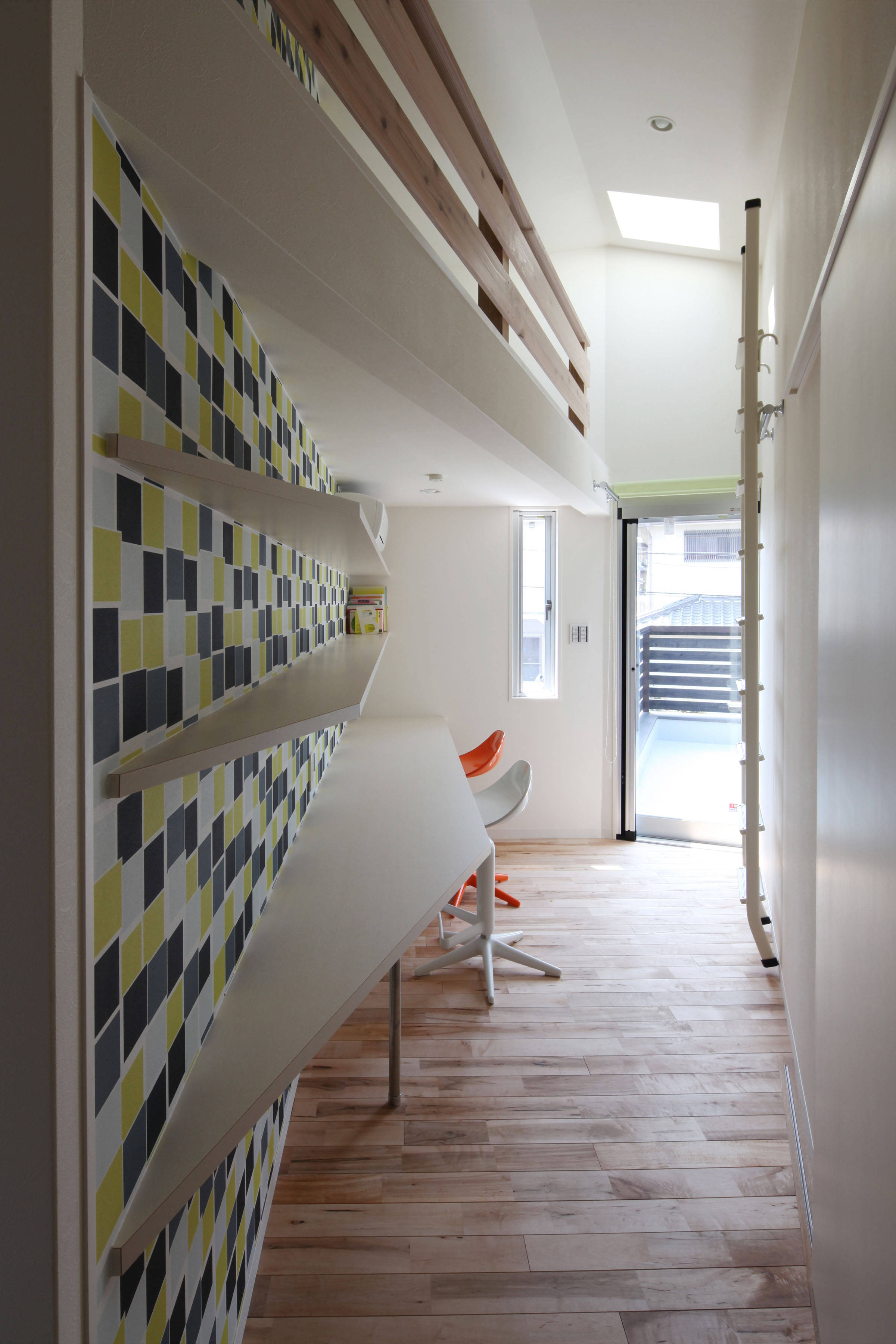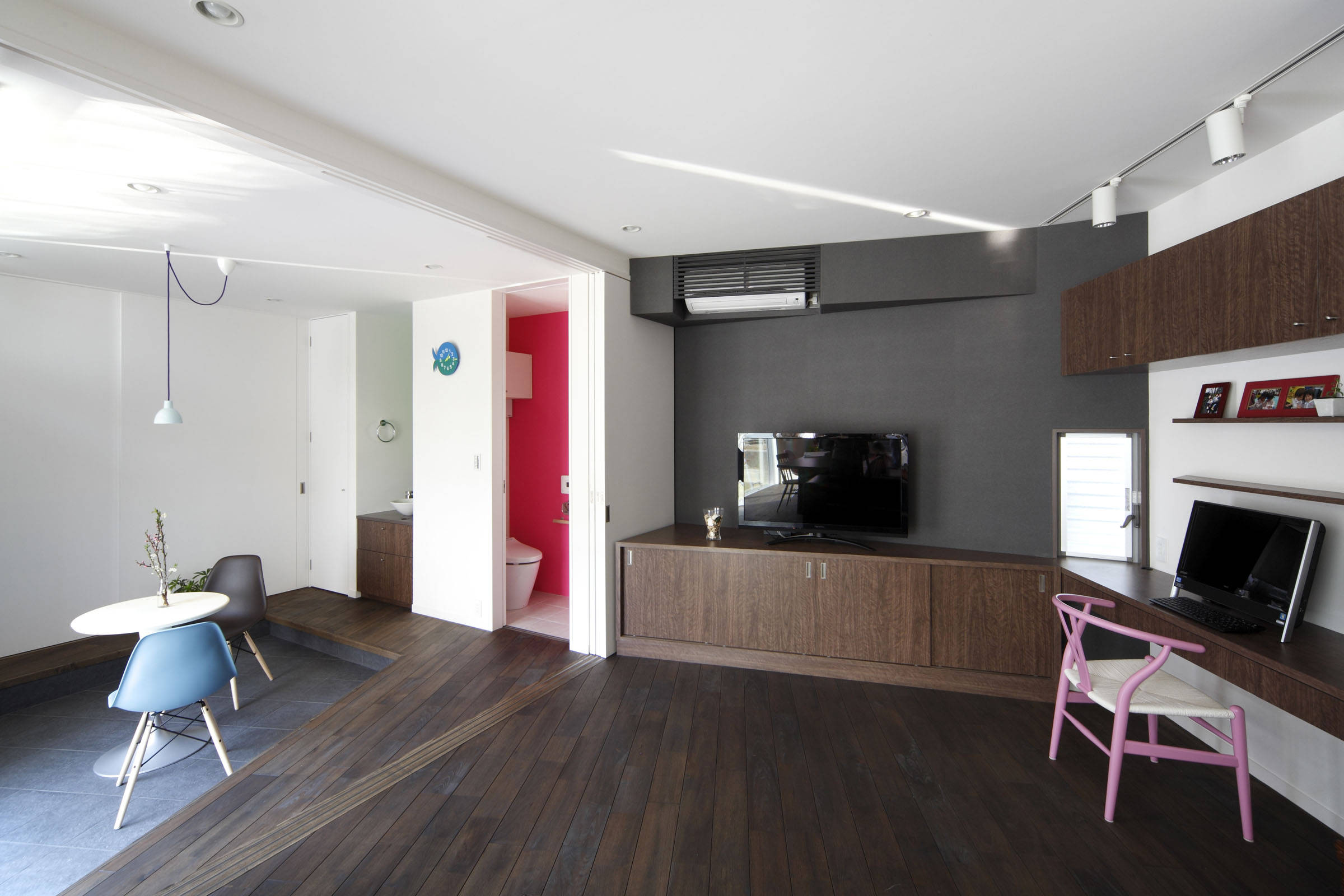 その上部は、大きなバルコニーになっており、夏の花火大会を楽しめる。部屋ごとにテーマを決め、思い切った色を使った。更にカラフルな家具。楽しみの多い家だと思う。
