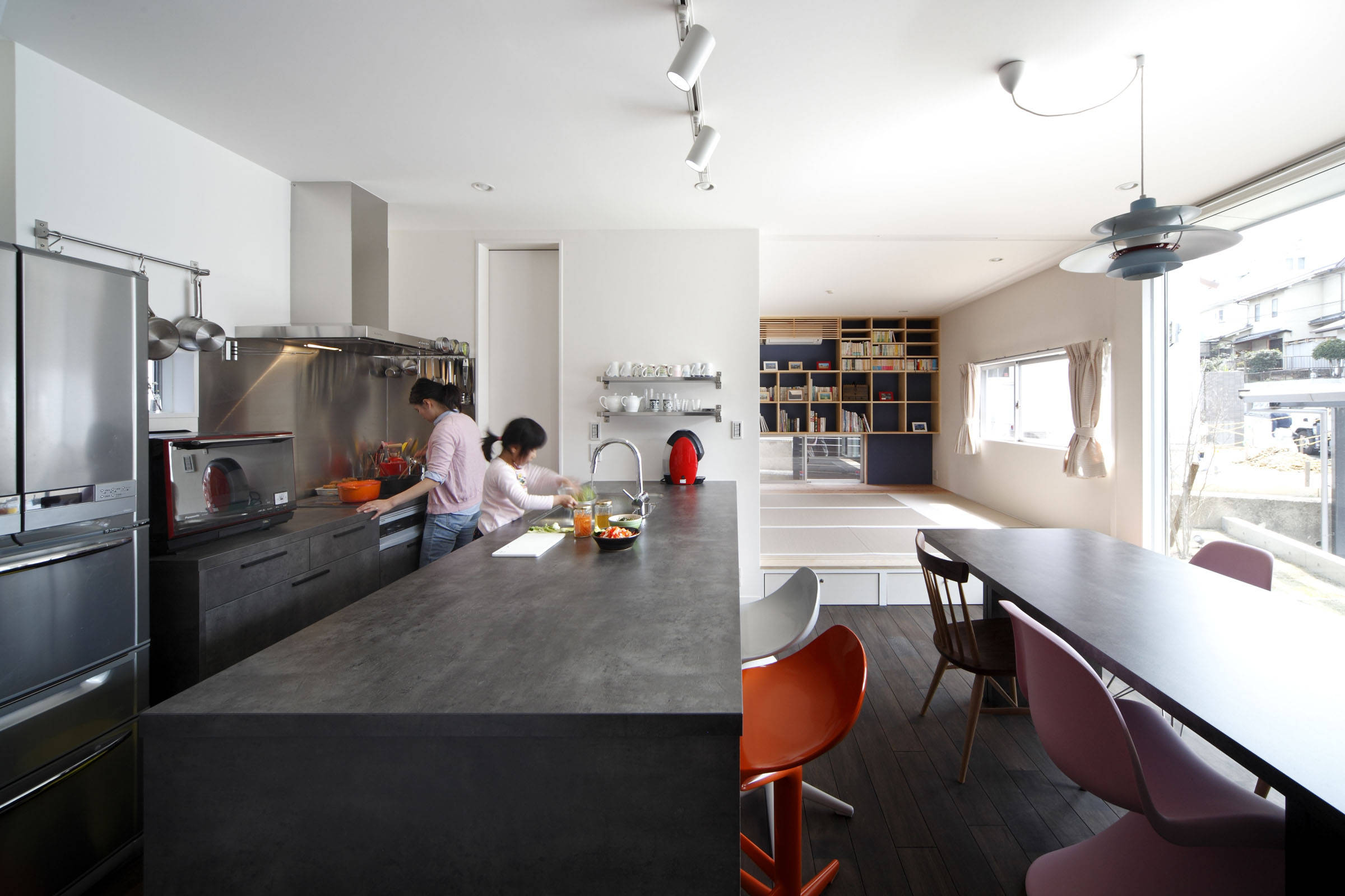 キッチンで対面して、大きなダイニングテーブルで、居間横のカウンターでインターネットをしながら、庭で、2階ファミリースペースで、そして大きな玄関土間で。