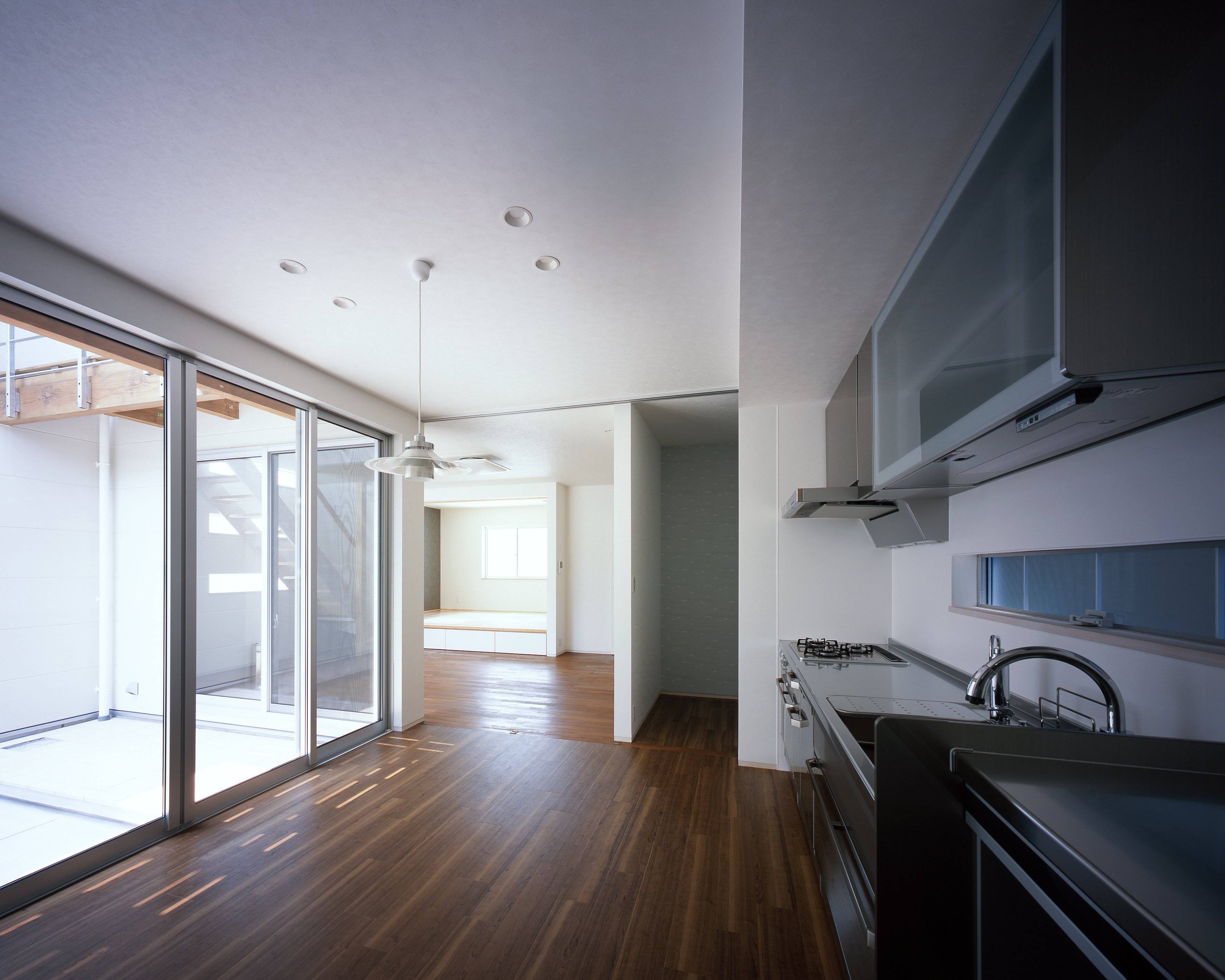 中に入ると、たっぷりの光が降りそそぐ、家族だけの空間。 LDKに面する中庭は壁に囲まれながらも、南側のルーバーから風が通り抜ける。中庭の上部は2階の居室に面しており、空間が繋がっていく。 黒い外観からは想像できない、とても明るく広がりのある空間となった。