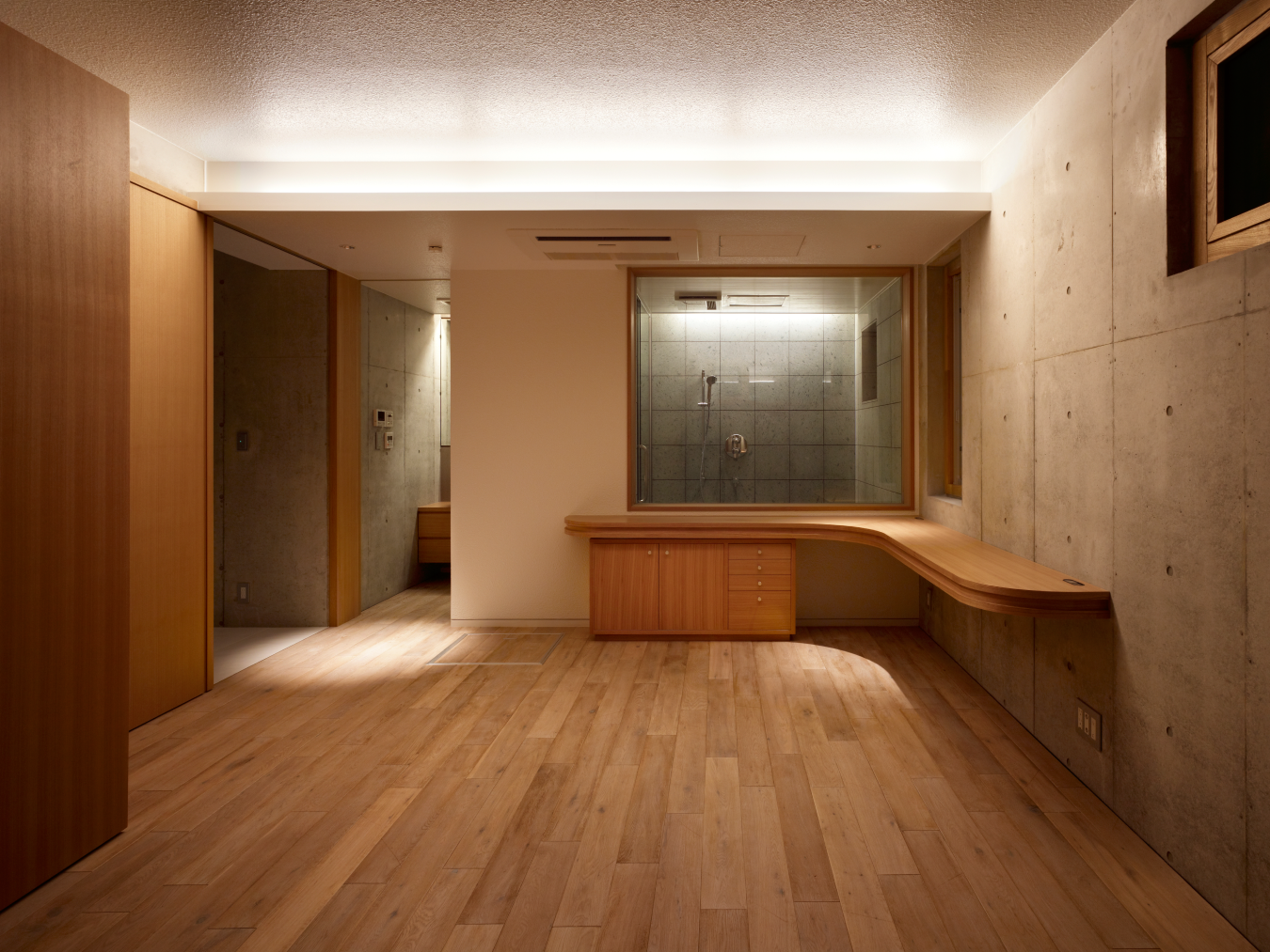 外観はコンクリート打放しのクールな印象ですが、断熱材を裏打ちしたFRC打込み型枠による「外断熱工法」を採用しており、室内空間全体が外断熱でしっかりと包まれています。