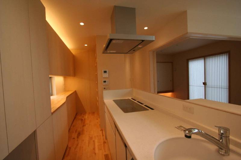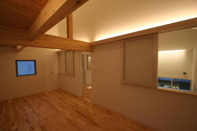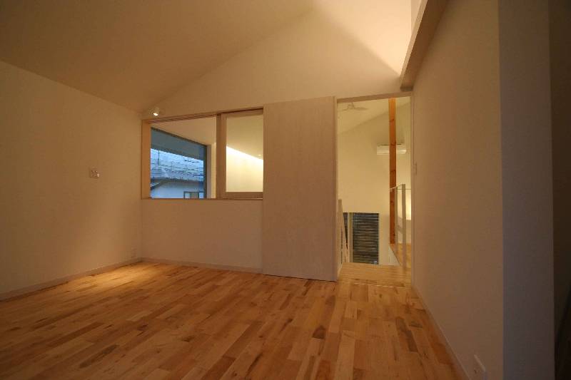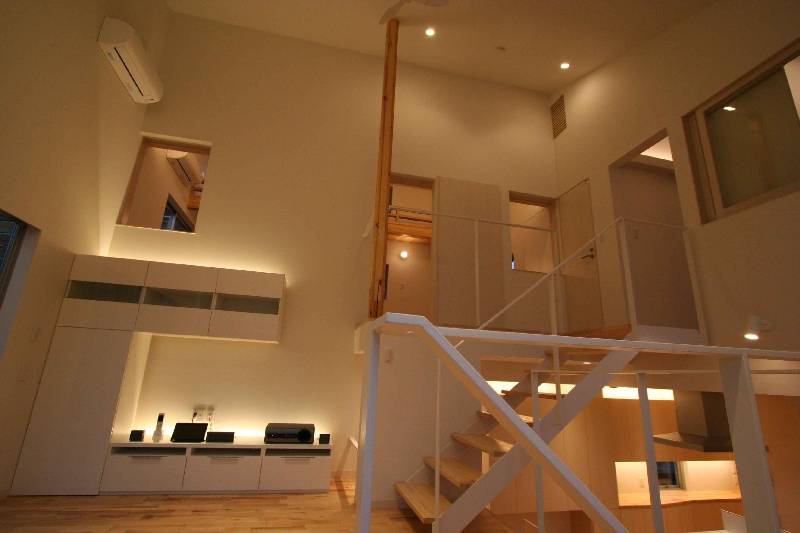 1FにLDKと和室と水廻り、納戸 2Fに寝室と子供室の構成としました。納戸は1FLより下げ、上部をリビングとするスキップフロアにすることで、大きな収納スペースと高い吹抜けのあるリビング生み出しました。木造としては、大きな空間になるため構造はSE構法を採用しました。暖かい家にする方法としては、建築主よりパッシブソーラーの希望がありました。その風システムを採用し家のどこでも常に暖かい家となりました。吹抜けは、そよ風システムの空気循環させる空間としても機能しています。
