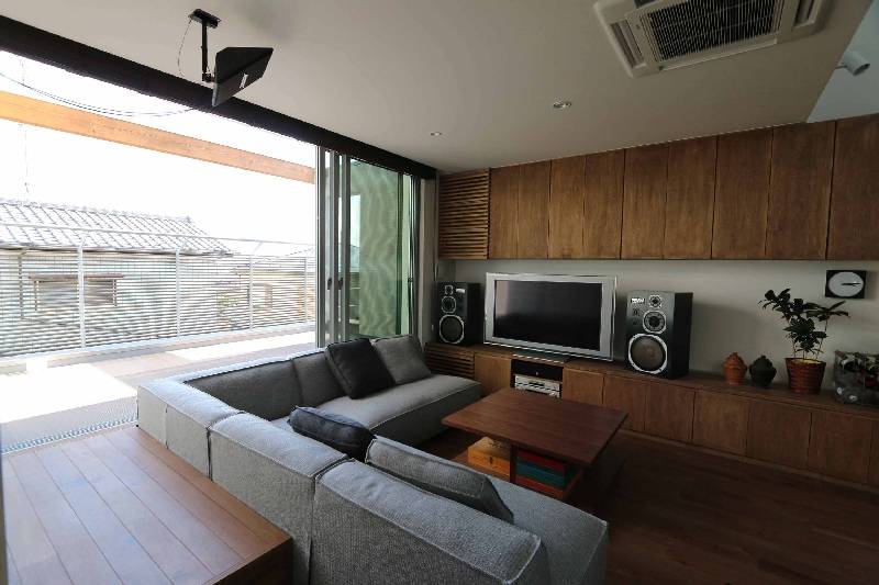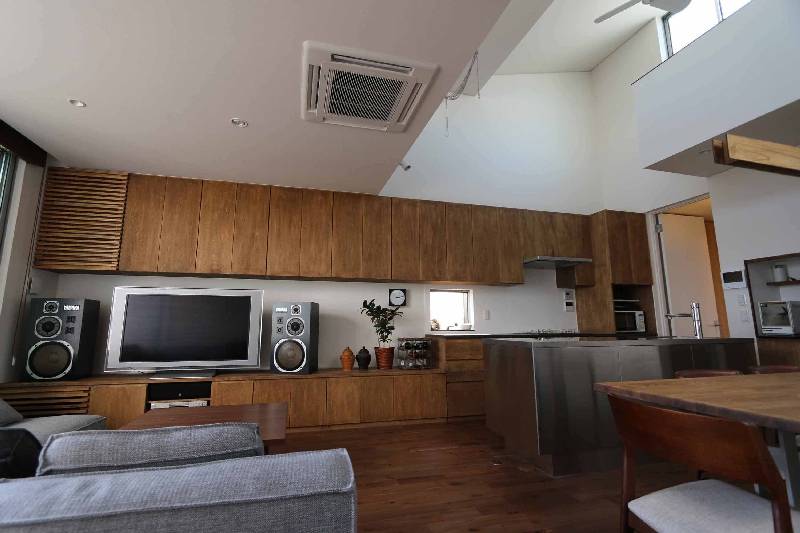 LDKは、キッチンと連続する大きなリビングボードや吹抜けを設けておおらかな空間としています。吹抜けは、暖められた空気を抜く風の通り道にもなっています。空間は、中庭とさらにその向こうのホールとも繋がります。南側の大きなバルコニーは、LDKと連続するだけでなく、寝室にも繋がっています。空間と繋がりと多様な方向への視線の抜けによって重層的な空間になっています。