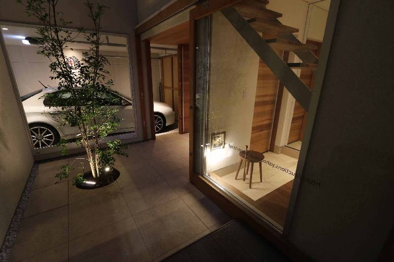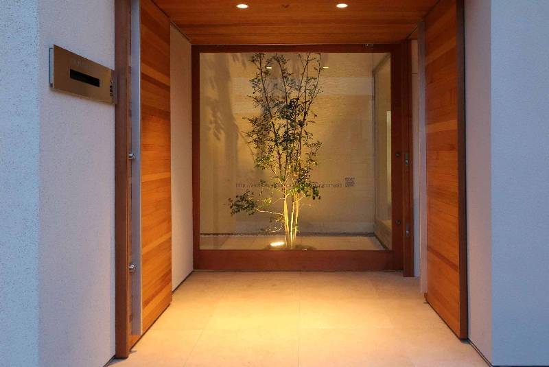 ポーチはシマトネリコの植えられた中庭と連続させることで、訪れる方を迎え入れる雰囲気を醸し出します。そのため中庭との境界を門などで閉じるのでなく大きなガラス戸で緩やかに仕切りました。