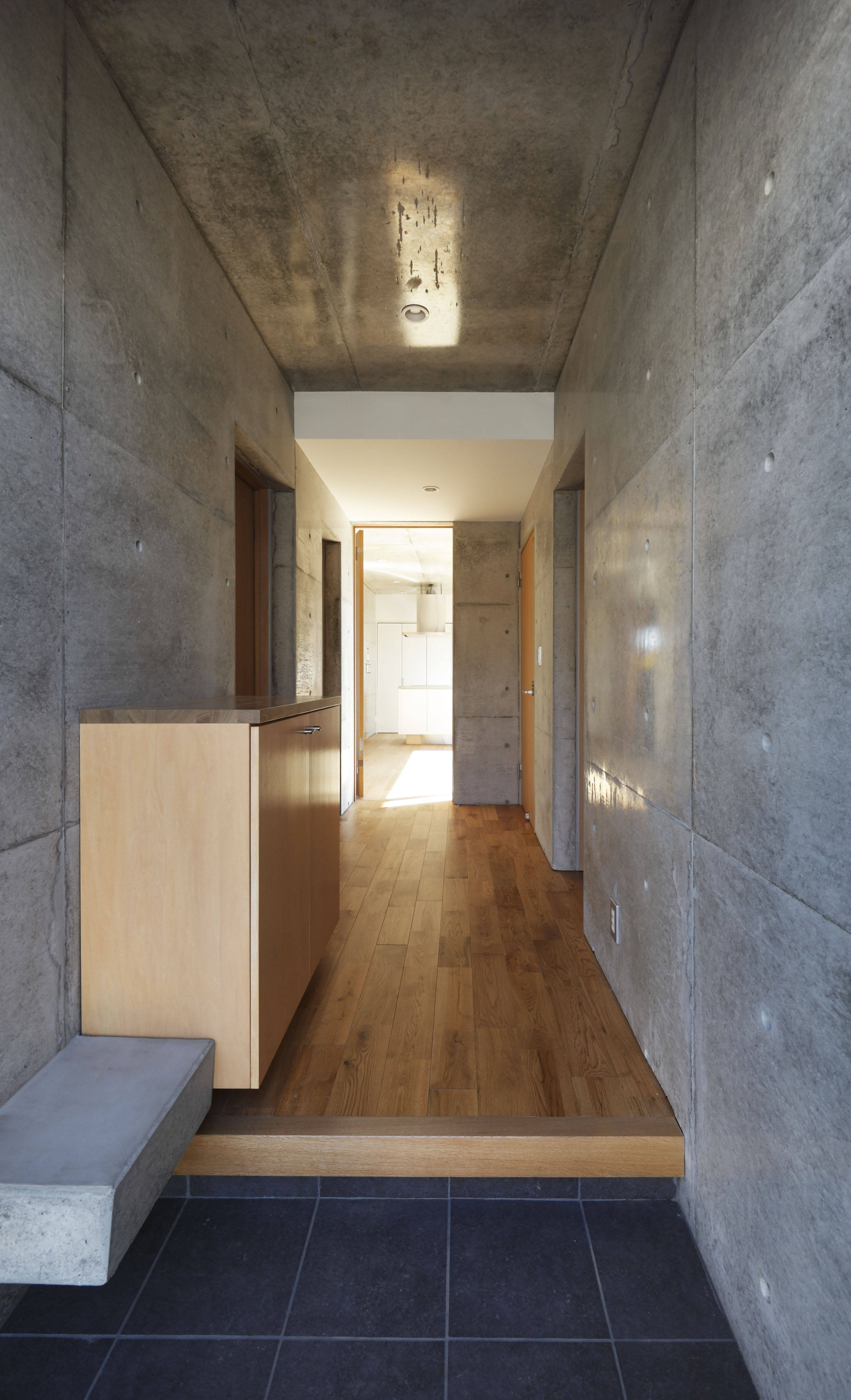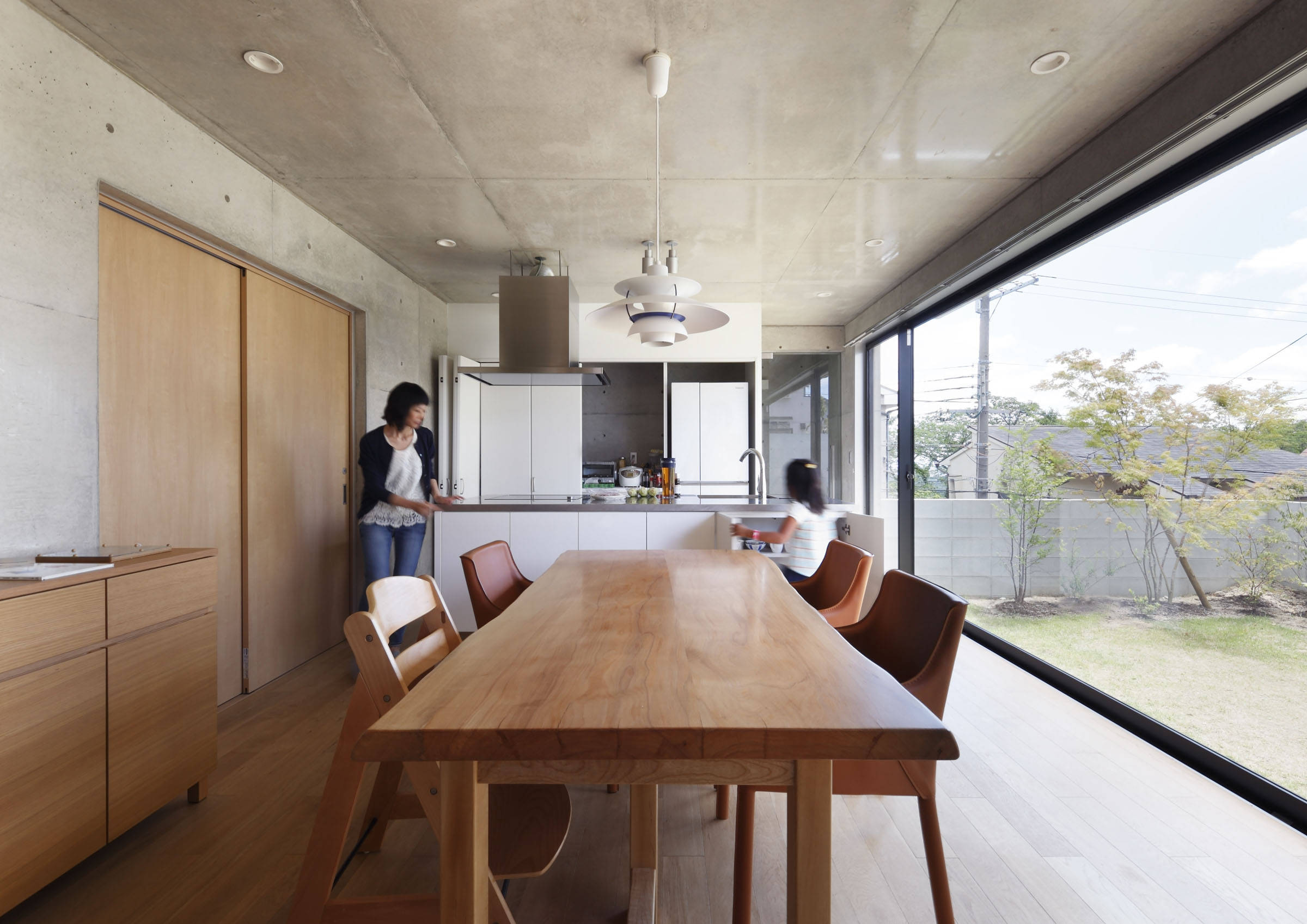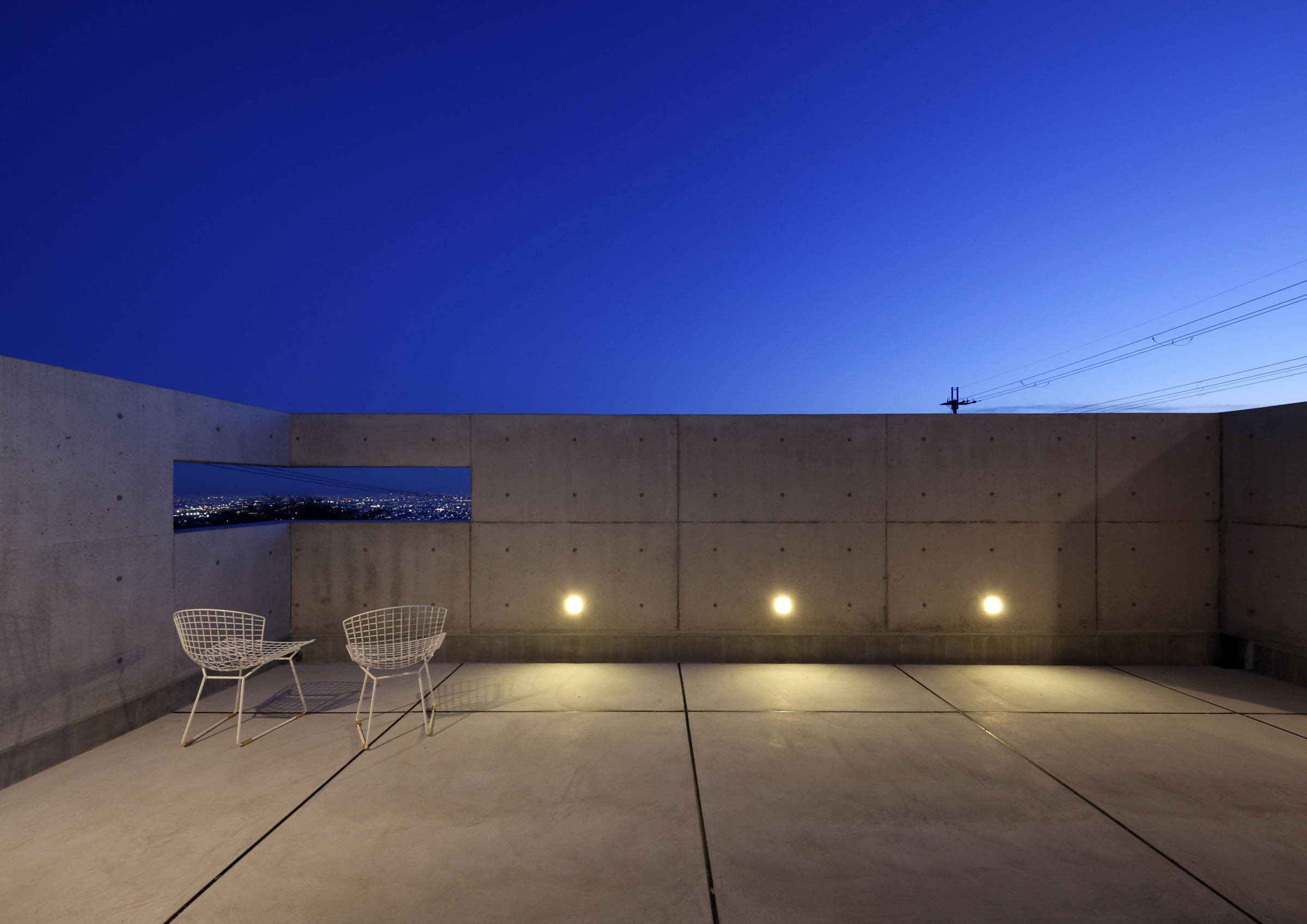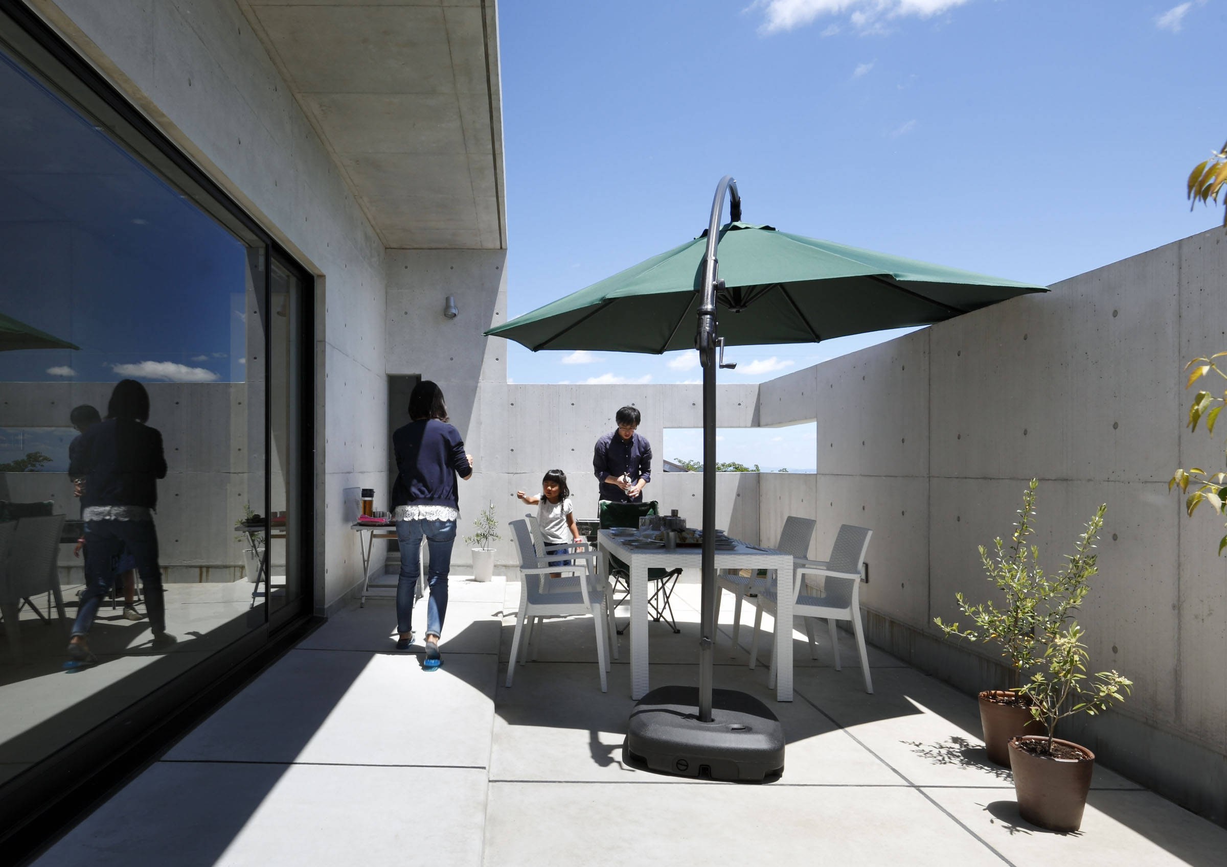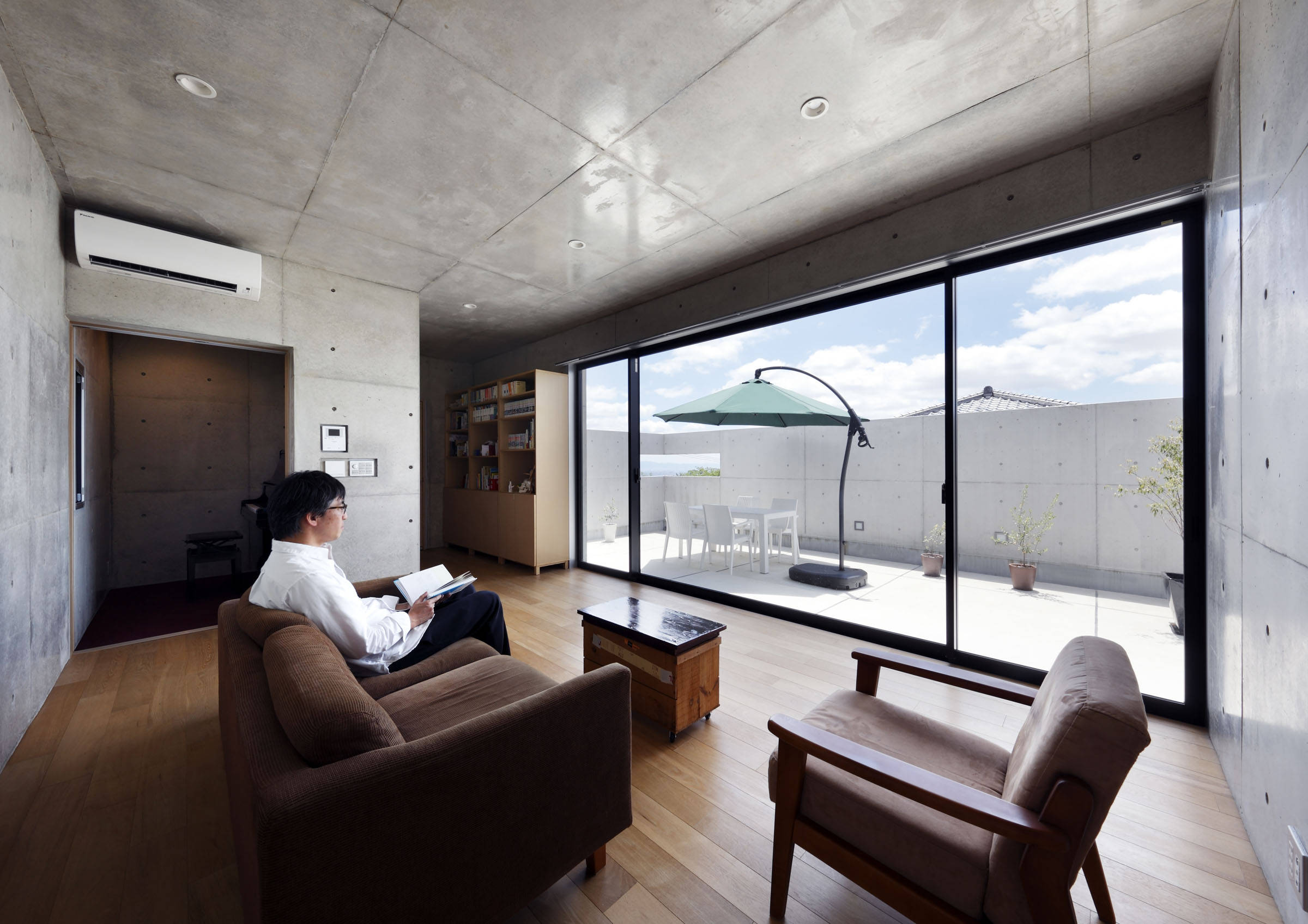 アウトドアリビングにでれば、コンクリート壁に穿たれた開口から素晴らしい眺望を得ることができる。更に、外からの視線を気にせず、空と風を感じることが出来る。深い庇は、夏の直射を防ぎ、冬の陽光は遮らないよう設計した。言わばコンクリートの縁側。庇の作り出す中間領域が内を緩やかにつなぐのは、日本古来からの手法である。念の為、DKと共に床暖房も敷設している。