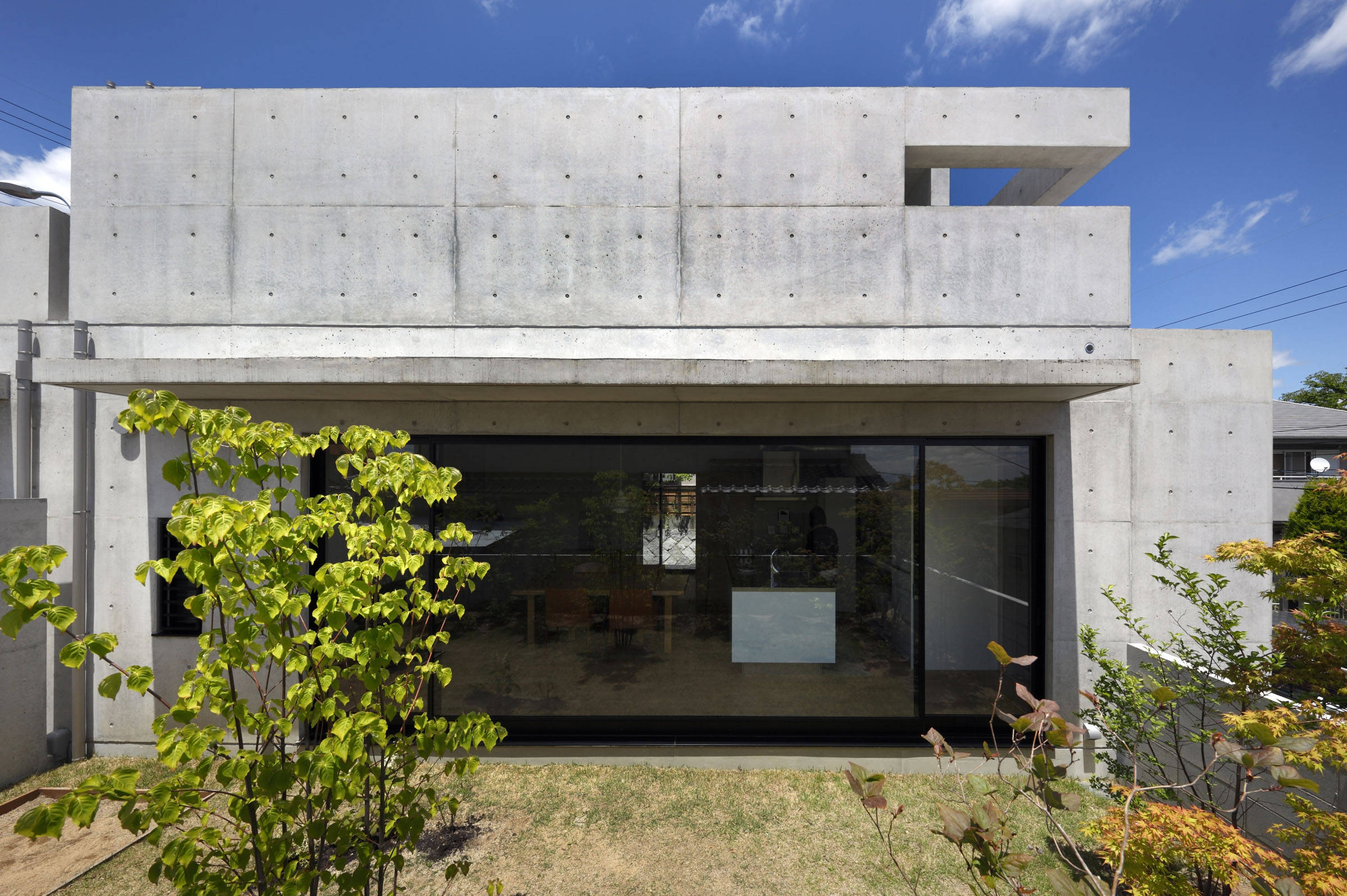 1階は各個室と水回り、そしてダイニング・キッチン(DK)のみとした。2階はプライバシーを確保するため、出来るだけ北側に寄せ、北は閉じている。1階のキューブに対して1.2m北にずれ、庇を1.2m跳ね出し、その下に駐車場を確保した。この空間により冷やされた風が、夏は通り抜ける。