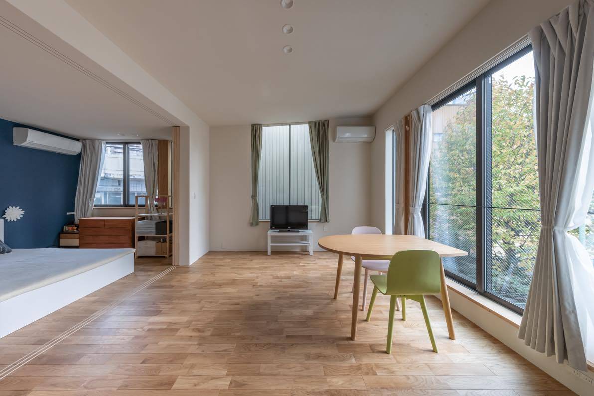 どちらも必要十分にして決して広くはないオープンなスペースを可動の間仕切りによって、都度、使い勝手に応じて柔軟に可変できるようにした。