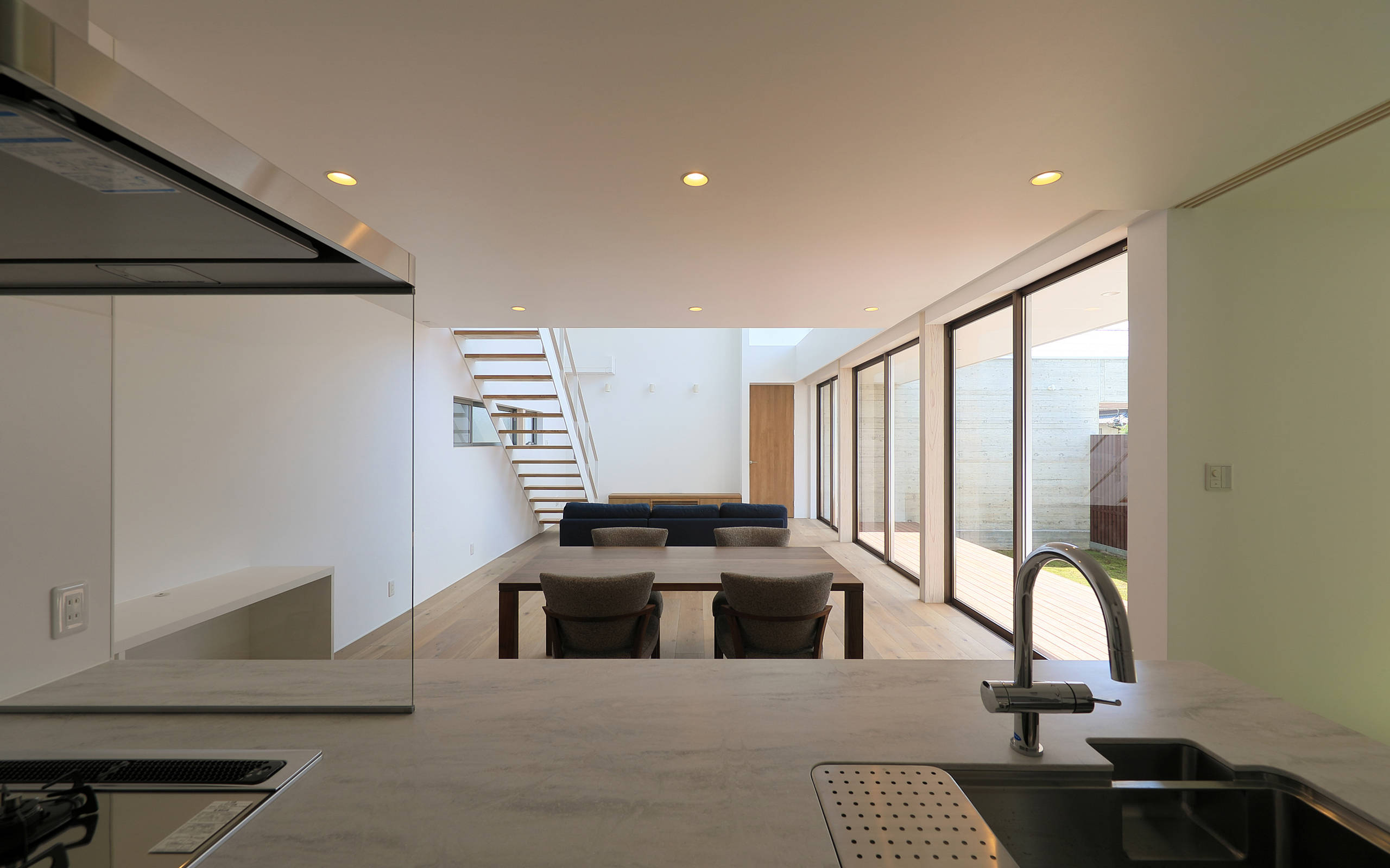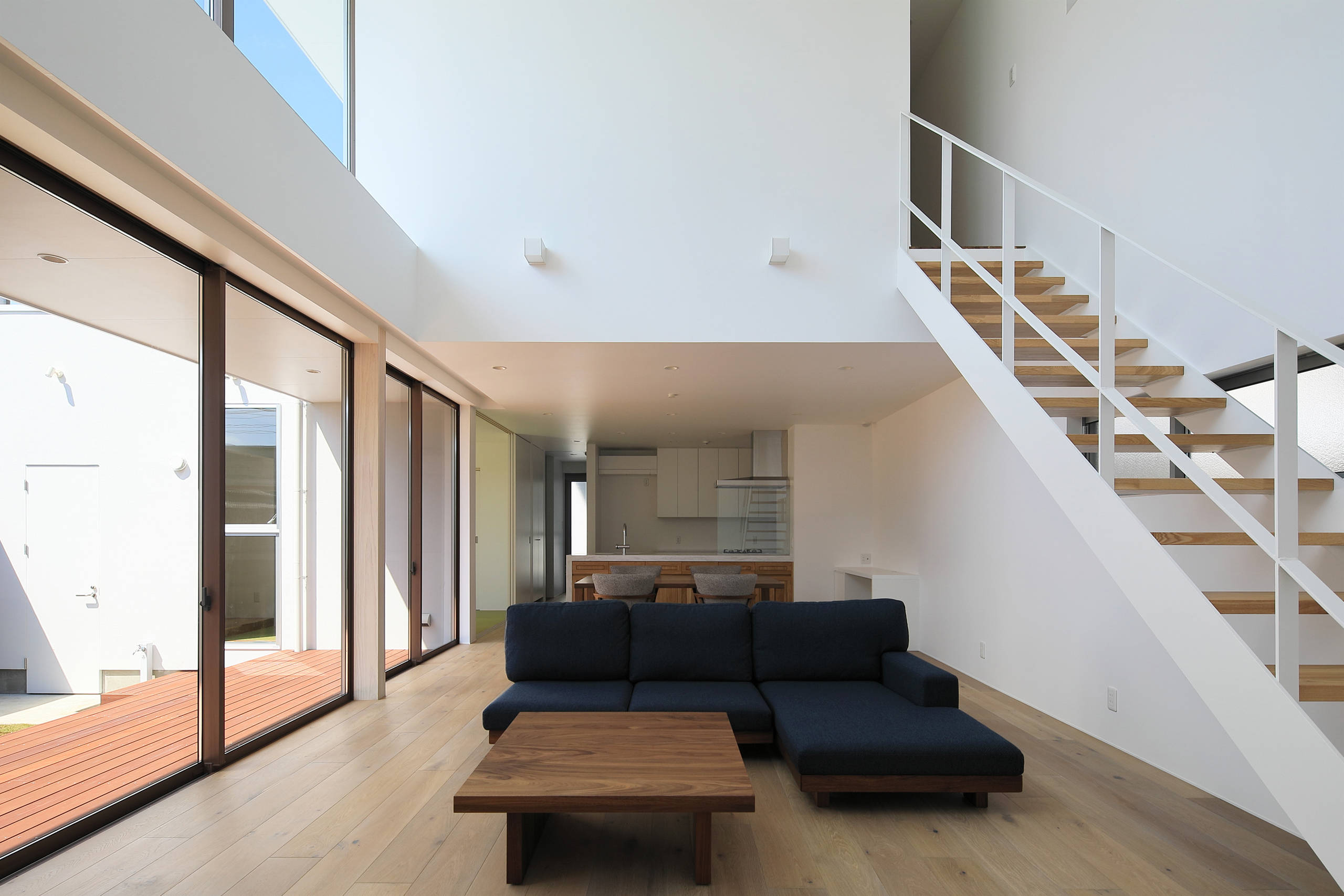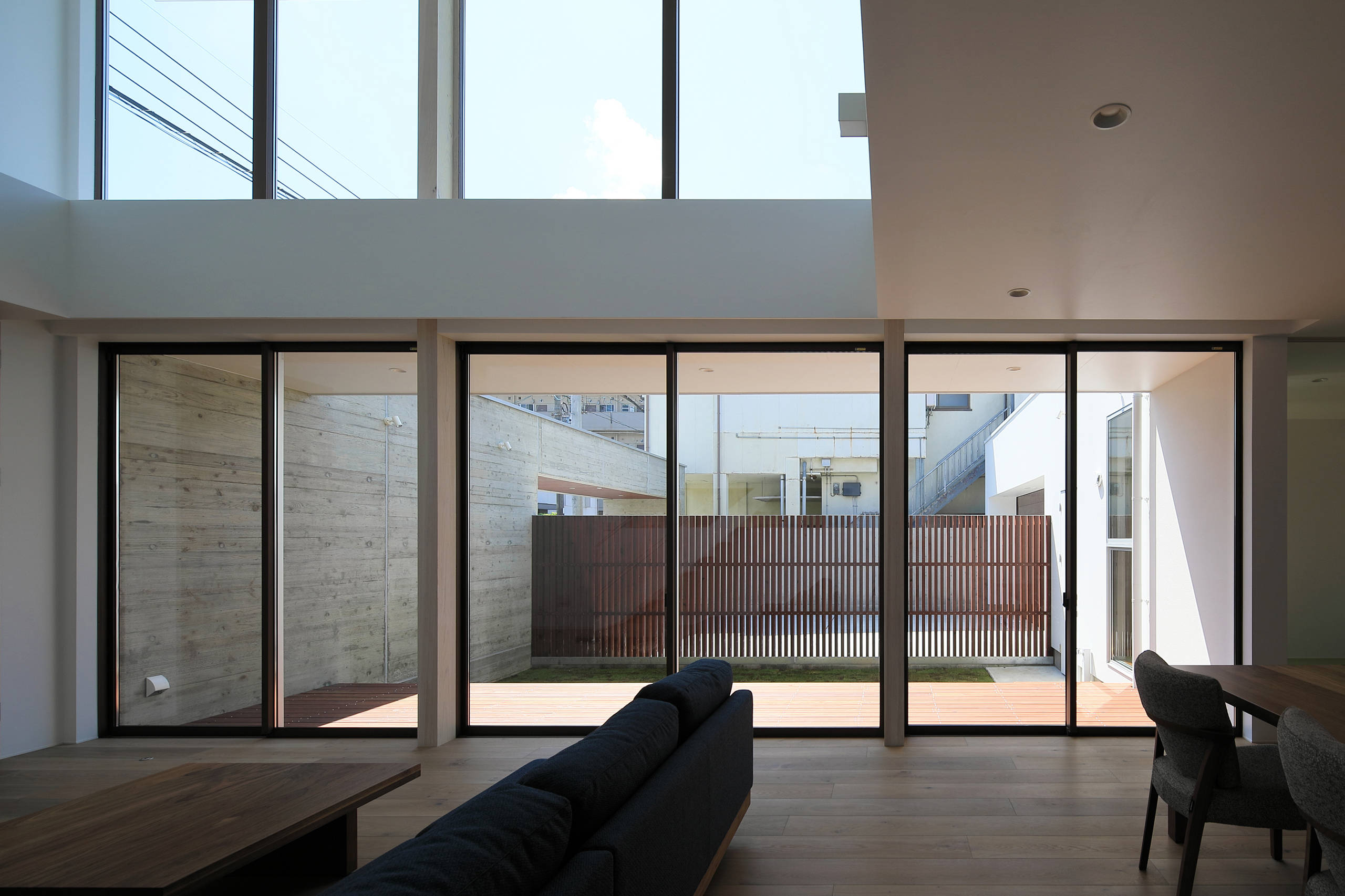 コンクリート打放しのボリュームと、ビルトインガレージに挟まれた部分にLDK・テラス・庭を配置し、庭の南側には縦の木製ルーバーを設けて周囲の視線をカットをしたが、それだけではやや閉塞感が生じたのでリビングに吹抜を設け、プライバシーを守りながらも風や光が心地よく通り抜ける開放的な空間とした。