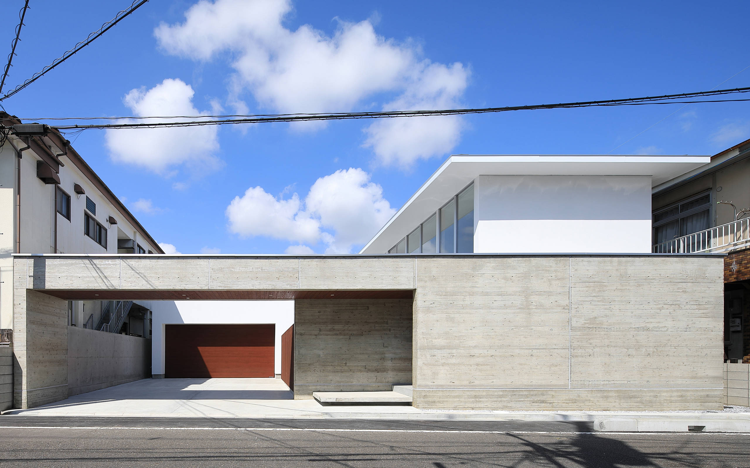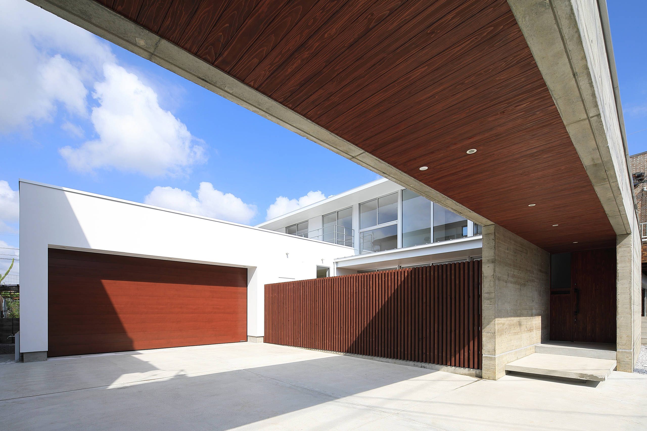 そこでまず、東の道路に面する間口一杯に杉板型枠コンクリート打放しのボリュームを置き、ビルトインガレージを道路に近接したところではなくコンクリート打放しのゲートをくぐった先の敷地奥に設け、街並みに対しての圧迫感を抑えながら印象的なファサードとなるよう、ボリュームやバランスを調整した。