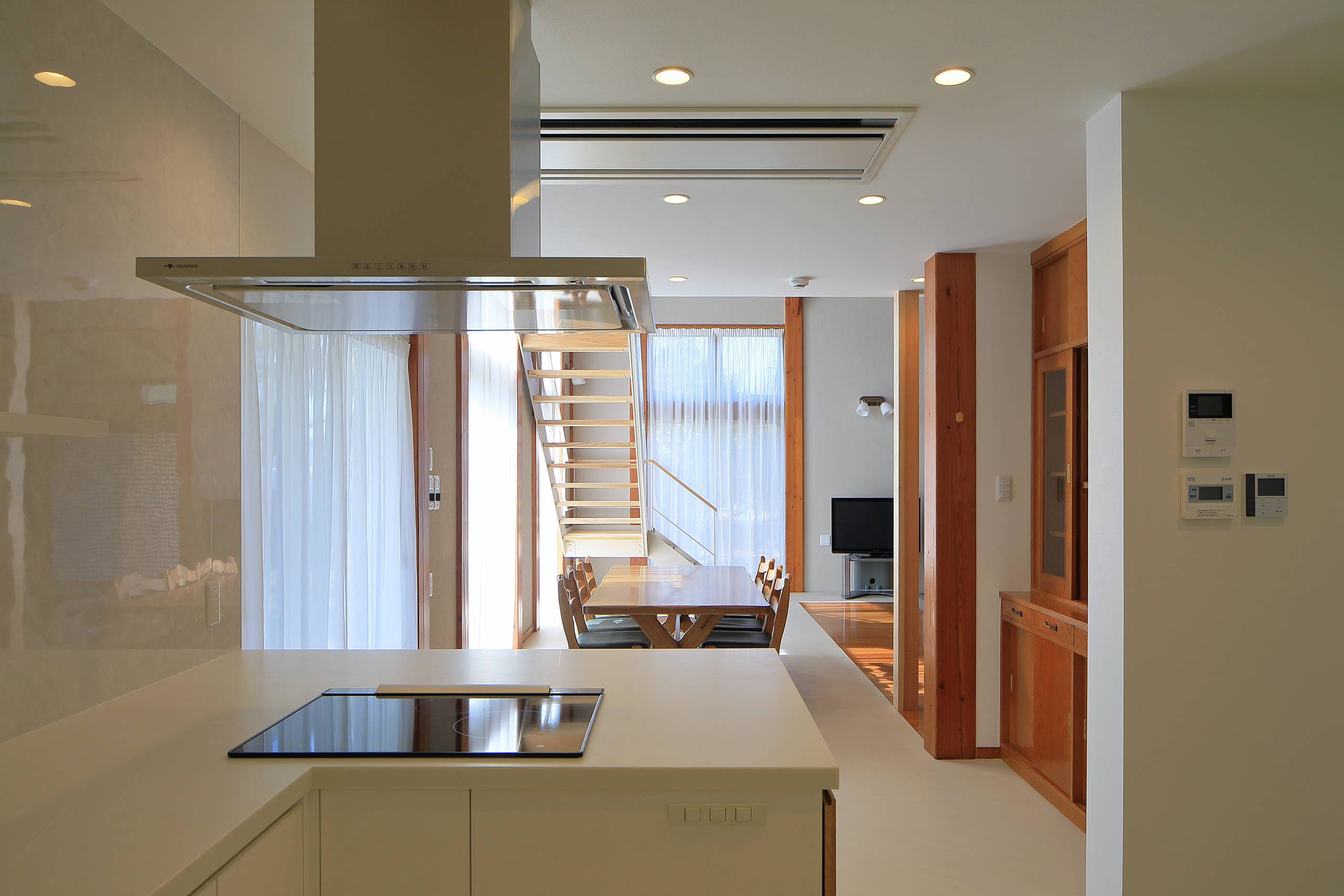 欅無垢板の天井や、ダイナミックな構造を構成する柱梁を現しとた意匠、50年以上前に購入されたというシャンデリアを残しながら、現代の暮らしに合うようにキッチンをアップデートしたり、色や素材を少しづつ操作してクライアントの家に対する想いや改修後の暮らしへの希望を具現化していった。