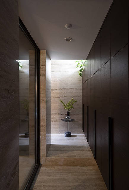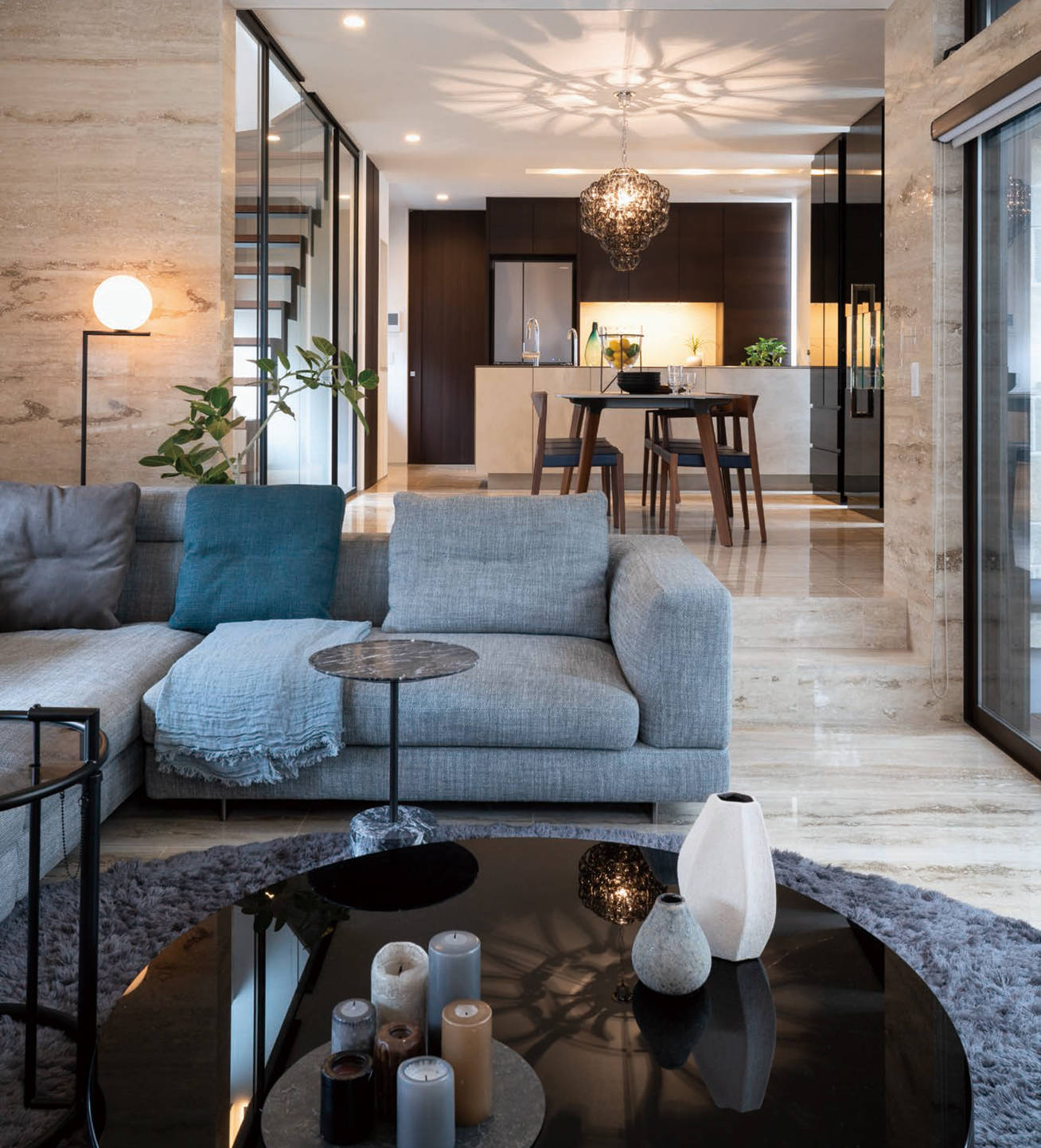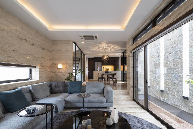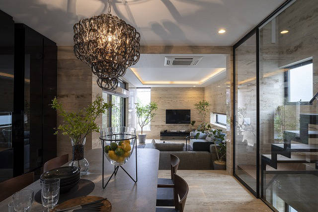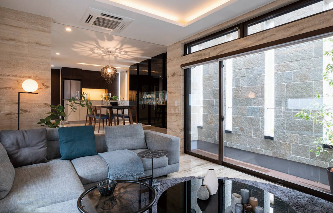 実際出来上がってみるとリビングの約2.8mの天井高さはスキップフロアにより強調され壁装飾のトラバーチン石貼りが重厚感をもち、程よいスケール感が造り出せたと自負している。