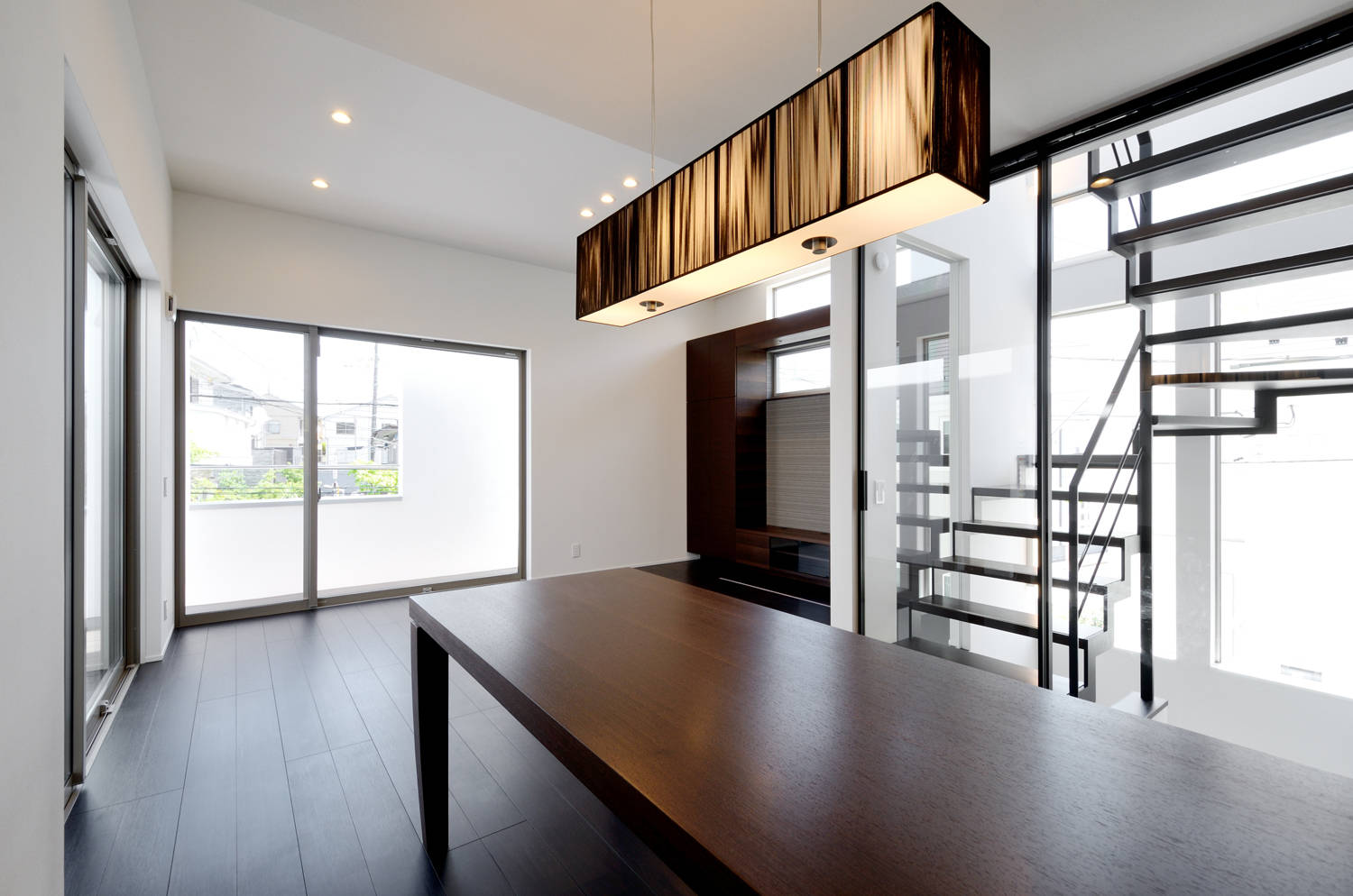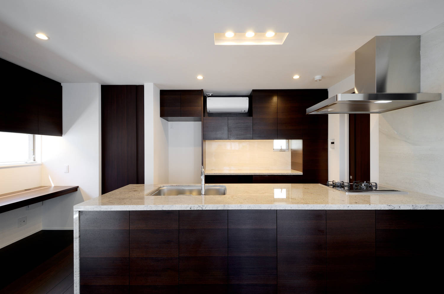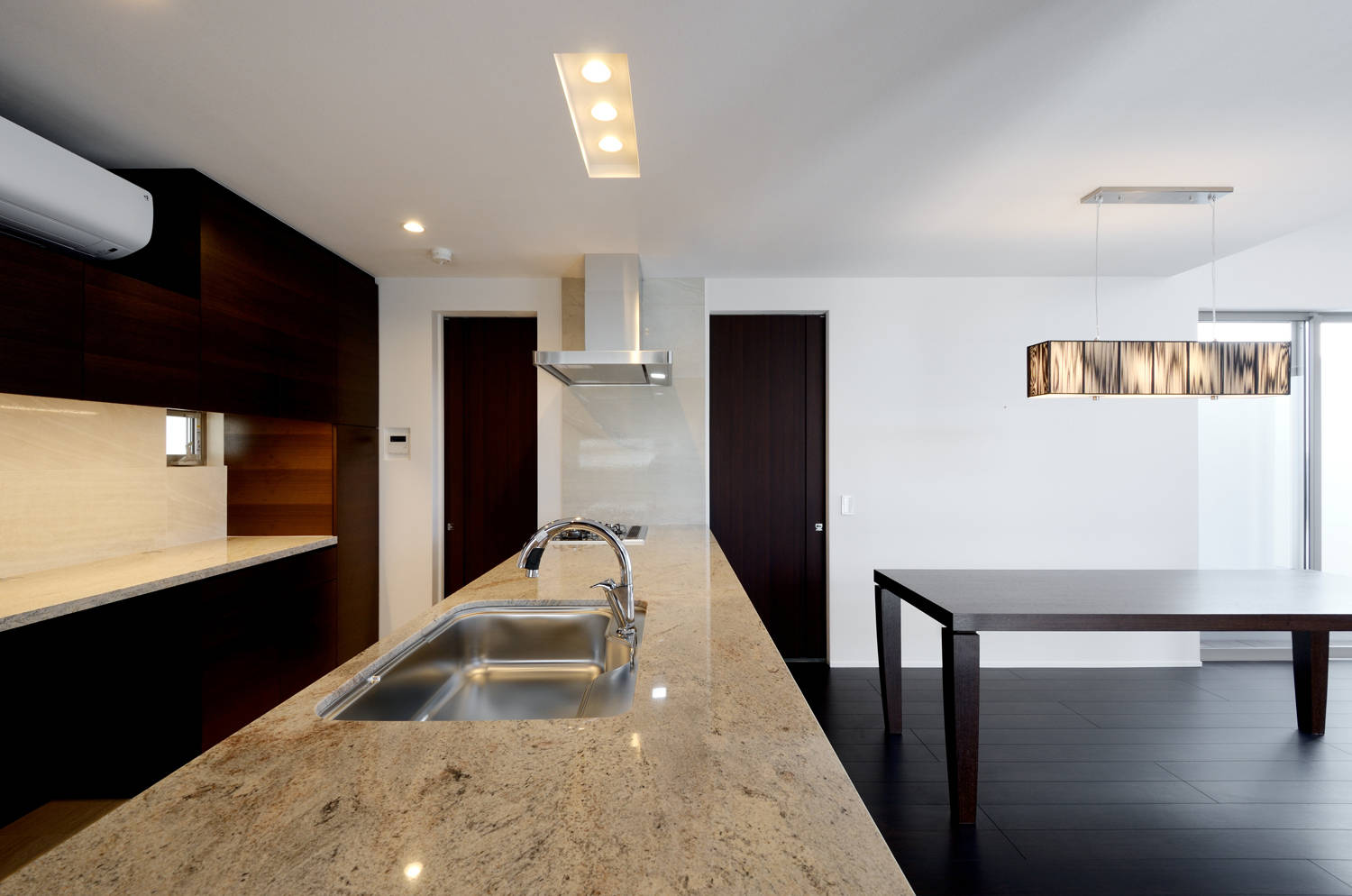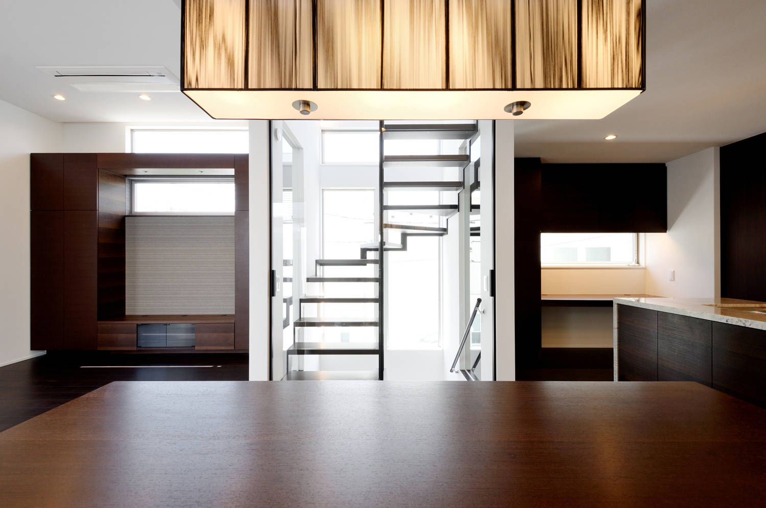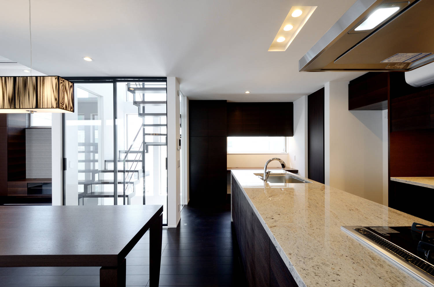 施主と打ち合わせを重ね、最終的にモノトーンに近いコントラストで構成された内装や大理石天板のオープンキッチンが雅な印象を与えている。愛着を持ってもらえる様に長い年月で変化する日常を少しでも豊かにするきっかけを潜ませたシンプルな家である。