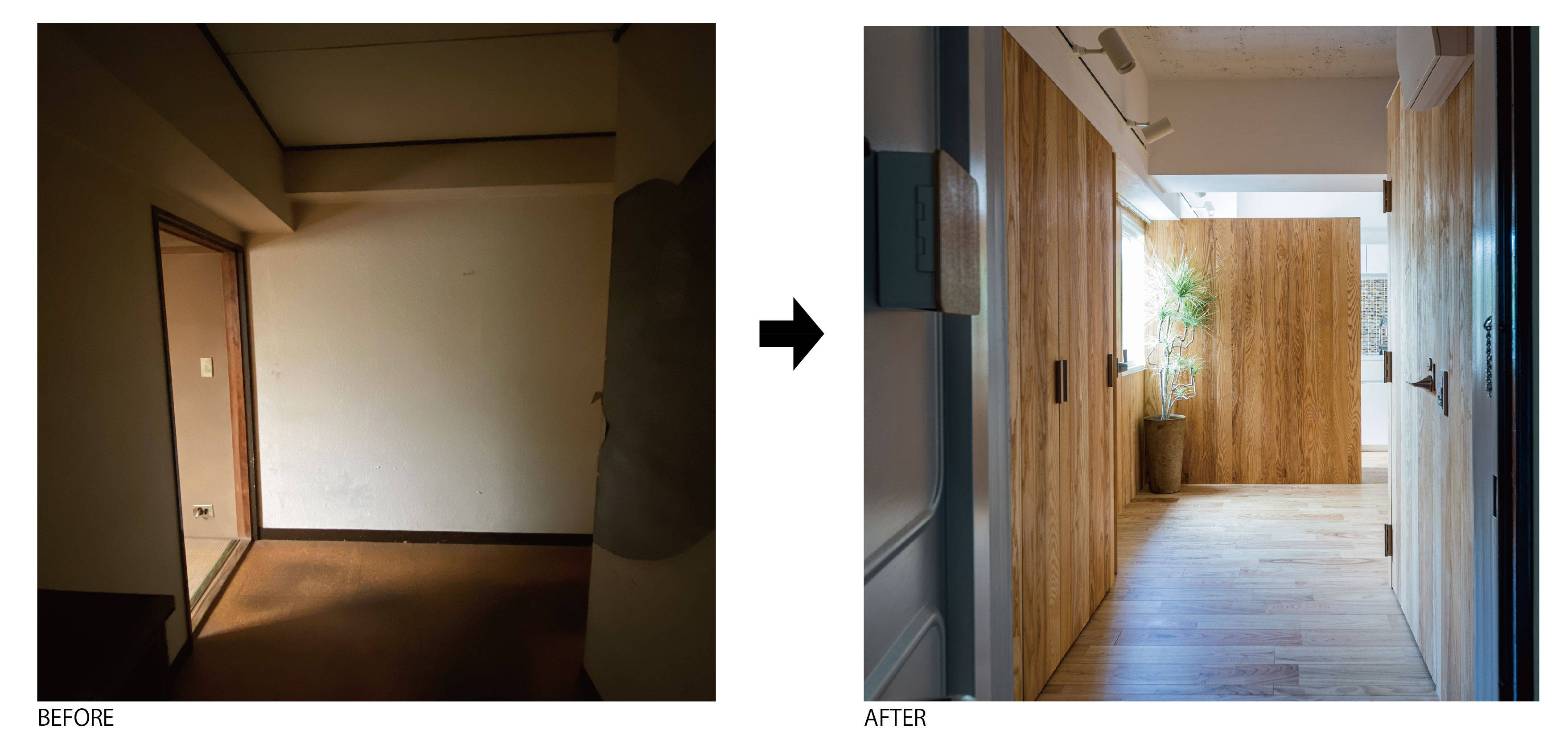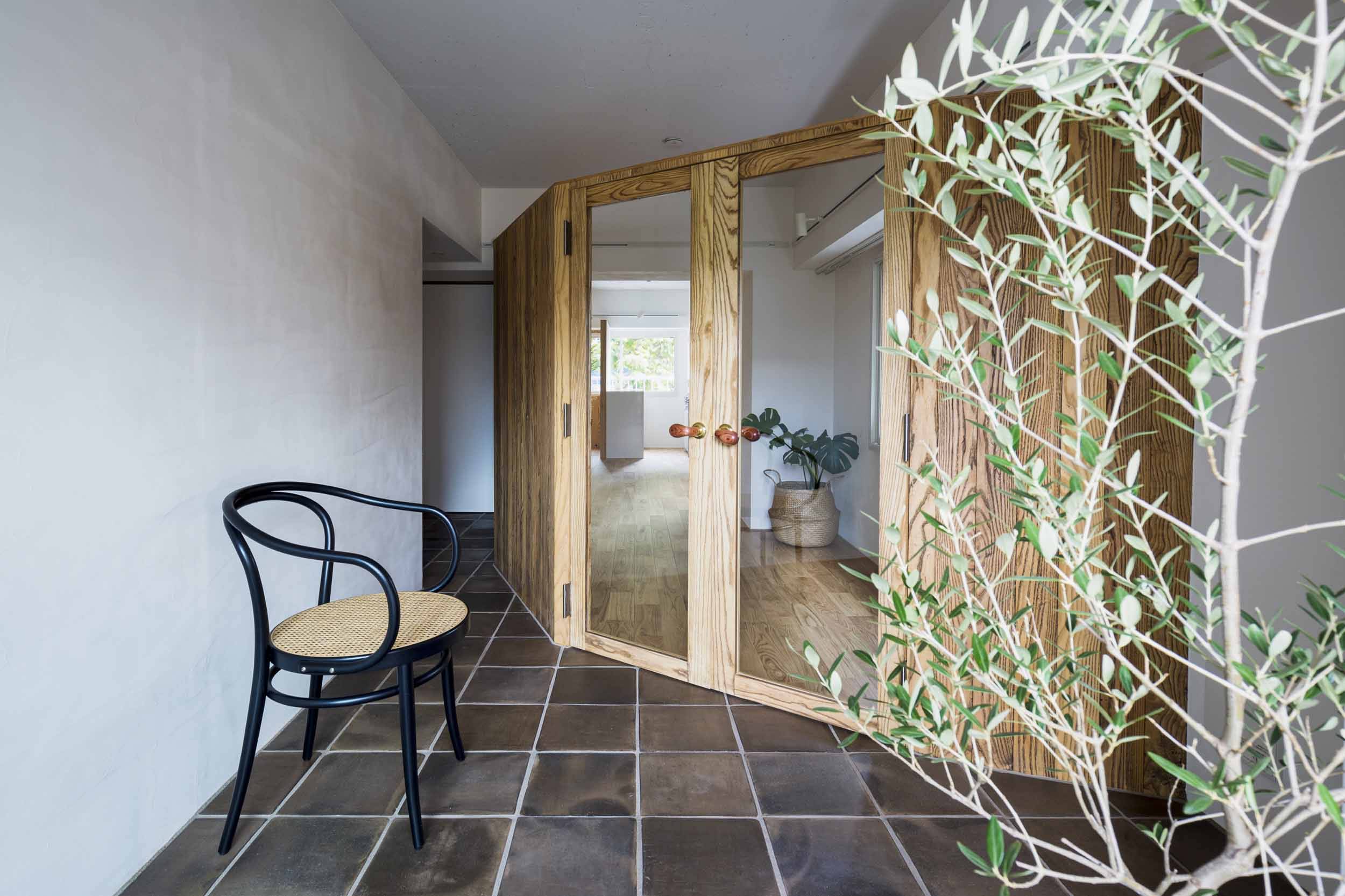 既存の住まいに閉鎖感をもたらしていた玄関の暗さ・バルコニーと離れたLDK・住み方を画一的にする数珠つなぎの間取りを解決する方策として、スケルトンにした住戸にS字状のパーティションを新しく配置した。玄関に立つと奥へ導かれ、他のスペースへのつながりが感じとれる。全体を横断するS字壁に木の質感を与えたことで、木のカーテンに包まれているような実感が得られる住空間となっている。