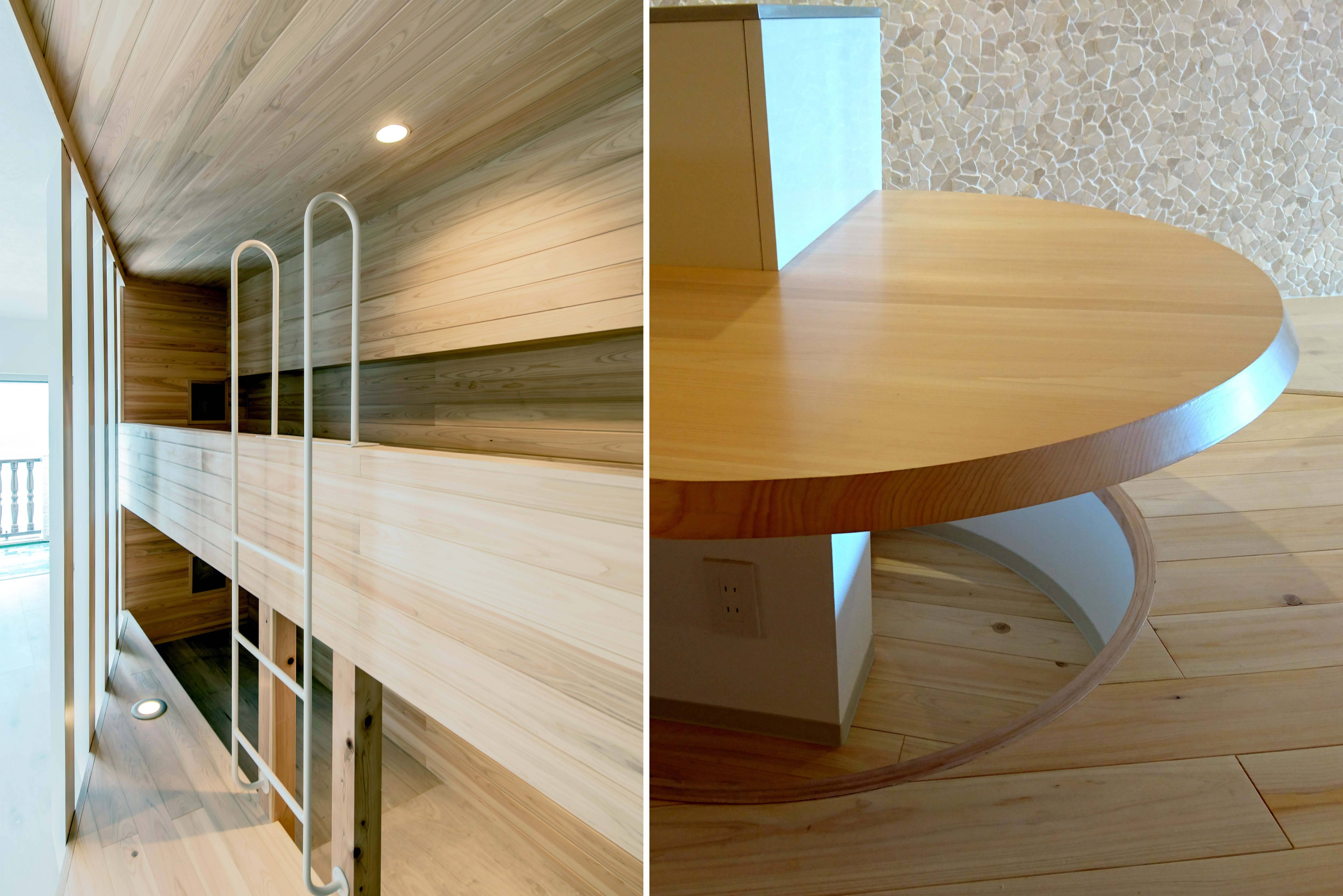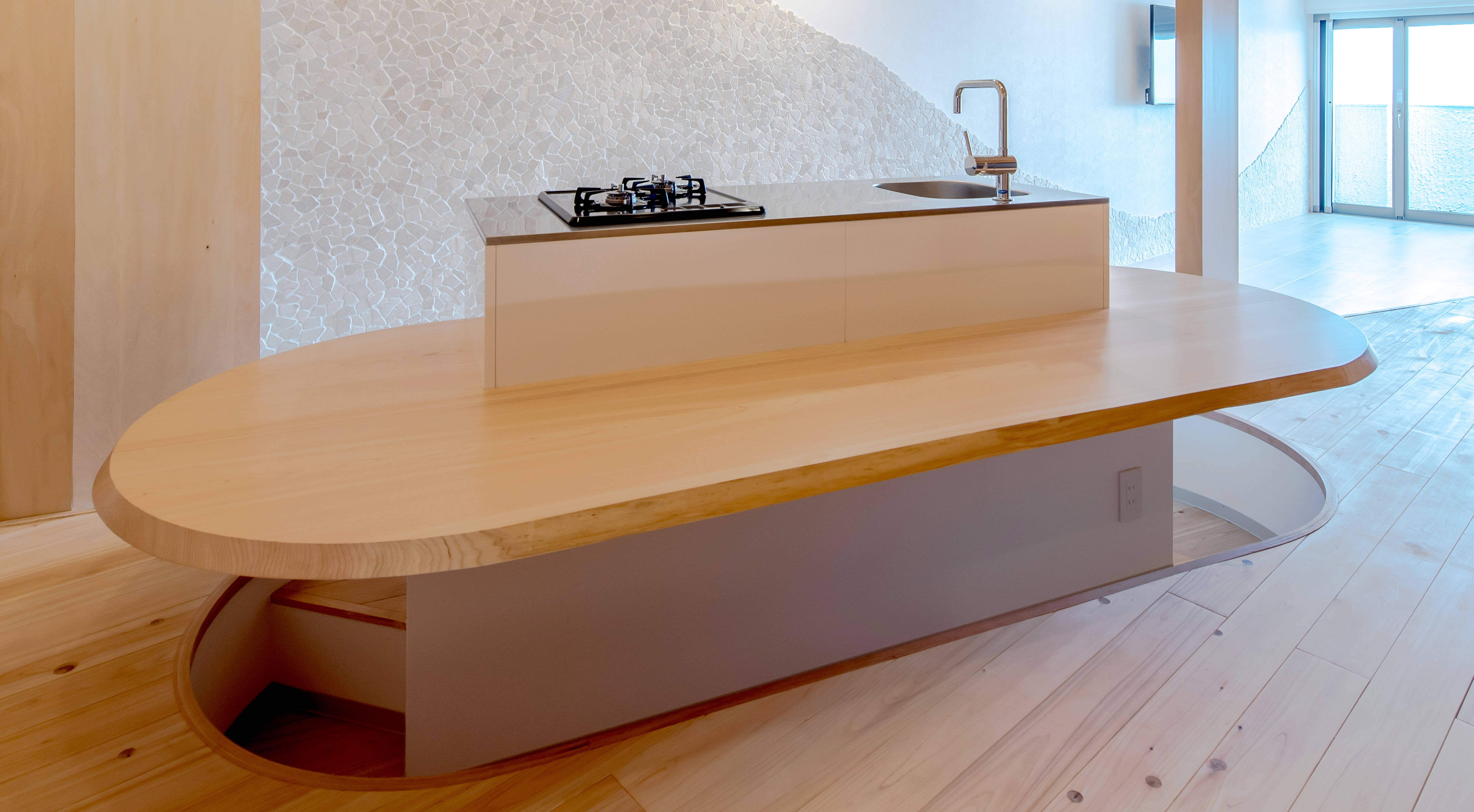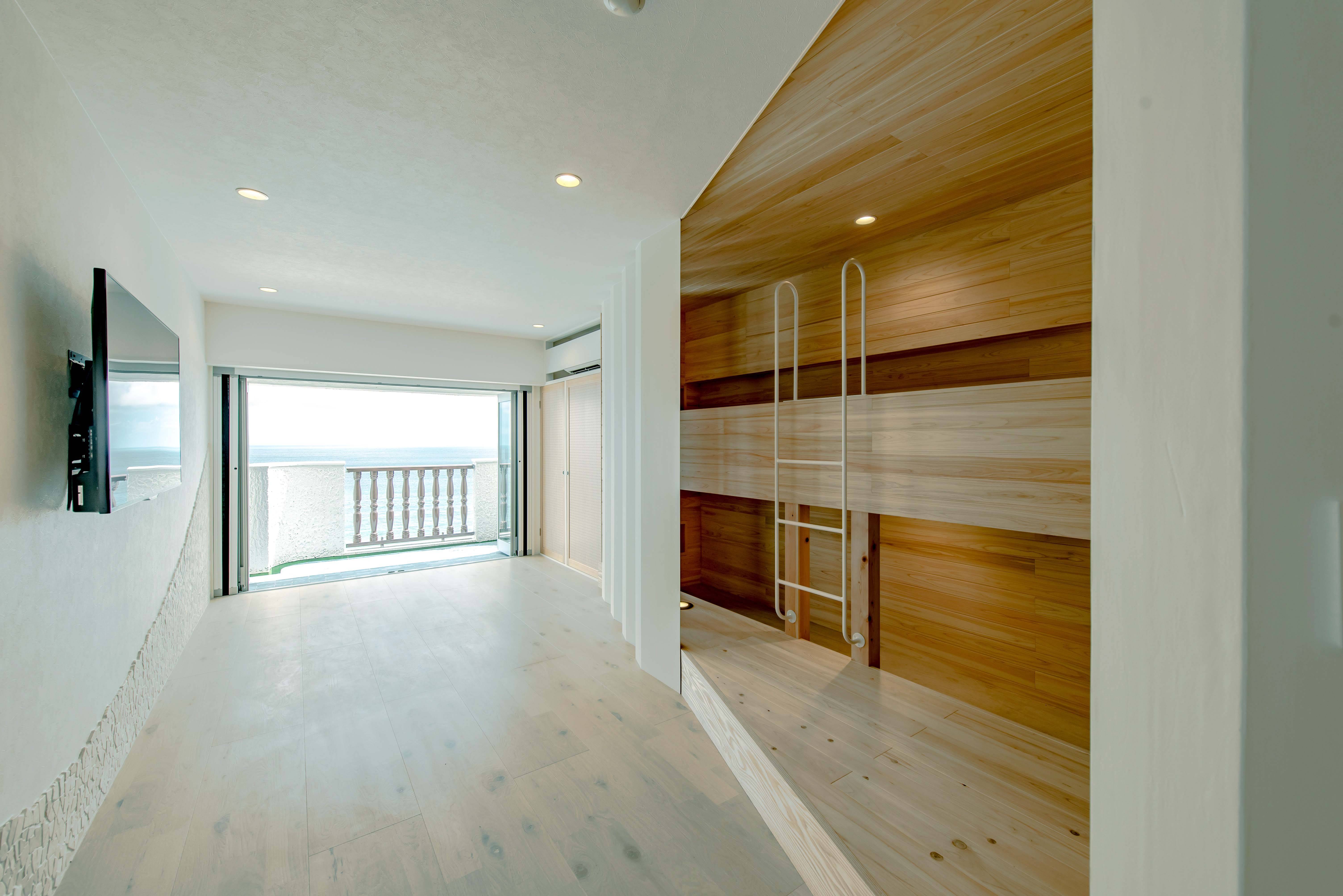 2家族の週末住宅としてシェアするセカンドハウスの計画。眼下に海が広がる高層マンションの一室を共同購入されたクライアントからの依頼は、大人数で集いやすく、海を近くに感じられる別荘らしい空間と地元工務店を見つけて工事する事。我々は現地に通いながら初めての地で設計監理を行った。腕の良い職人さんと良心的な価格、寛容な管理組合に支えられたプロジェクト。