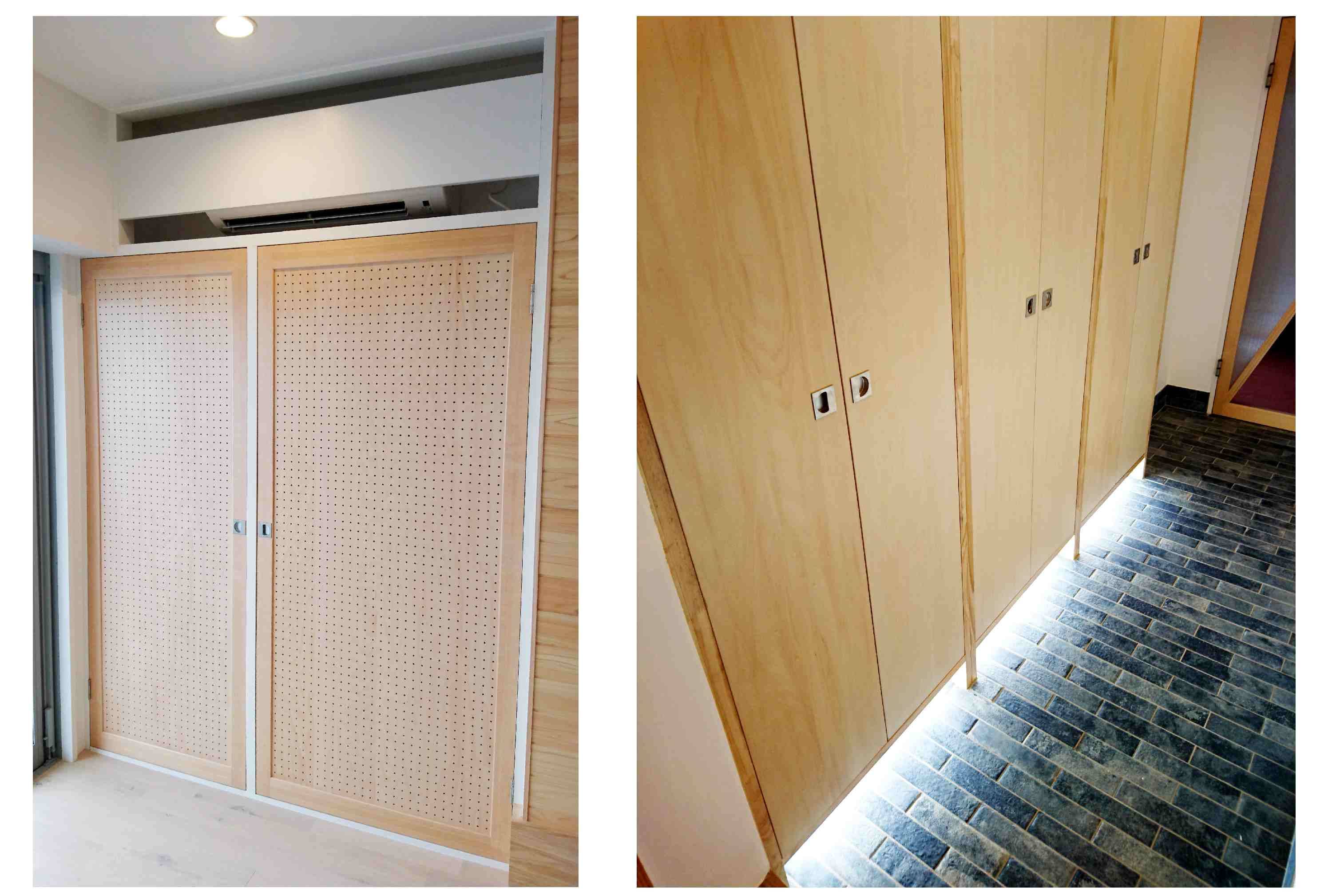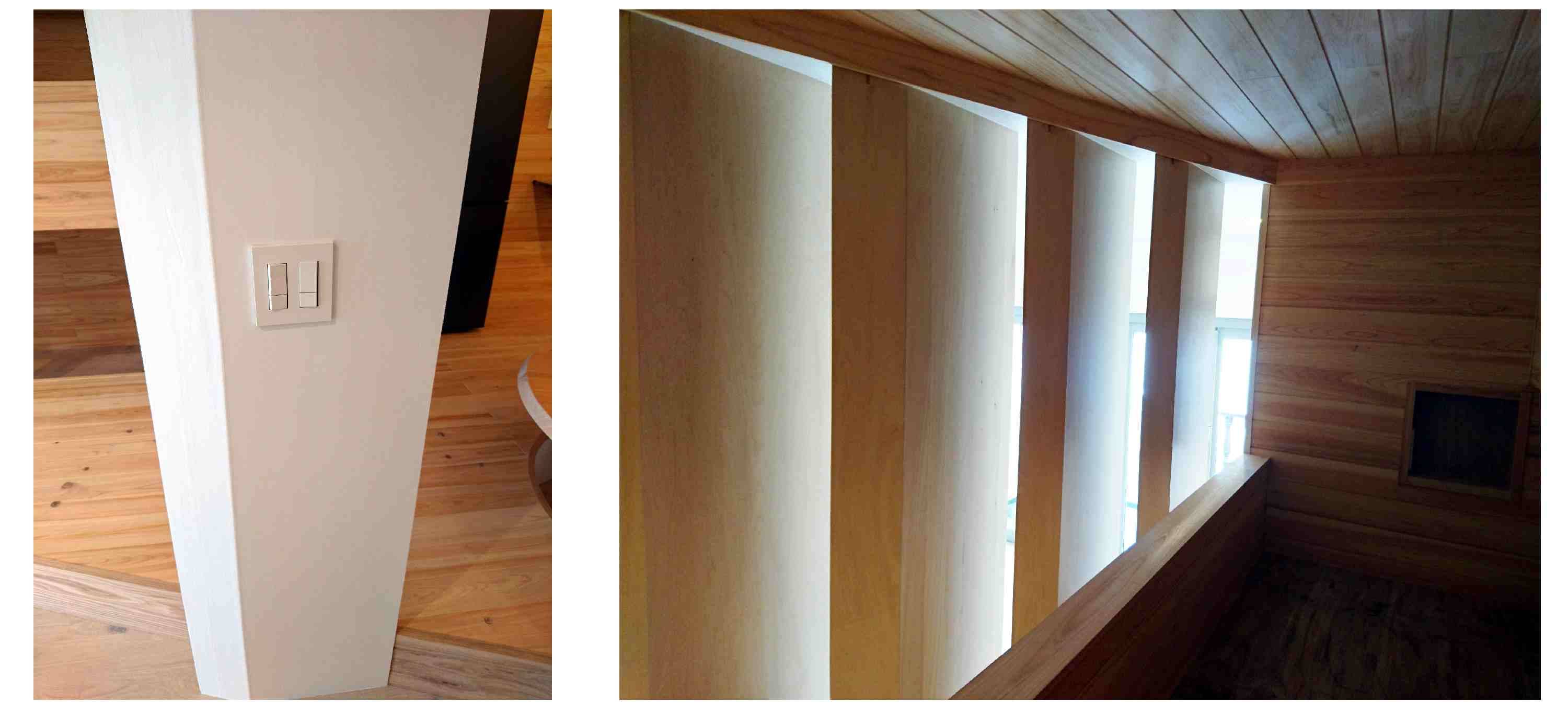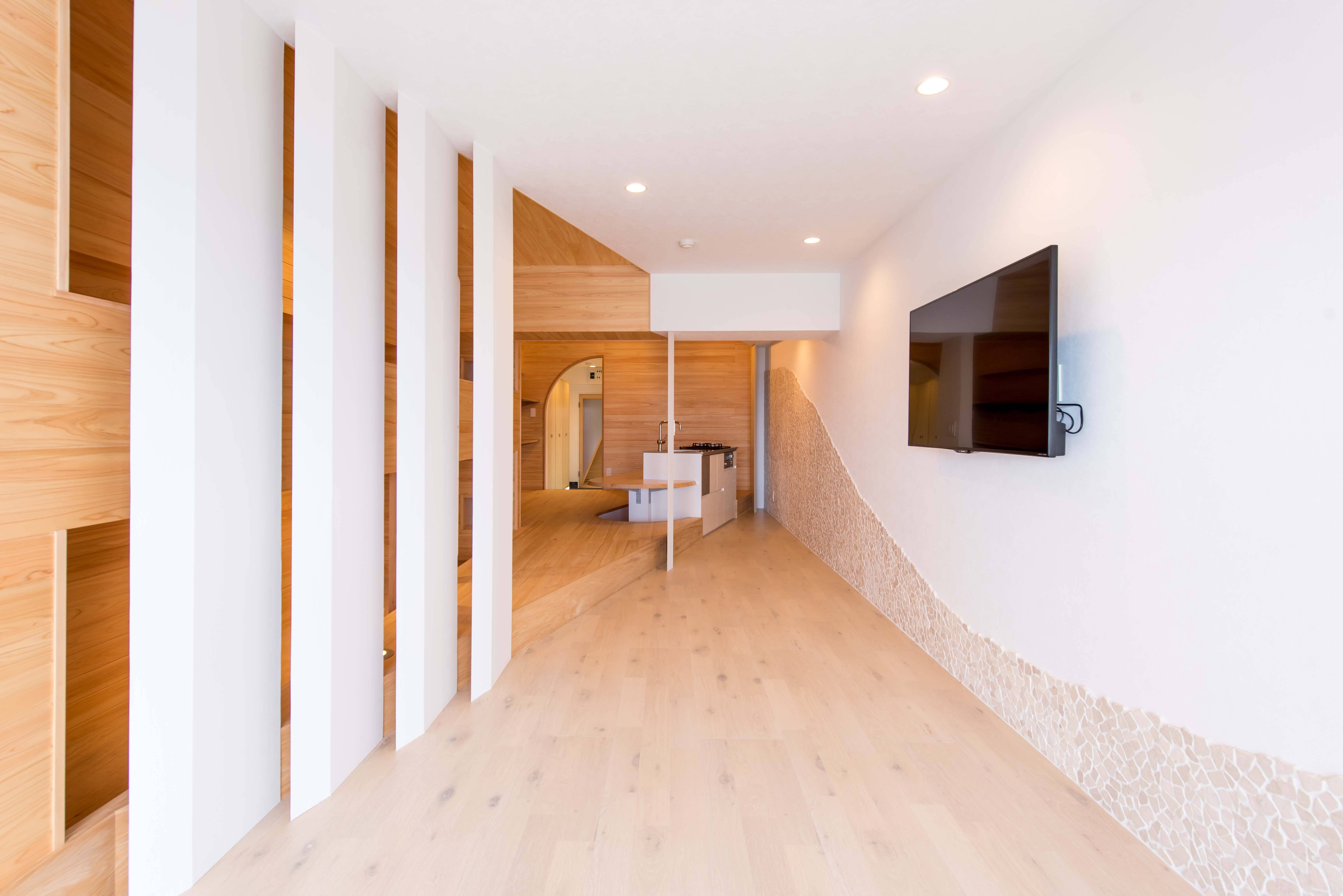 2家族の週末住宅としてシェアするセカンドハウスの計画。眼下に海が広がる高層マンションの一室を共同購入されたクライアントからの依頼は、大人数で集いやすく、海を近くに感じられる別荘らしい空間と地元工務店を見つけて工事する事。我々は現地に通いながら初めての地で設計監理を行った。腕の良い職人さんと良心的な価格、寛容な管理組合に支えられたプロジェクト。