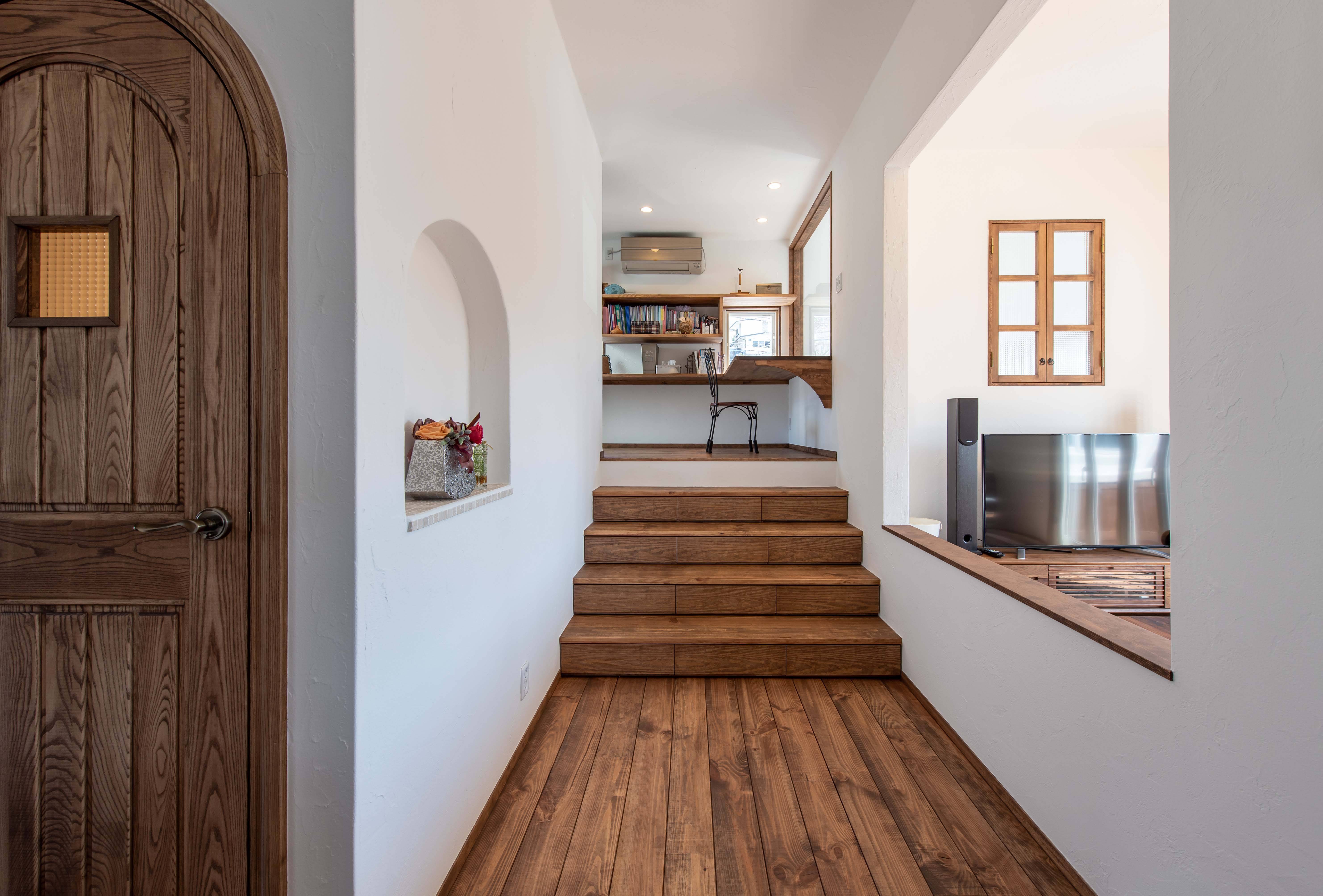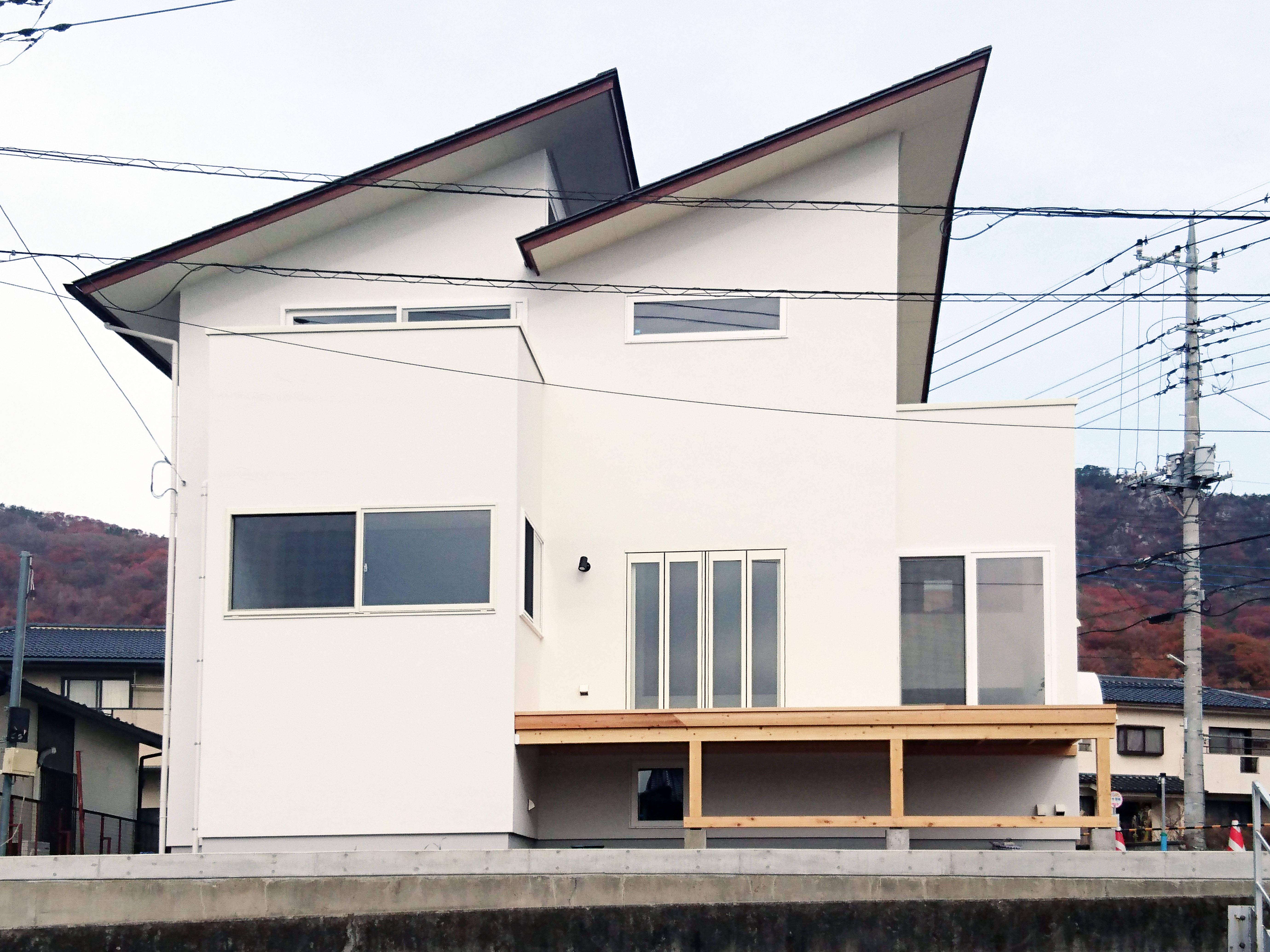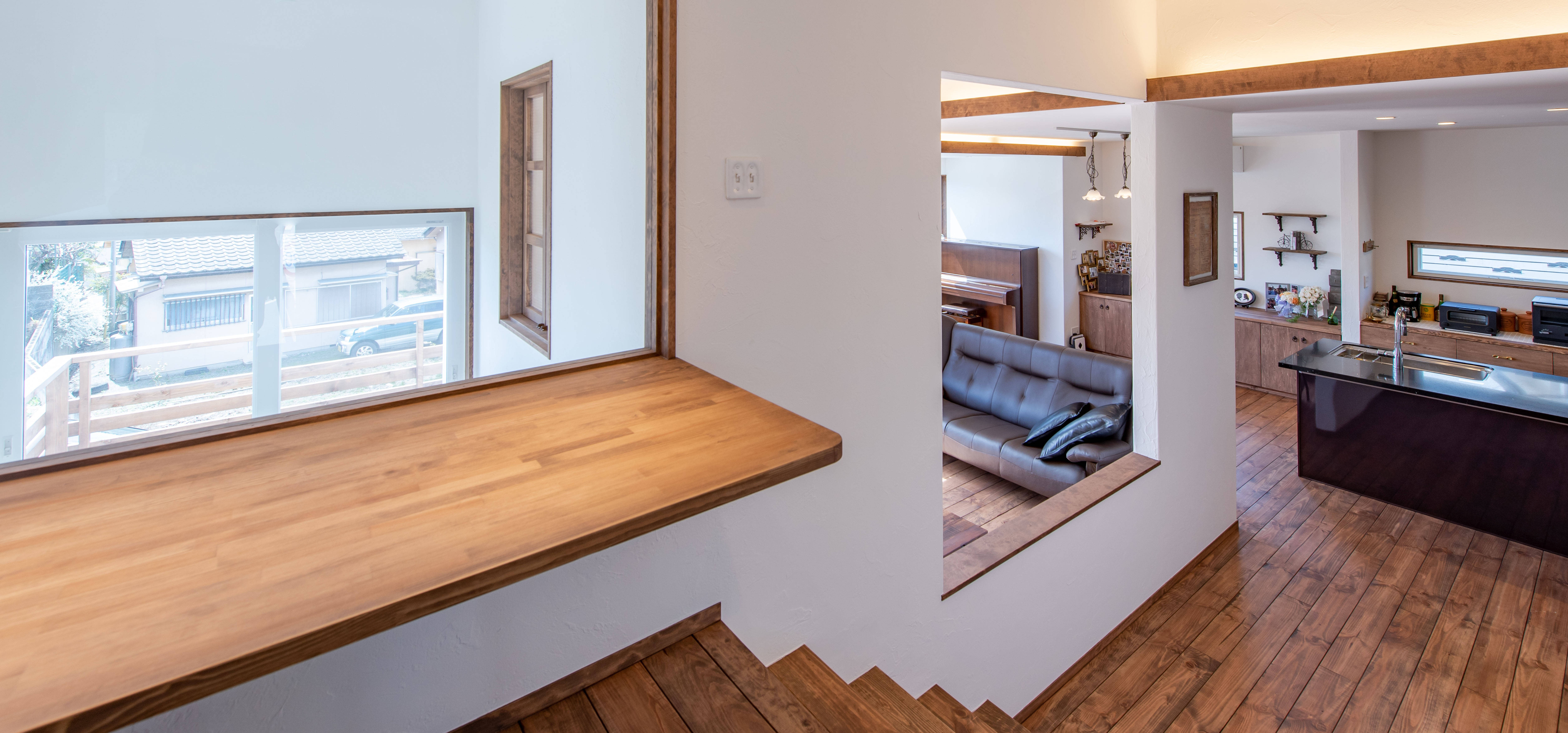 夫婦とお子様が住まう住宅で、市道沿いの日当たりの良い角地に計画された。既にご両親がお持ちだった高台の土地でしたが、1階を玄関から1.8m上げることで、住宅全体にプライバシー・明るさ・景色を良さが生み出されています。ご夫妻と設計担当者で様々な事例を見学に行くなどしてイメージを共有し、理想の設計内容が固まってきたところで複数の工務店をあたり、予算とローンの調整、工事、3年の期間を経ての竣工となりました。