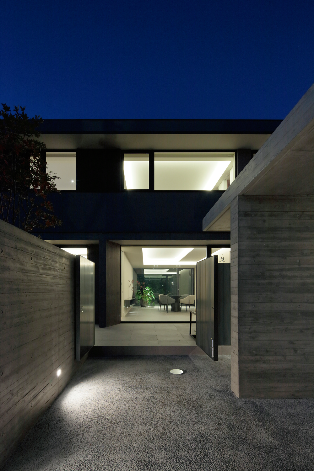 シャープな形に黒いガルバリウム鋼板の外壁が印象的な住宅で...