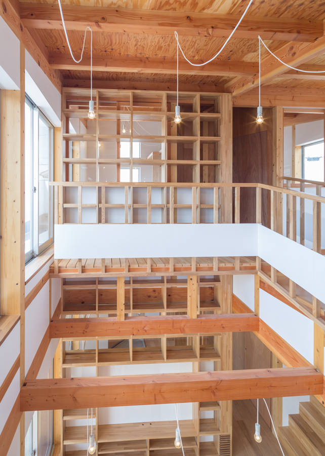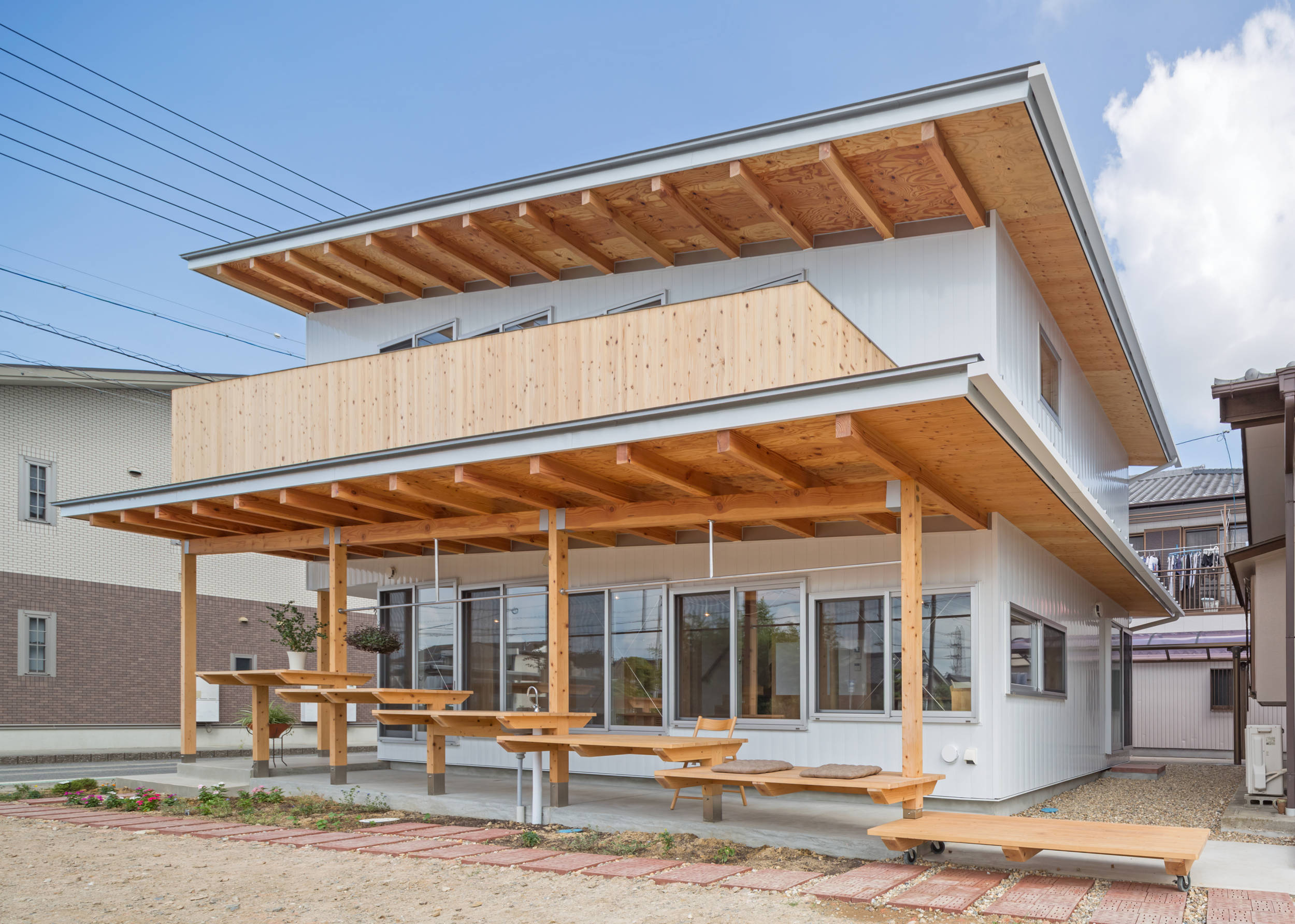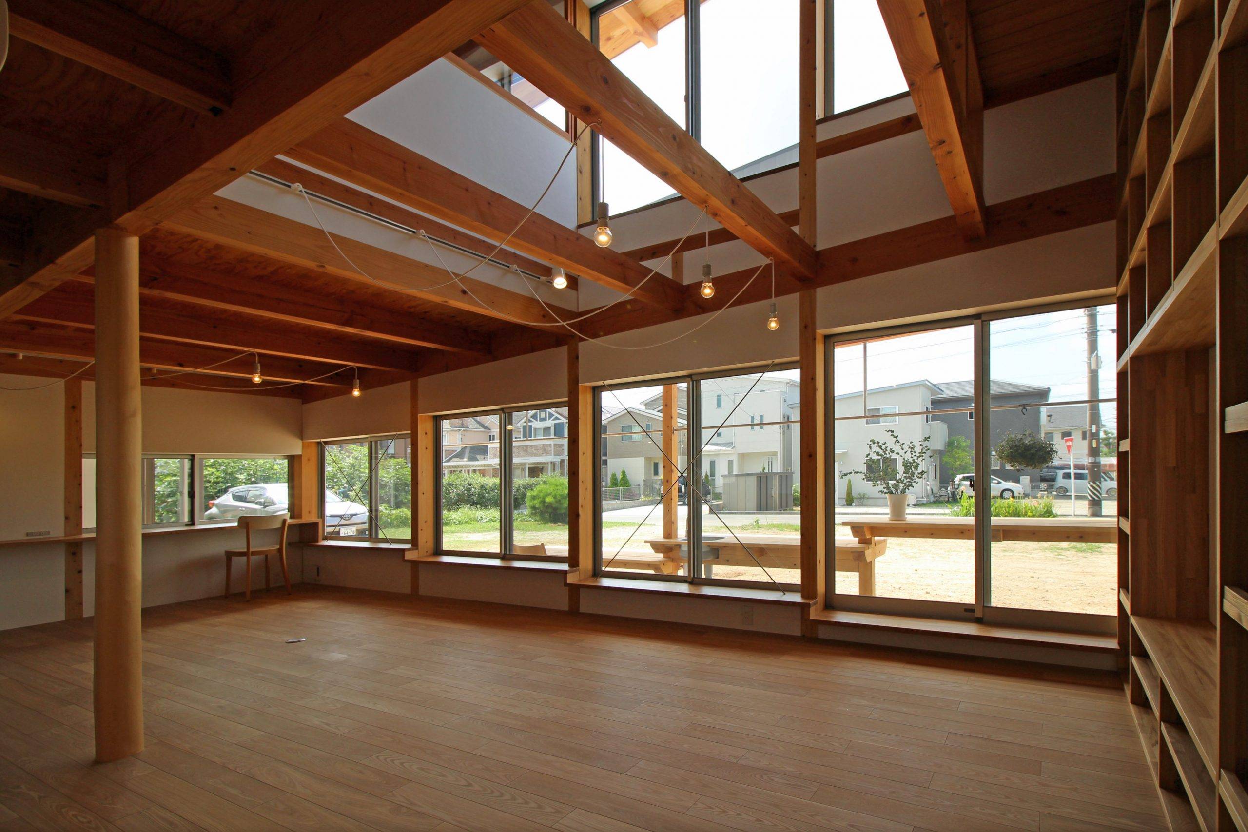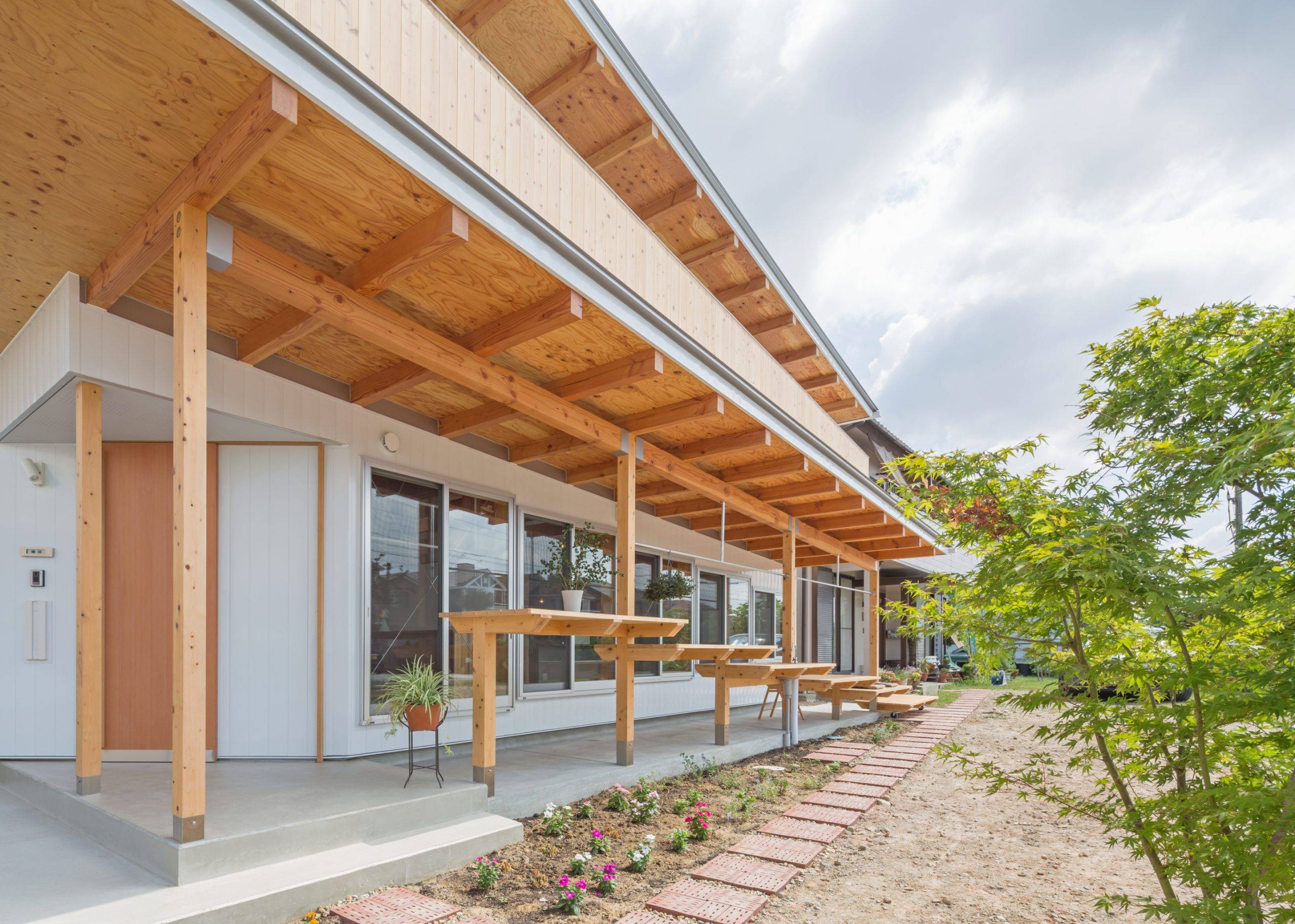 このようにして屋根と床の勾配が、グラデーショナルに天井高の変わる内部空間と軒下空間を同時に生み出し、母屋や庭とつながっていく。外観と内部空間が分離しない建築。片流れとは、その名のとおり「流れ」を担保する汎用な形式である。建築は一般的に流れを留めるために存在する。陽を遮り、風を避けて、雨から守る。けれどここでは、太陽の光や風、雨や雪をスムーズに受け流していく。そして、息子家族の視線や意識、活動も同時に母屋へ向かって流れることを促す。留めずに、流す。そんな状態を大変にシンプルで汎用な形式を用いながらも、新しいあり方で実現しようと試みている。