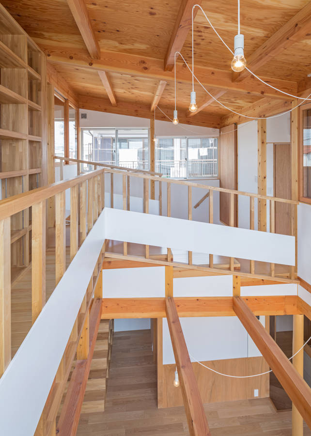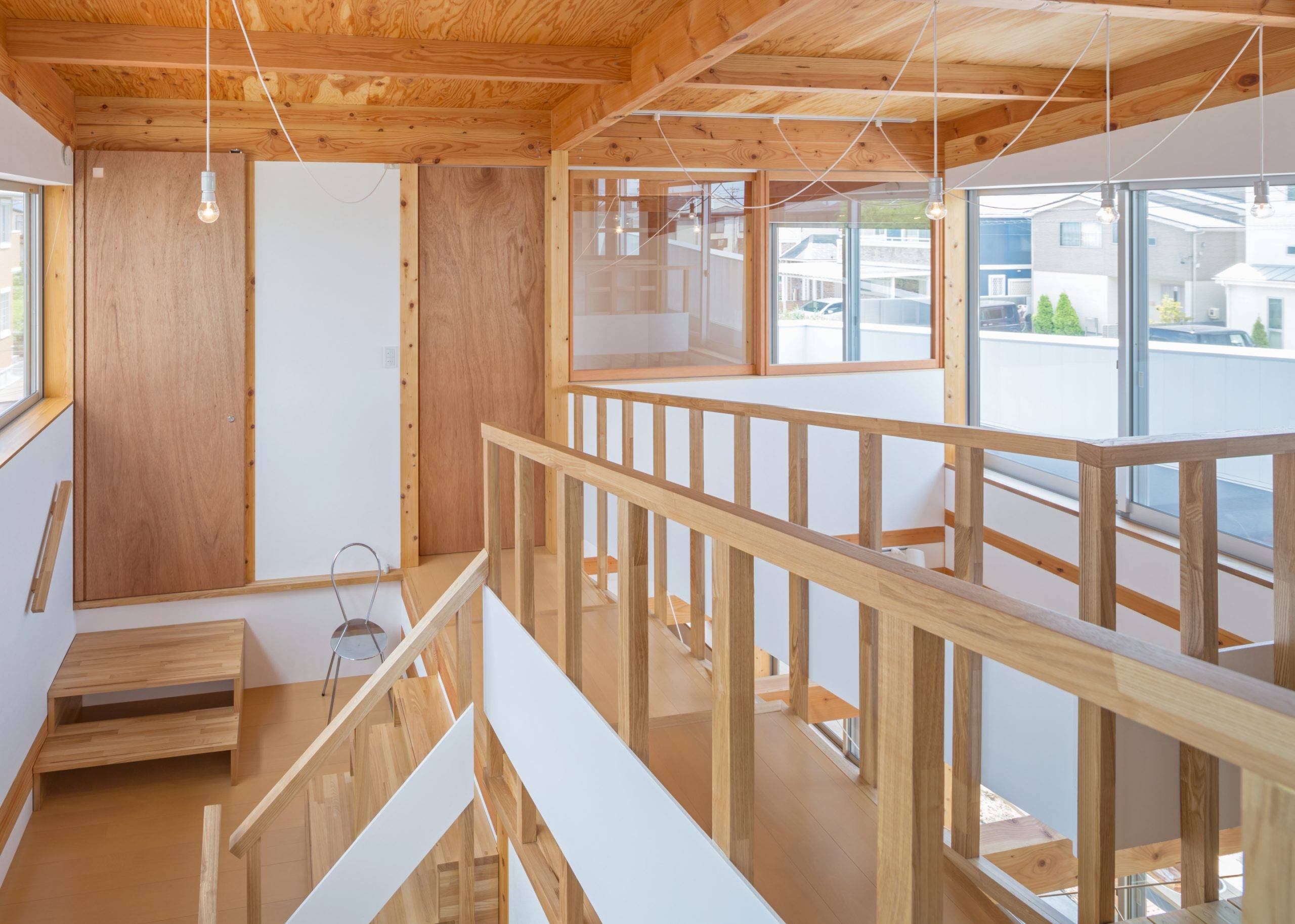 屋根は少し急な勾配15/100に傾けて、2階の床梁は少し緩やかな勾配5/10でつくった。(その中間にあるバルコニーの手摺壁は10/100。)急勾配は雨水や風を滑らかに処理することができ、緩勾配は母屋への視線や活動の流れを柔らかくゆったりと関係付ける。また屋根の勾配と2階床の勾配が異なるため、場所によってさまざまな室内環境が生まれていく。天井が高く道路に面した開放性の高い西側、だんだん低くなる天井とともに母屋や地面との距離が近くなる東側、というように。