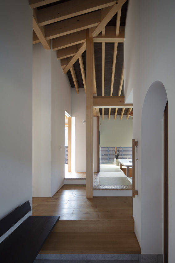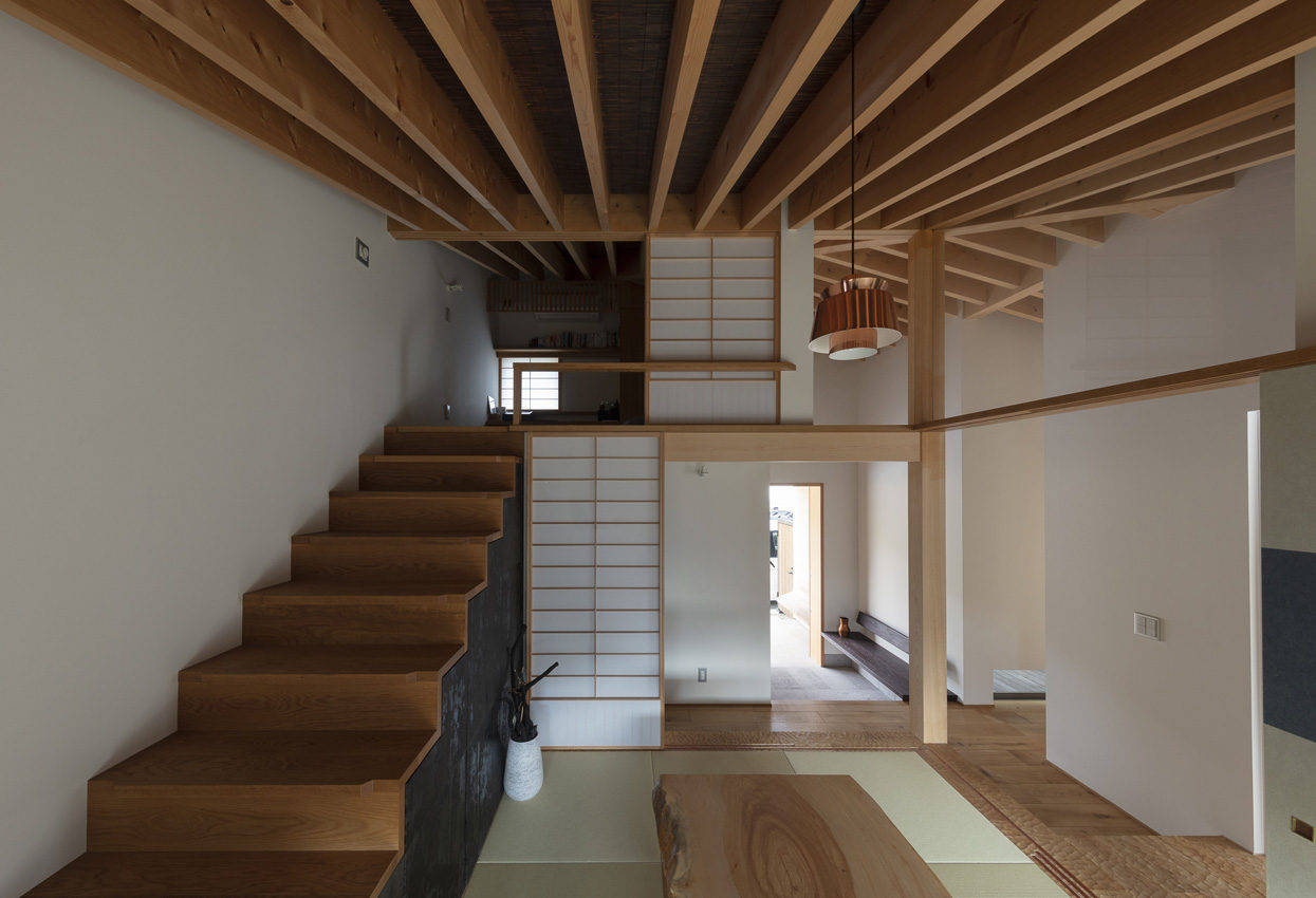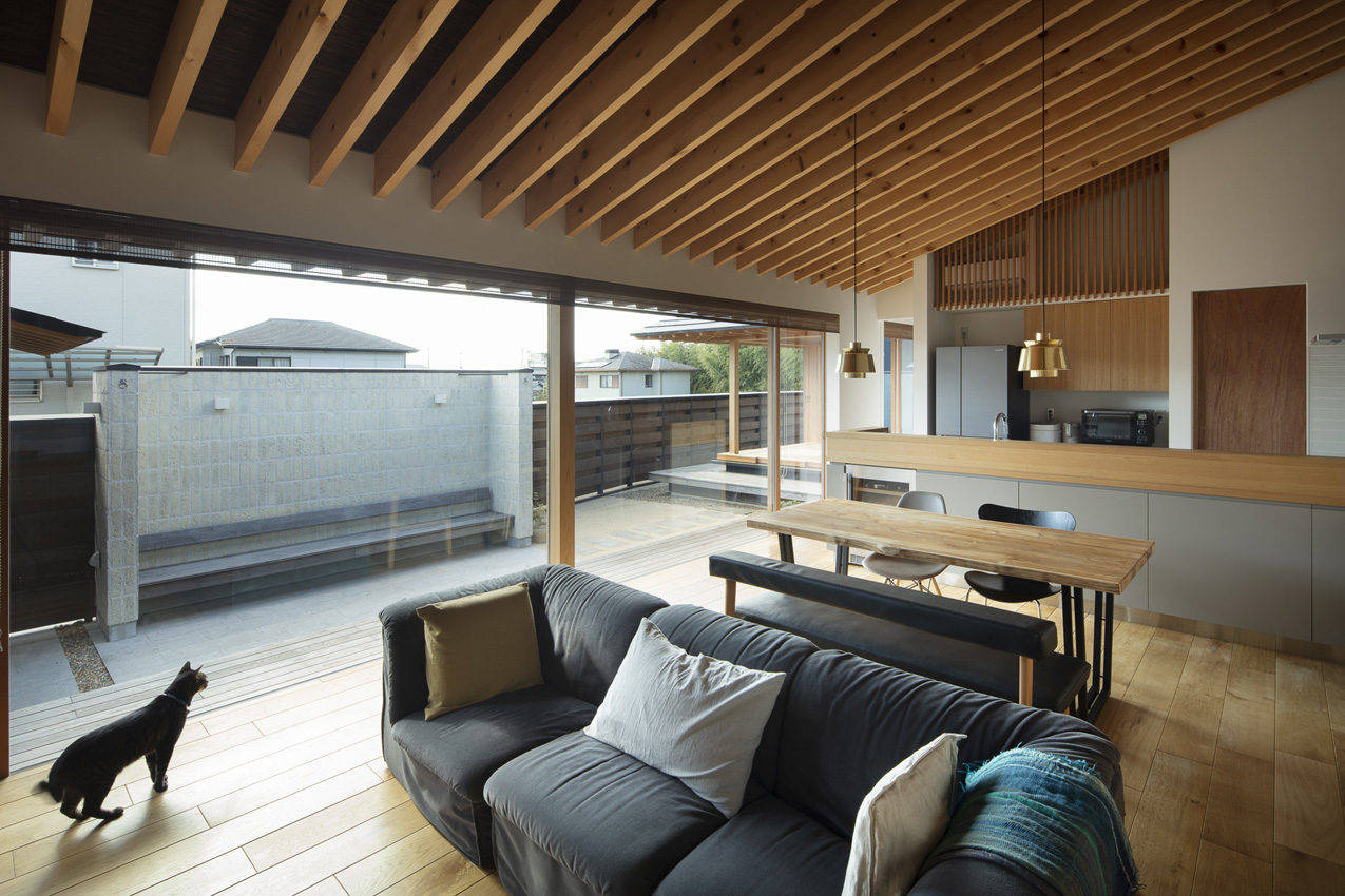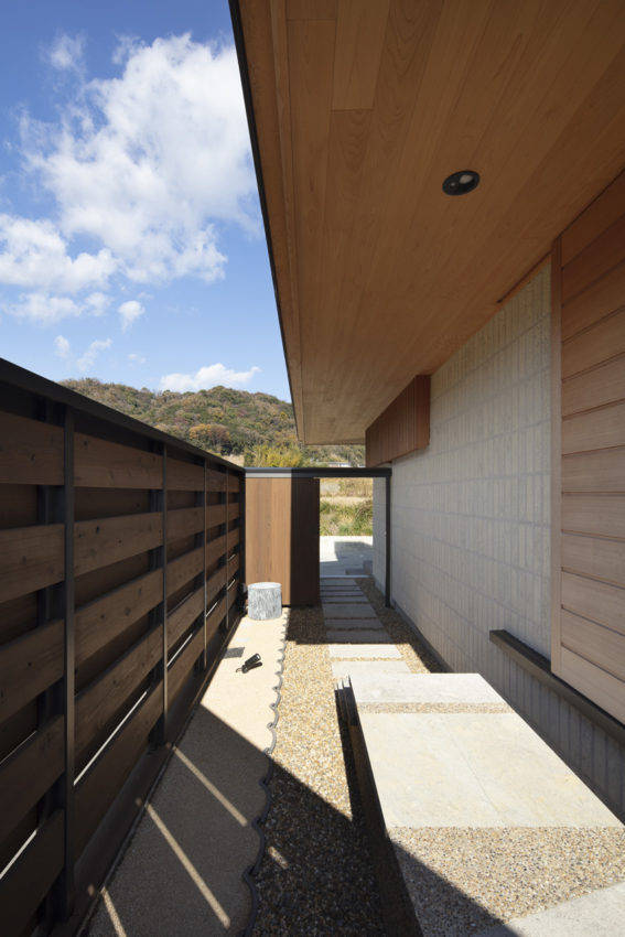 形態的な特徴は、伸びやかに連続する濡縁と庇、室内から軒先へと張り出す現しの垂木、軒を低く抑えたプロポーション、大開口の木製建具、、、機能的な特徴は、造作キッチンと繋がる家事動線、坪庭に面した露天風呂感覚の浴室、和室と一体となったロフト空間、ベンチや流しを設えたBBQテラス、外動線としての露地庭、基礎の輻射熱を活かして家全体を暖める蓄熱式床暖房、、、素材的な特徴は、木の産地ならではの紀州ヒノキ、天井に貼られた染極細葭茶糸編、重厚な幅広オーク床材、和室縁甲板のナグリ、神代の趣感じるウッドデッキ、素朴な風合いの手づくりタイル、柔らかな表情の芦野石、大津磨きの左官、華やかで重厚な漆和紙、市松の襖、そっと忍ばせた真鍮や和風金物、エッジの利いた板金、、、等々。大工、職人、素材生産者方々の技術や心意気を紡いだ住宅です。