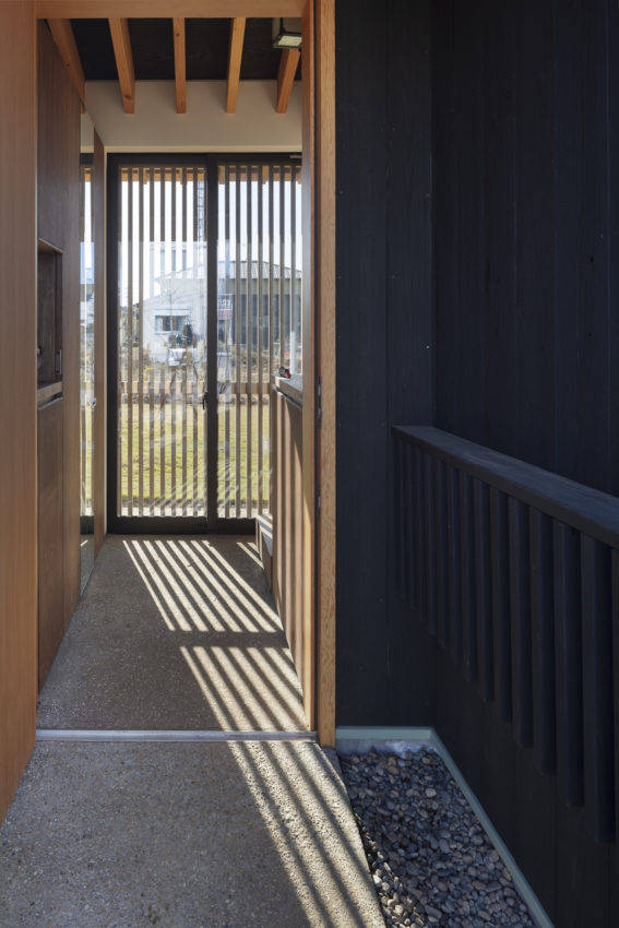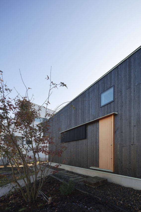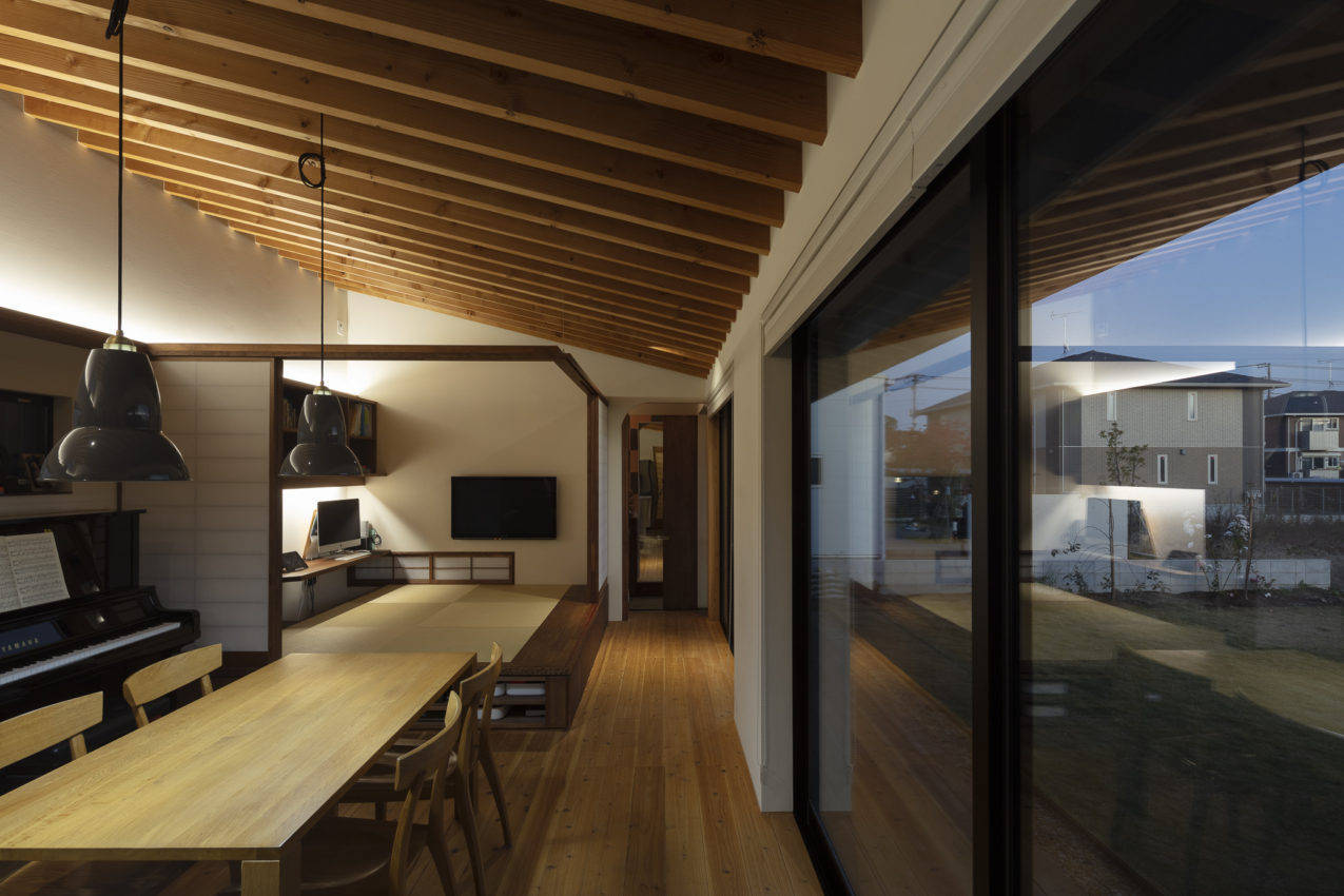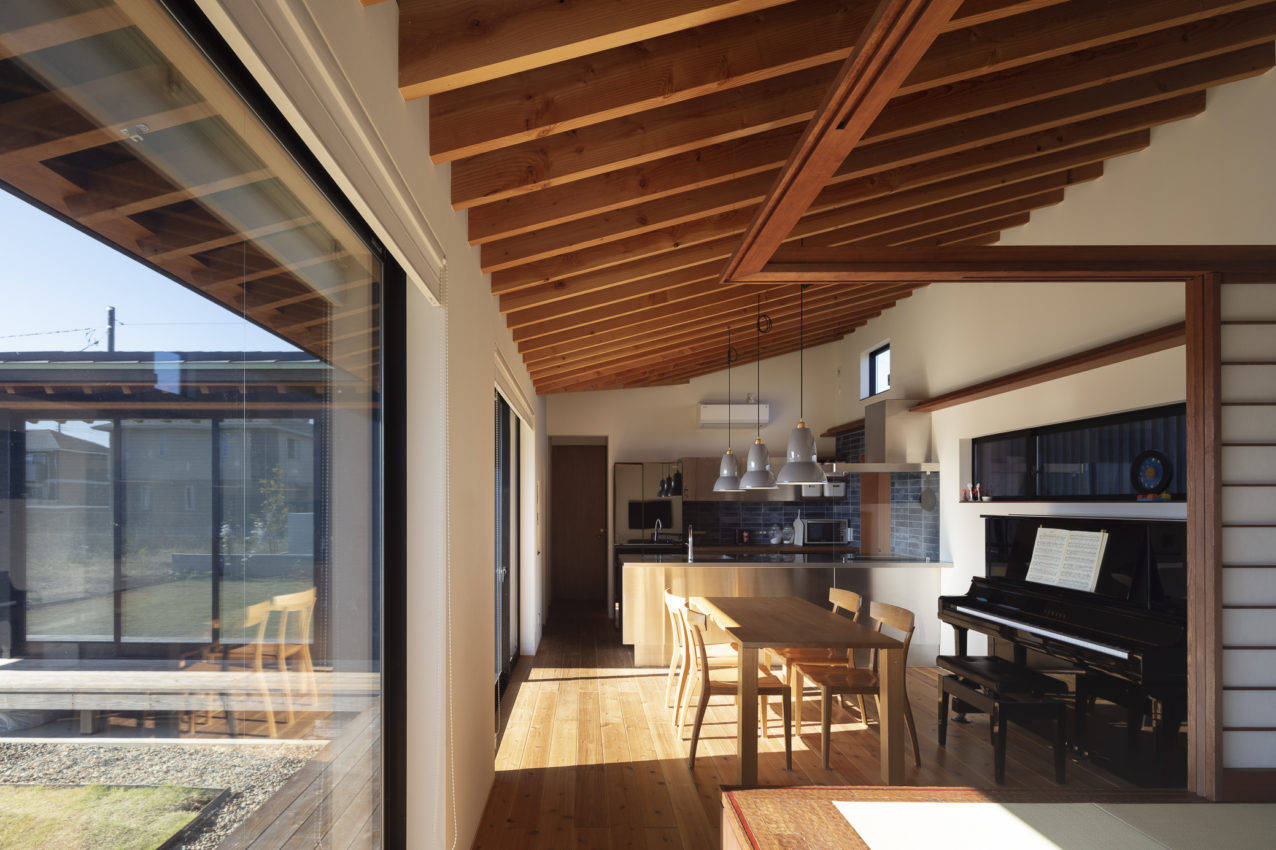 家族構成は、夫婦二人+子供三人。縁側が欲しい、子供は各自個室、小上がりの畳の間(2人寝れる客間)が欲しい、アップライトを置きたい、ハーフバスが良い、オールステンレスの対面式キッチンが良い、使い勝手の良い収納計画、床は厚30mmの無垢、外壁は焼杉、等々。室内から軒先へと伸びる垂木は現し、大きな屋根が家族の夢を包み込んでいます。