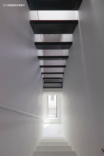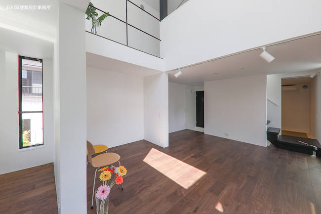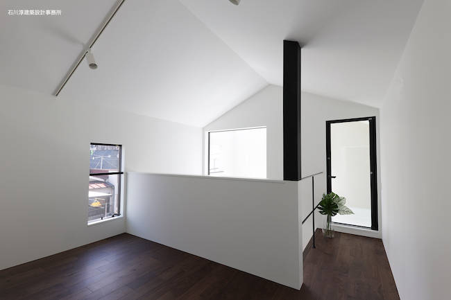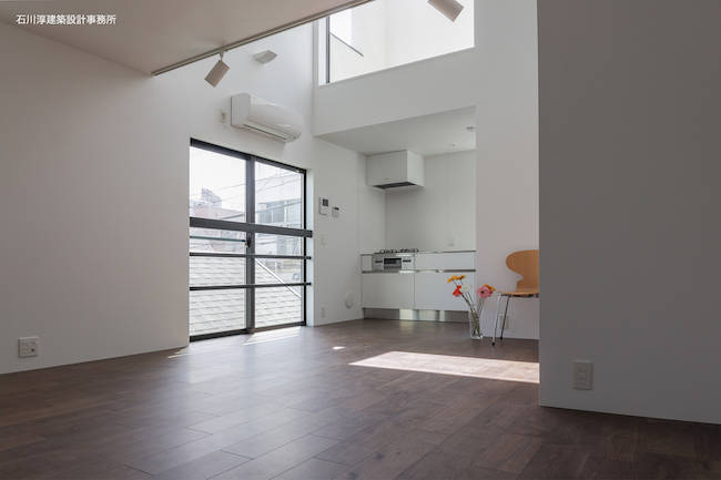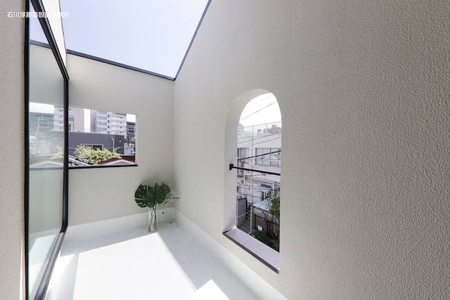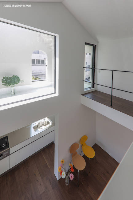 外観正面は幅狭背高のプロポーションにお施主様のご希望の三角屋根を載せたペンシル型の輪郭です。アーチ型の開口は3階建てに必要な非常用進入口をきれいに納めるための工夫で、その奥には光を取り入れるバルコニーがあります。外観で特徴的な2つのドアは、住宅用とアトリエ用で、その仕上げはコルテン鋼のような風合いの薄型のセメント板です。LDKは2階にあり、上部を吹き抜けにして3階レベルのバルコニーから光を取り込んでいます。4.5m幅の道路の対岸にはには大きな建物がありますが、バルコニーと吹抜の効果により、リビングのプライバシーを守りながら、開放的で明るいリビングを作り上げました。