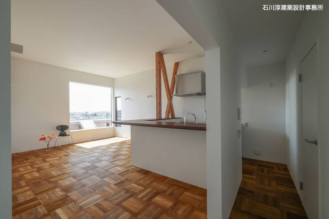 キッチンは「昭和の喫茶店のカウンターみたいにしたい」というご希望で木目を生かした茶色に着色し、床材も昭和感あるパーケットフローリングを使いました。