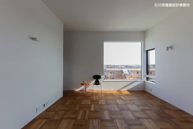 眺望を確保するため、LDKは2階に配置しましたが、南側に大開口を設けるか、ベランダを配置するか迷った末、大きな硝子FIX窓案を採用し「展望台」のような体験が出来るリビングにしました。