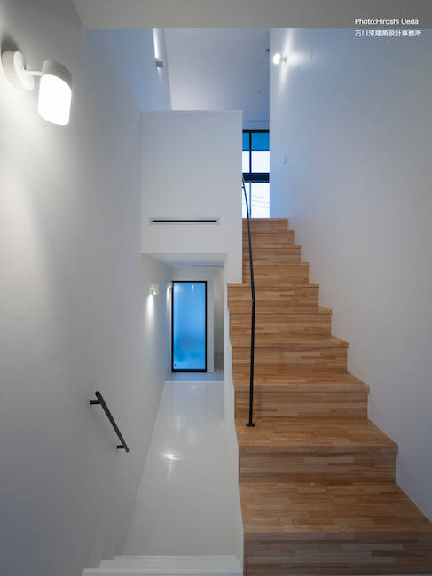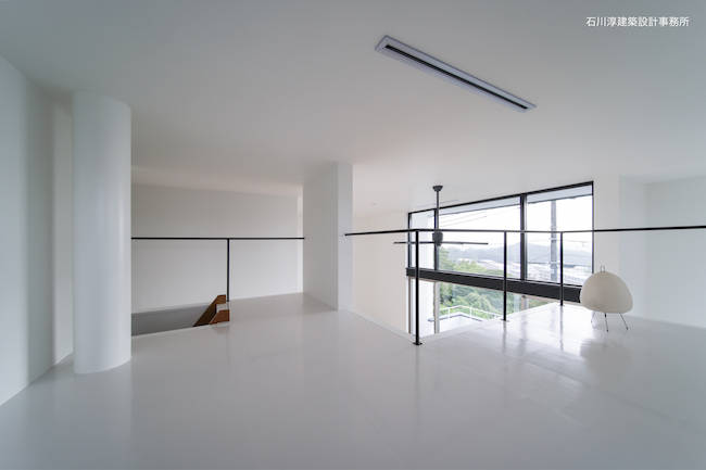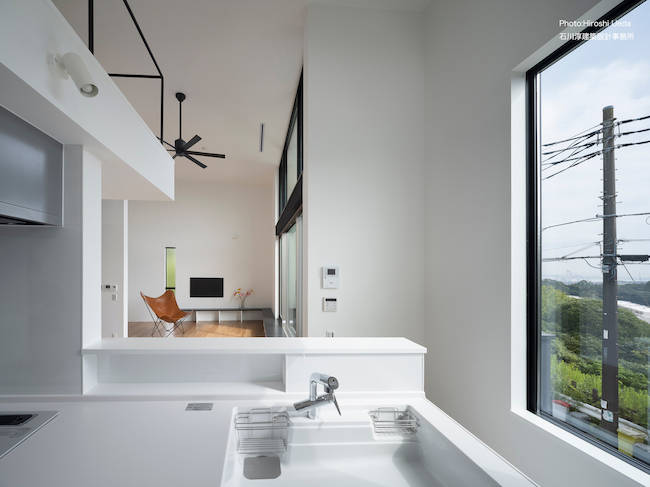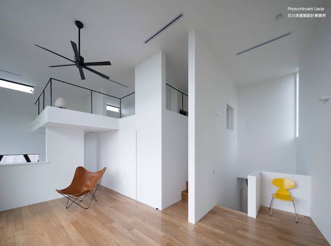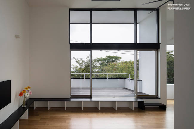 そして、2つ入り口をつなぐようにピロティを彫り込み、外作業スペースもピロティ部分に作りました。内部の断面構成はスキップフロア式で玄関から半層あがって主寝室とファミリークローゼットを置き、さらに半層あがって2階リビングがあります。2階リビングには東京湾を見渡すデッキベランダを設け、開放的な空間としています。さらにここから半層上がって、子供室と予備室があり、さらに数段の階段を上がってロフト空間が広がります。