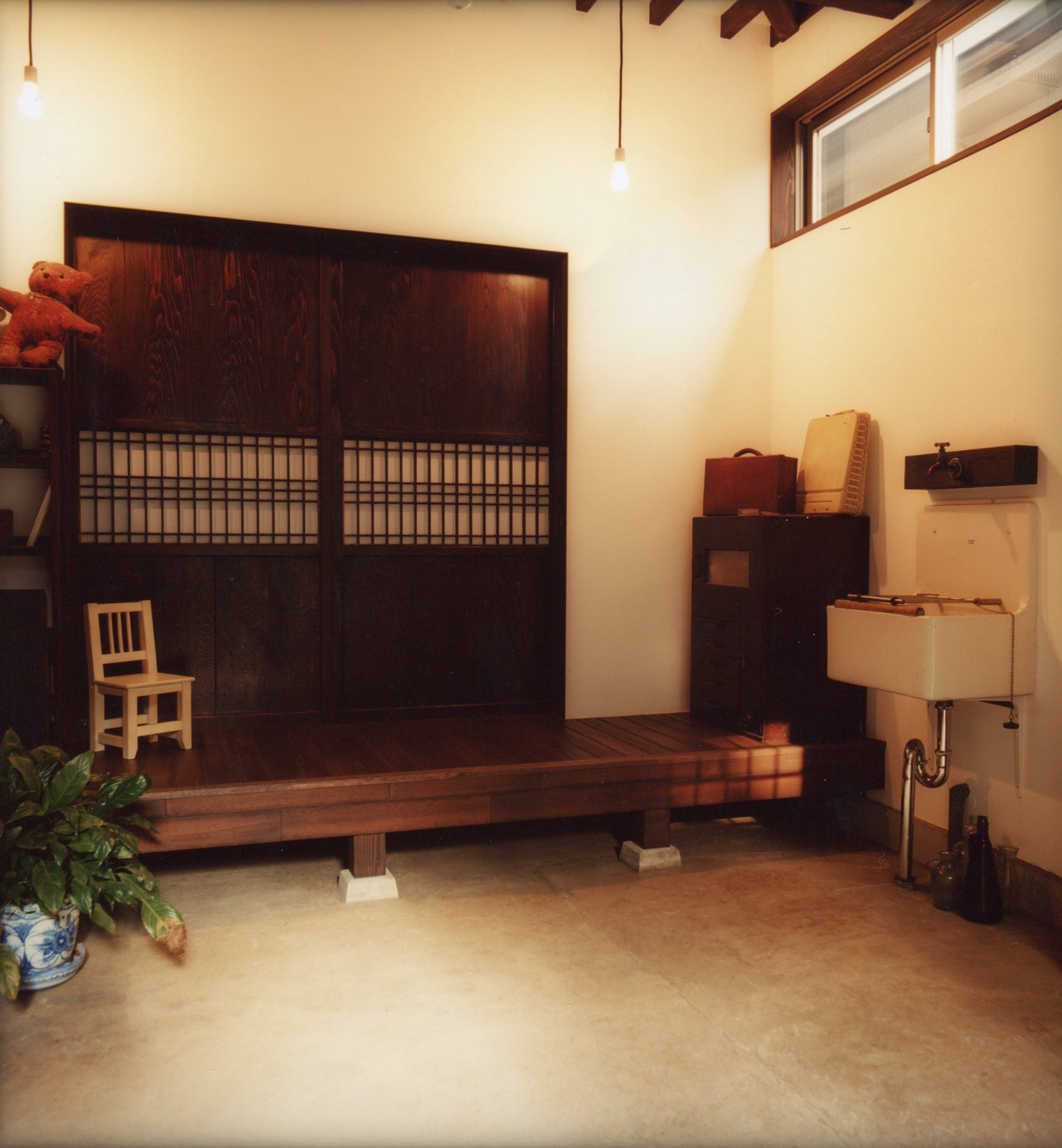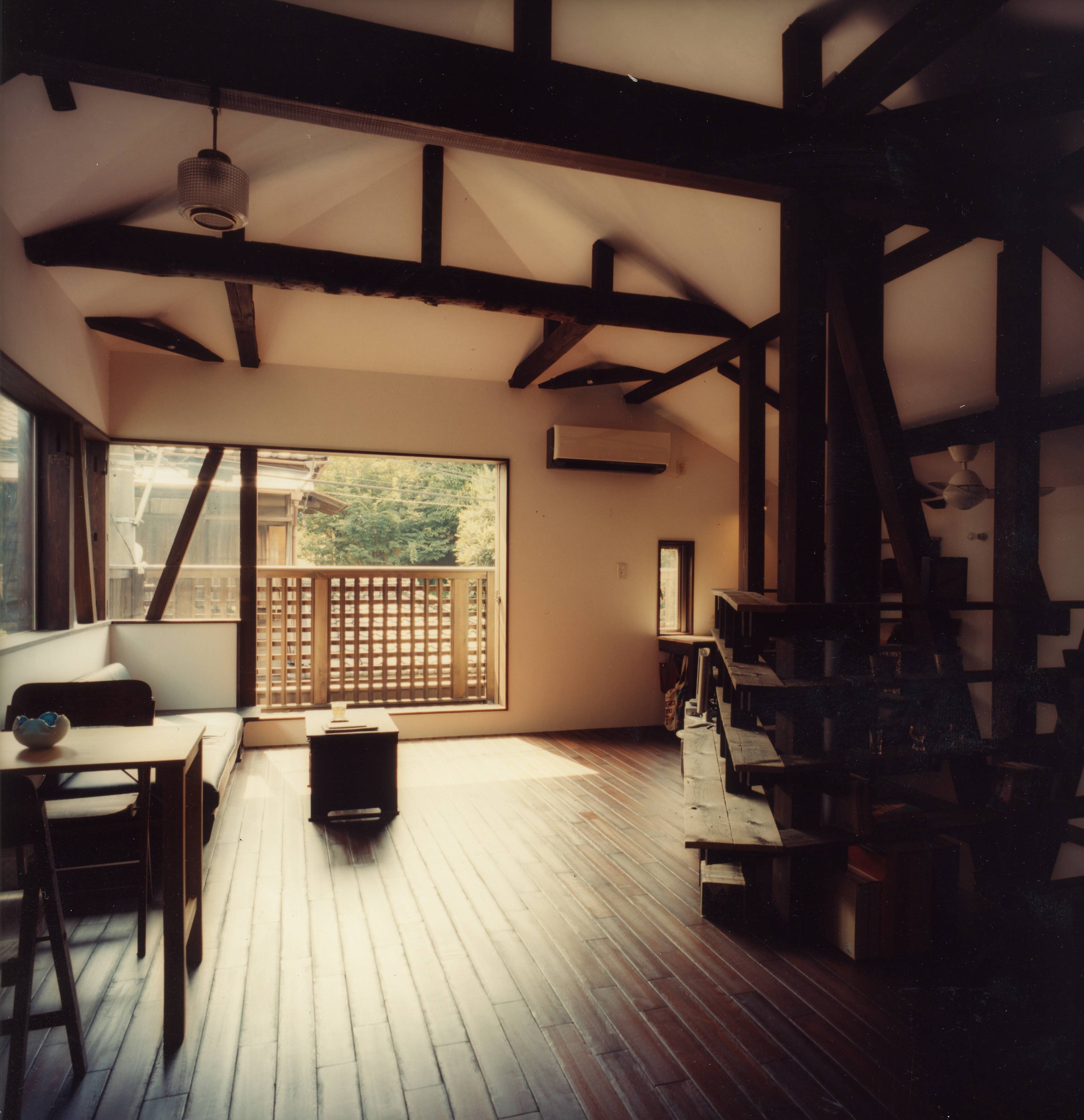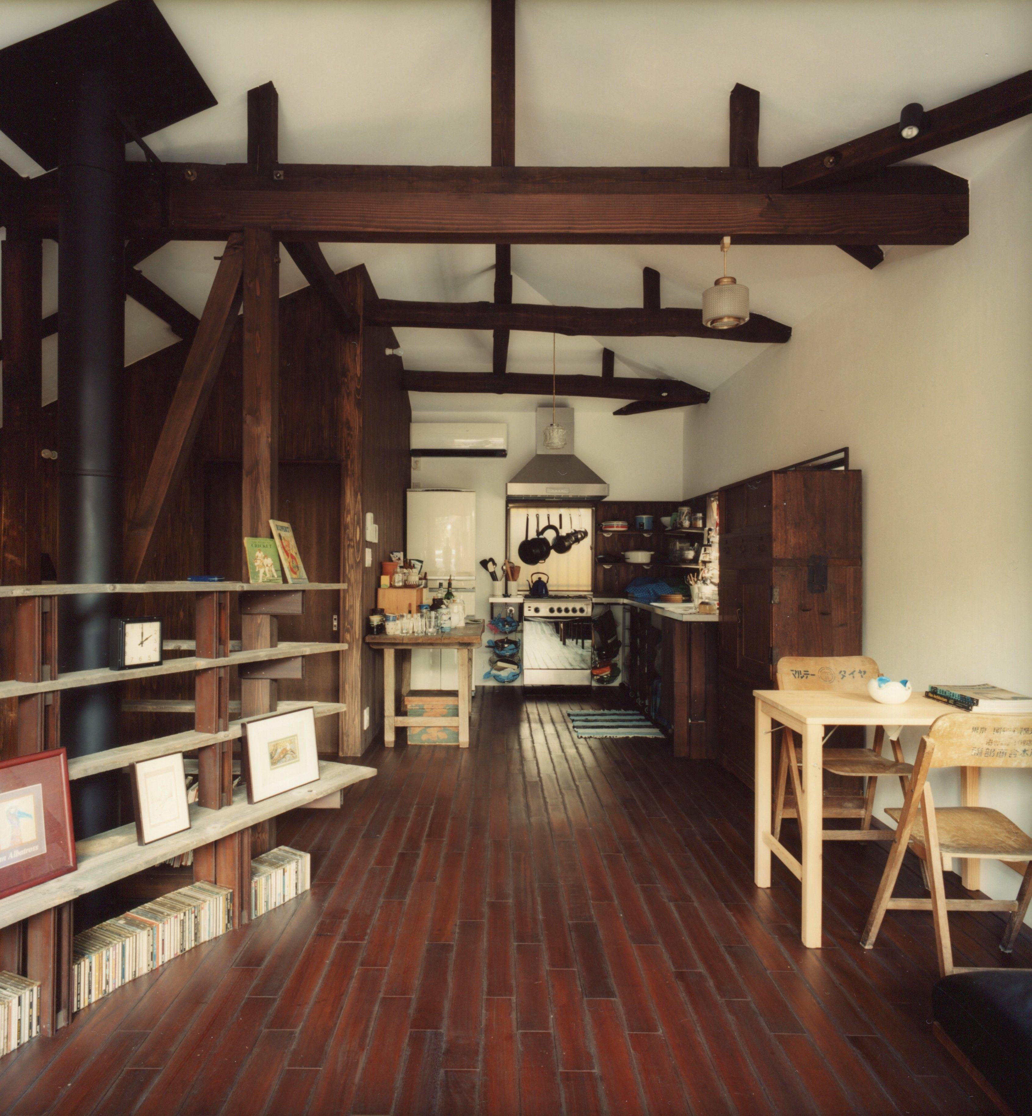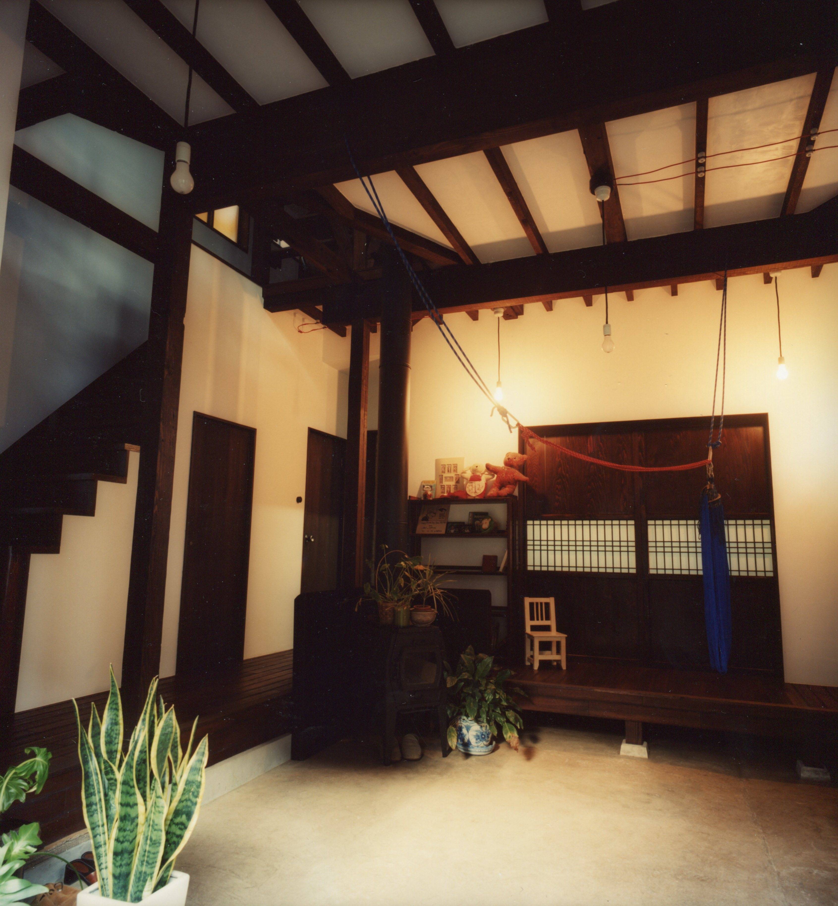 中央線の駅から徒歩10分ほどの住宅街、ケヤキの大木のある小道の奥、昭和の中古住宅をリノベーション。隣家が迫る密集した住宅街で日当たりと通風と暖気を隅々までいきわたらせる工夫を凝らしました。建物をセットバックして生まれた小さな庭は、玄関へのアプローチを緑で彩ります。また広い玄関土間から眺めたときに、緑のスクリーンが道行く人の視線をさえぎり、落ち着きをあたえます。玄関土間には薪ストーブを設け、小さな吹き抜けを介して二階のLDKまで暖気をゆき渡らせます。ご夫妻の蒐集した古家具や古材を家のそこここに配置し、ホッと心和む住まいになりました。