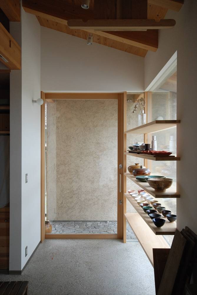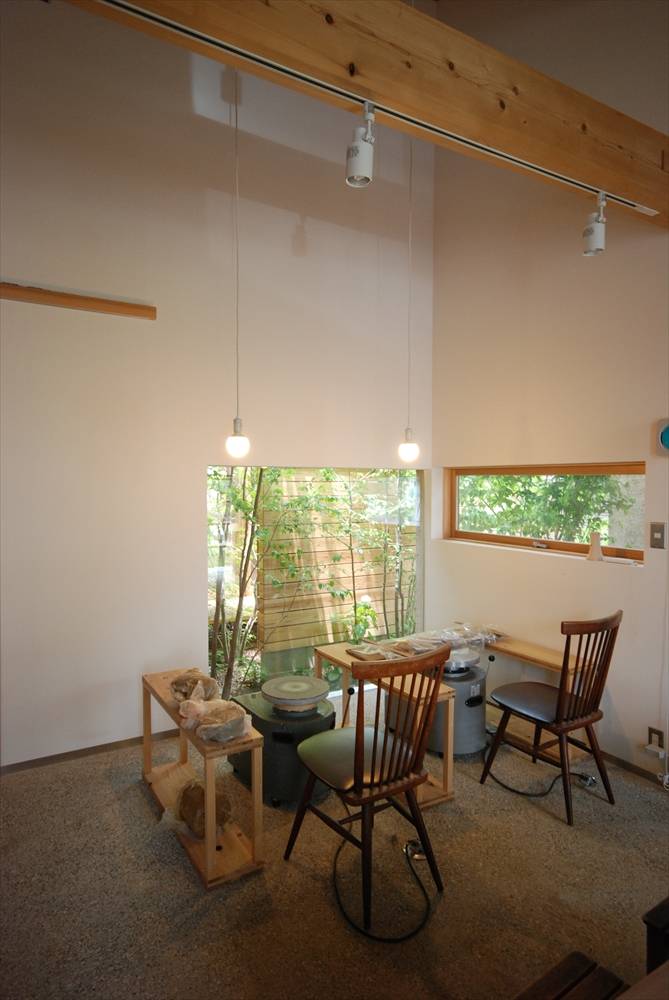 道路側には奥様からの要望であった「陶芸教室」を行える店舗スペースを設け街に開いています。店舗部分のアプローチと共用となる路地を通って、中庭から玄関へのアクセスとなります。
