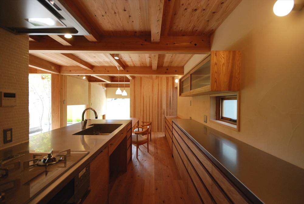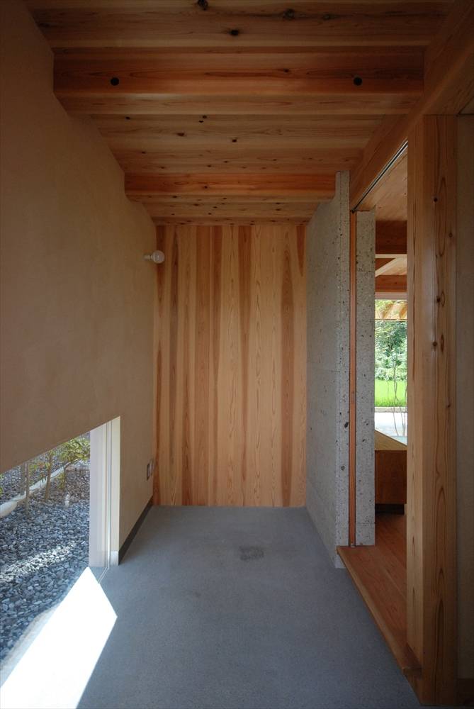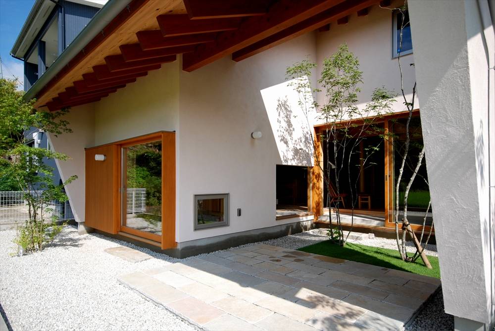 「柿碕の家」も長い竿部分(およそ30m)に来客用もあわせて車3台分の駐車スペースを確保し、あとはアプローチとして整備することで魅力ある敷地の奥行き感をだしている。