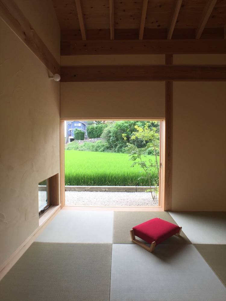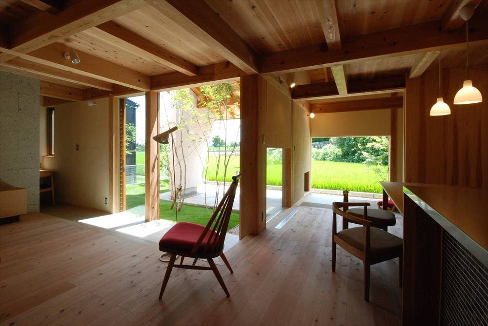 建物は大屋根の架かった中庭を持つセミコートハウス。敷地南側隣地が田園なので視界が開けていてとても気持ちがいい。この田園が初夏の代掻きから田植え、青々と茂る稲、飛び回る燕たち、そして一面黄金色に染まる稲穂、と一年を通してこれぞ日本の景色と言わんばかりの物語を演出してくれる。