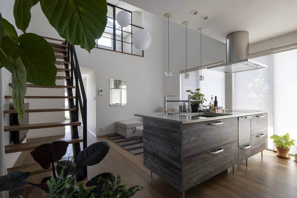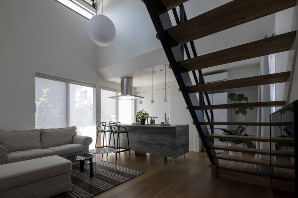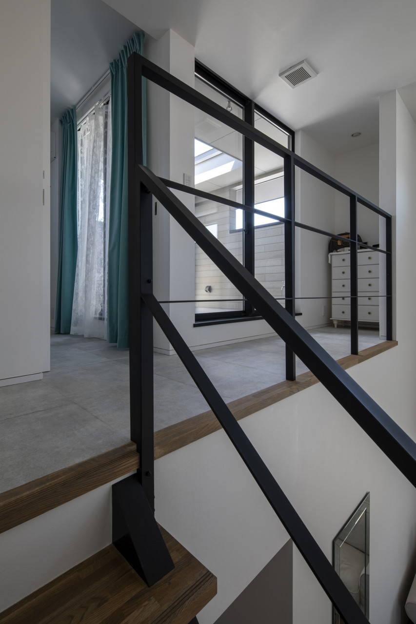 外観は比較的閉鎖的な変形門型に対し、室内は吹抜けを大きく取り大きな明るい空間を実現している。