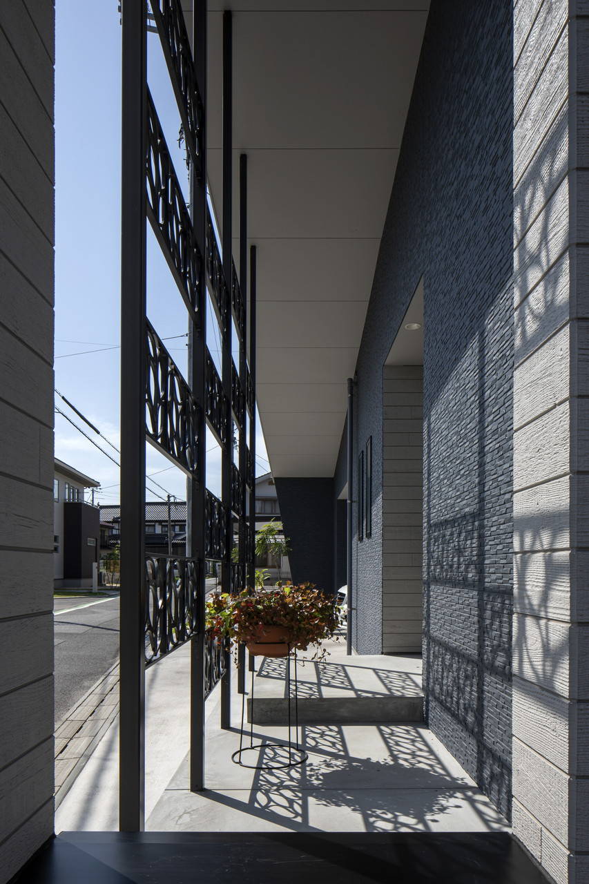 比較的交通量の多い道路に面したポーチ前にはロートアイアンを配し緩やかに区切るとともに安全性